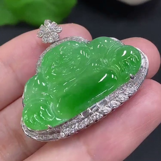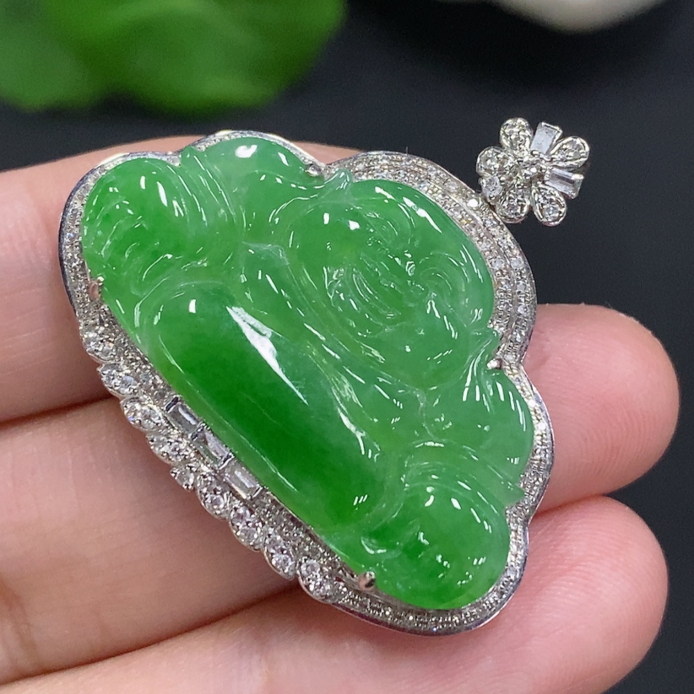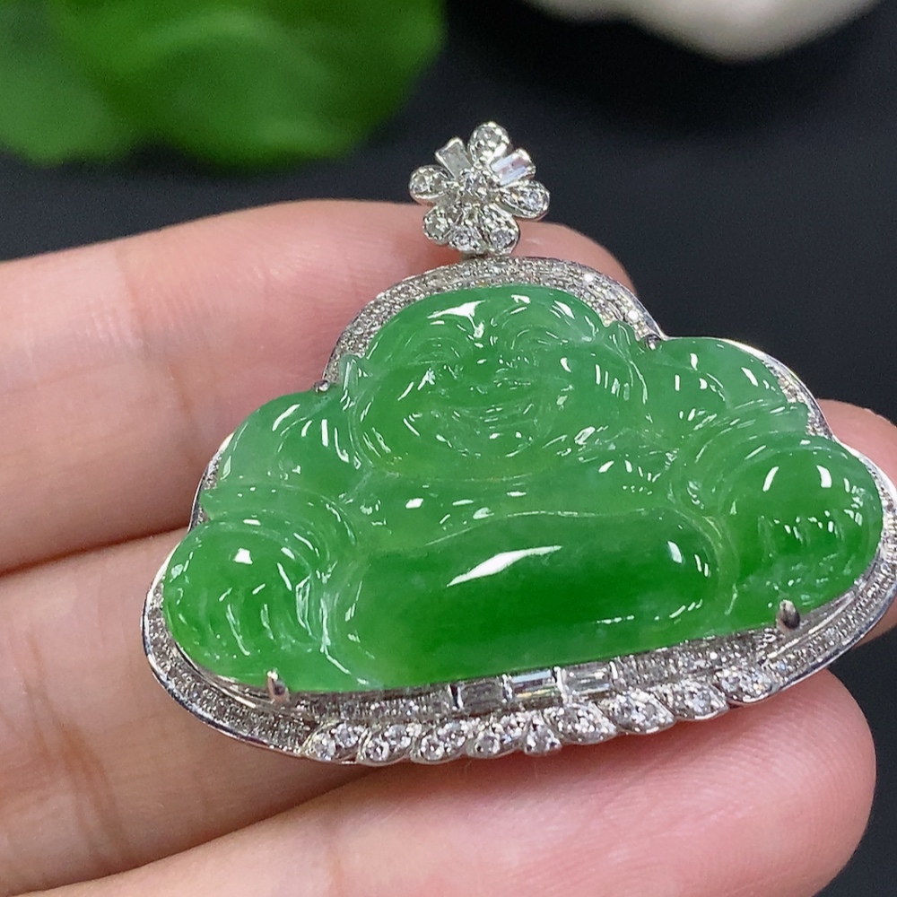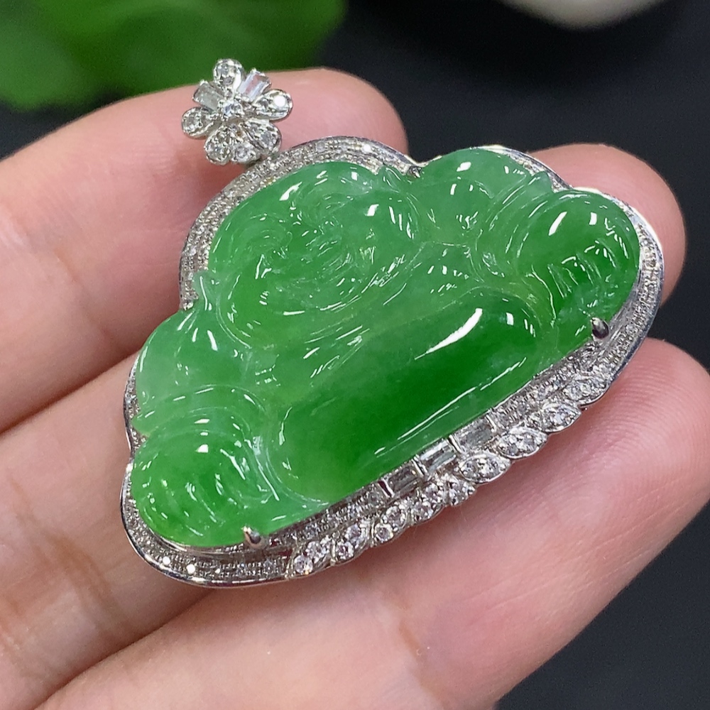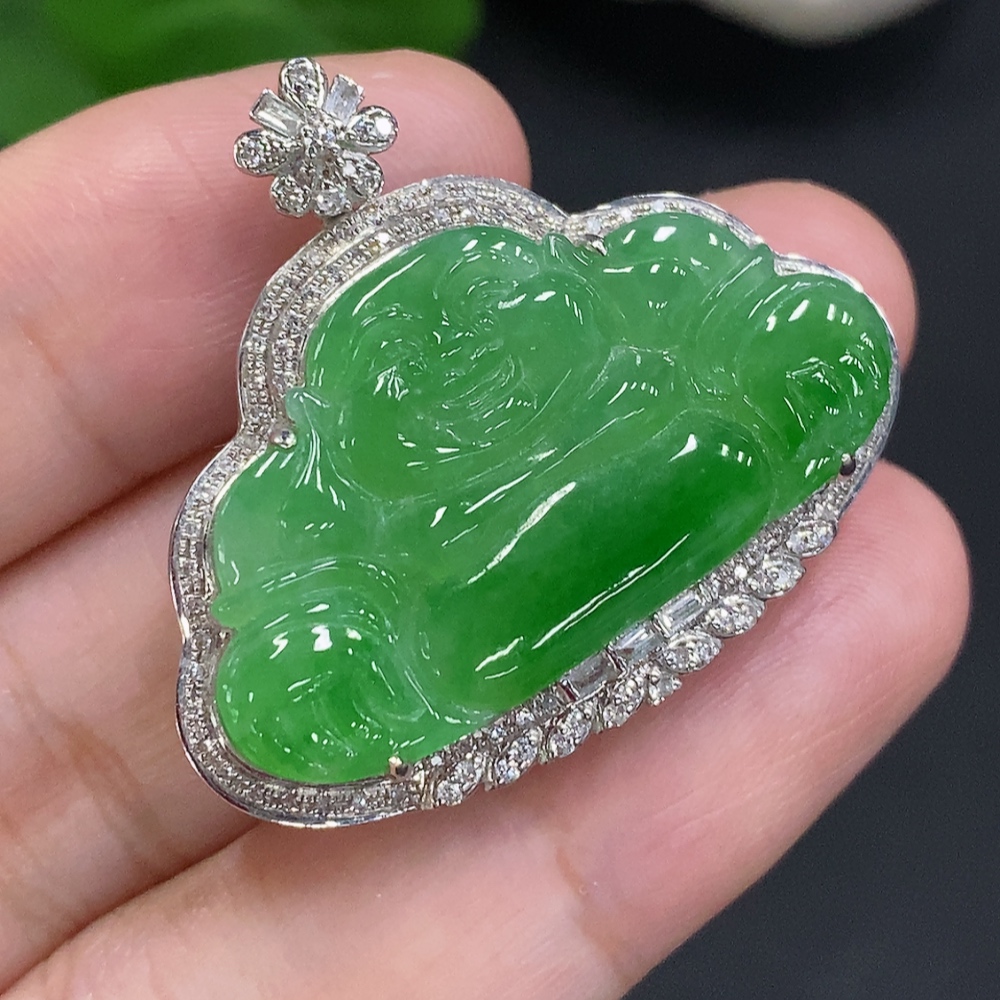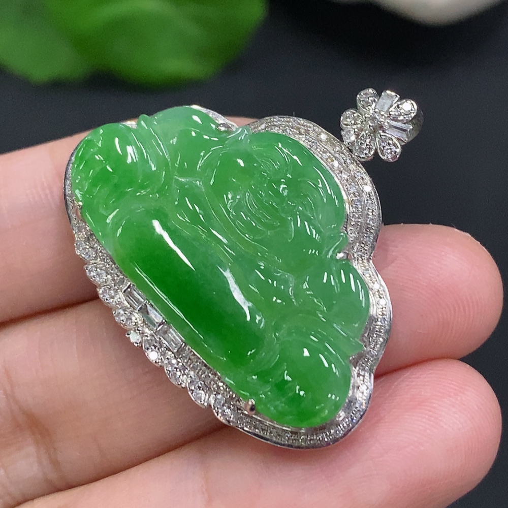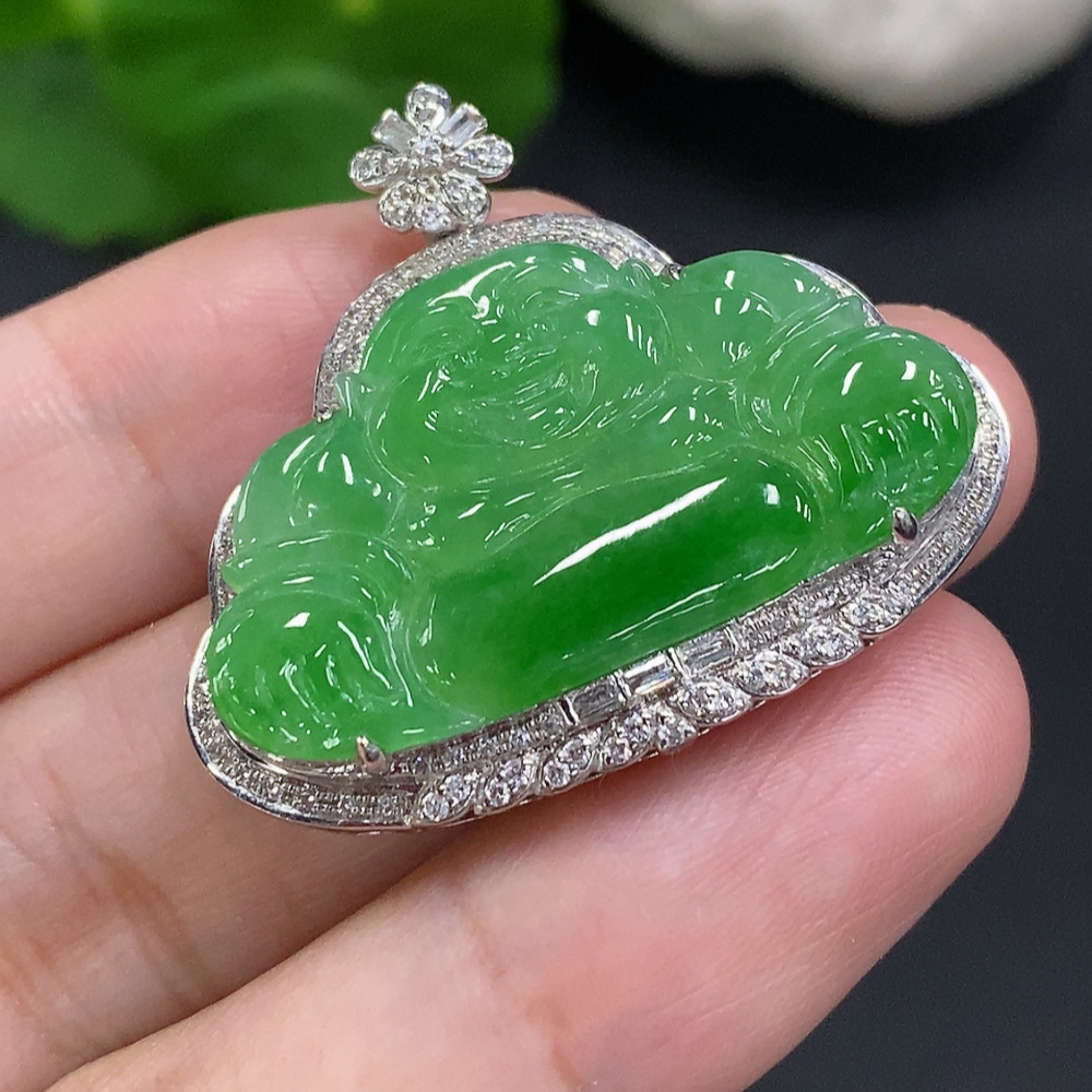 Jadeite Buddha Pendant with 18K Gold Mount, Total Weight Approx. 6.2g (Diamond Accented)