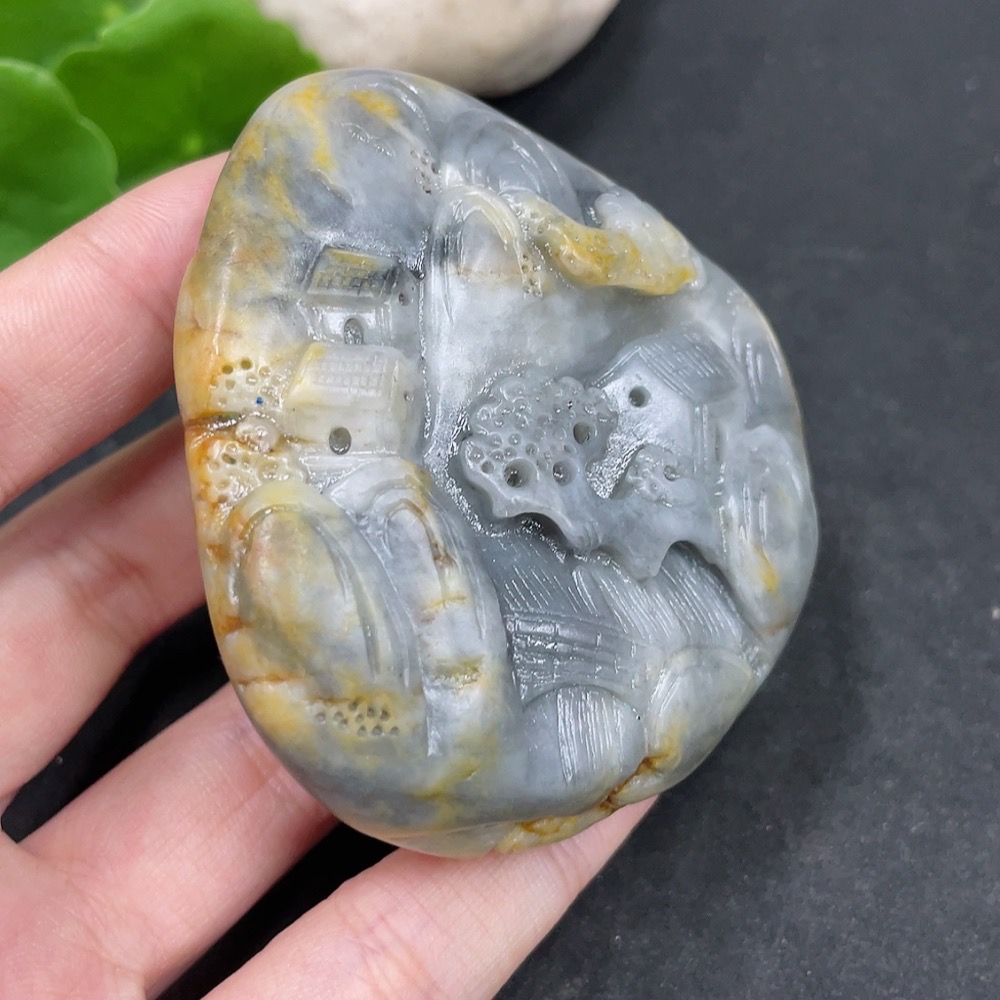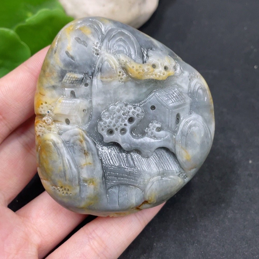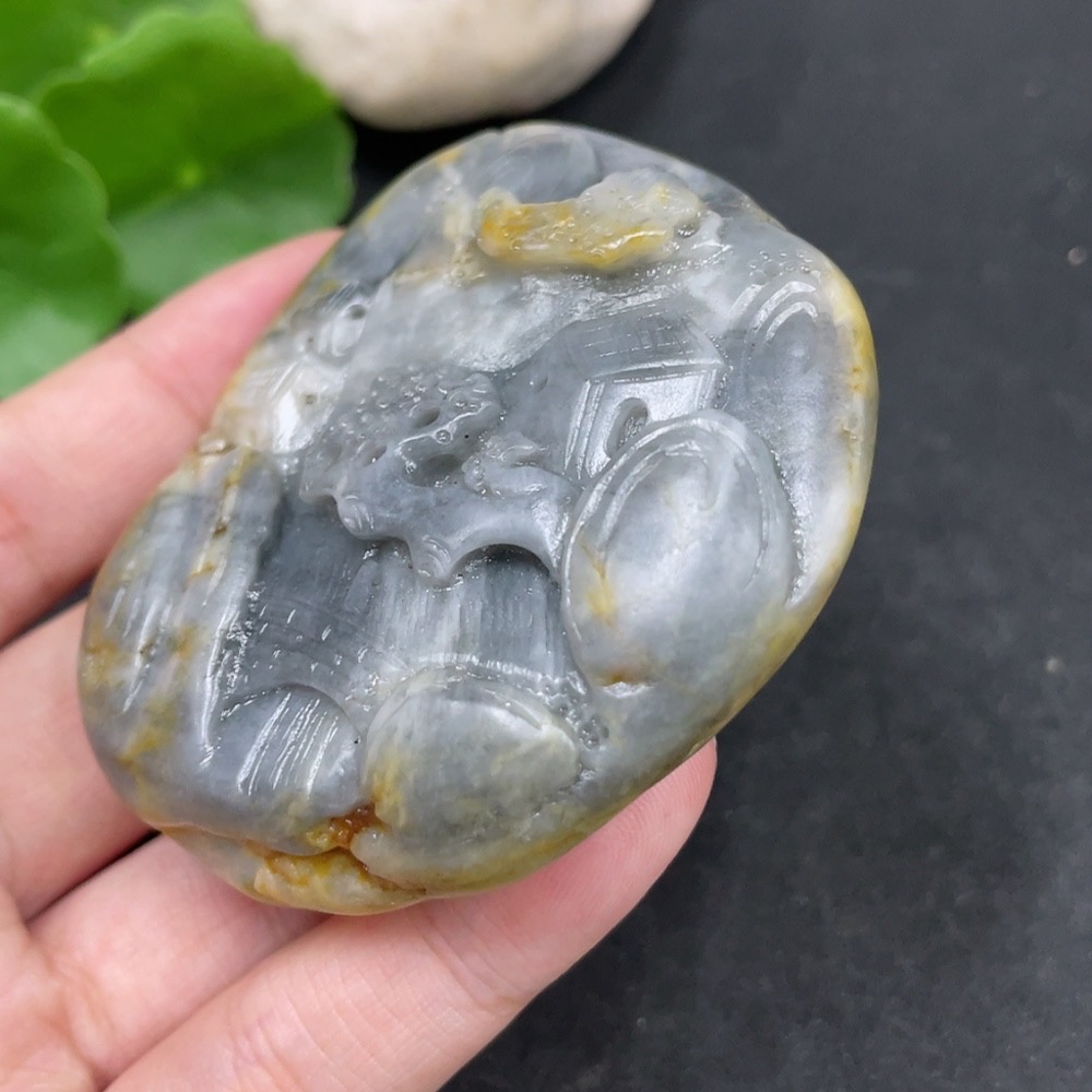 Hetian Jade Handheld Carving - Landscape, Undetermined Skin Color Origin, Contains Other Mineral Components, Total Weight Approximately 131.3g