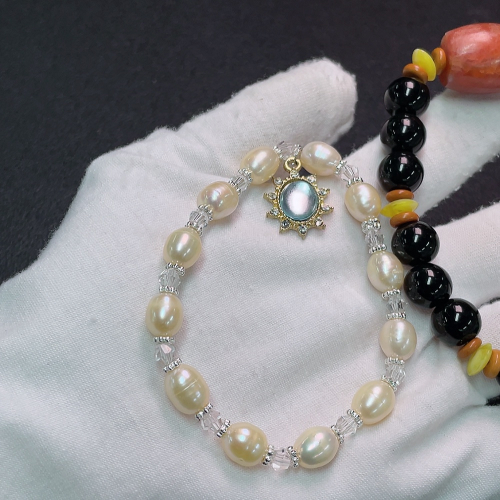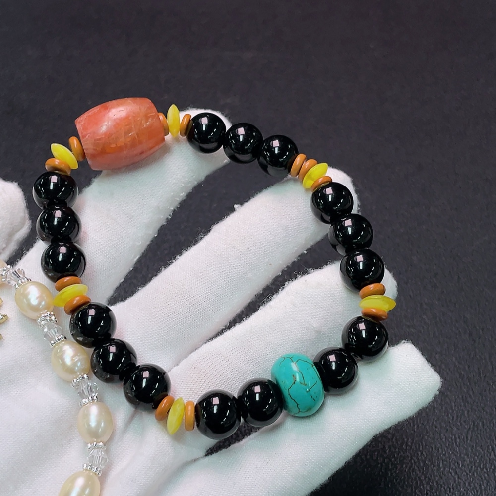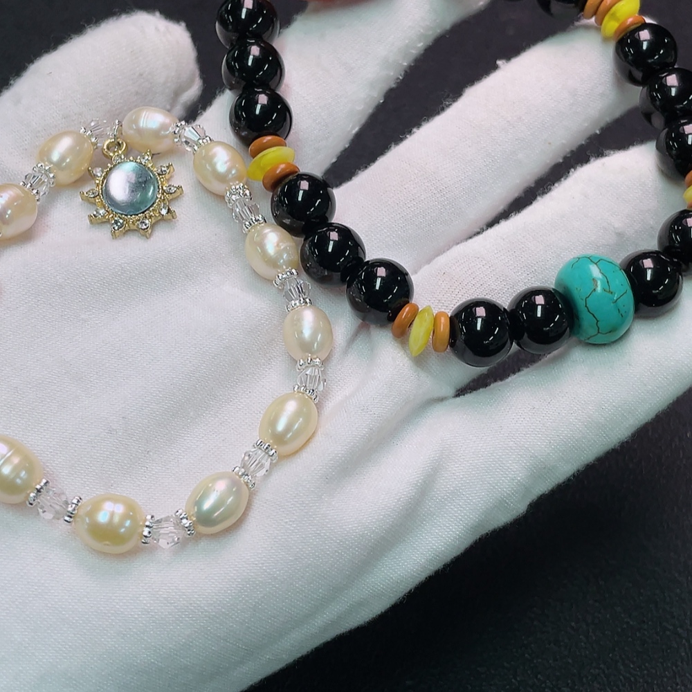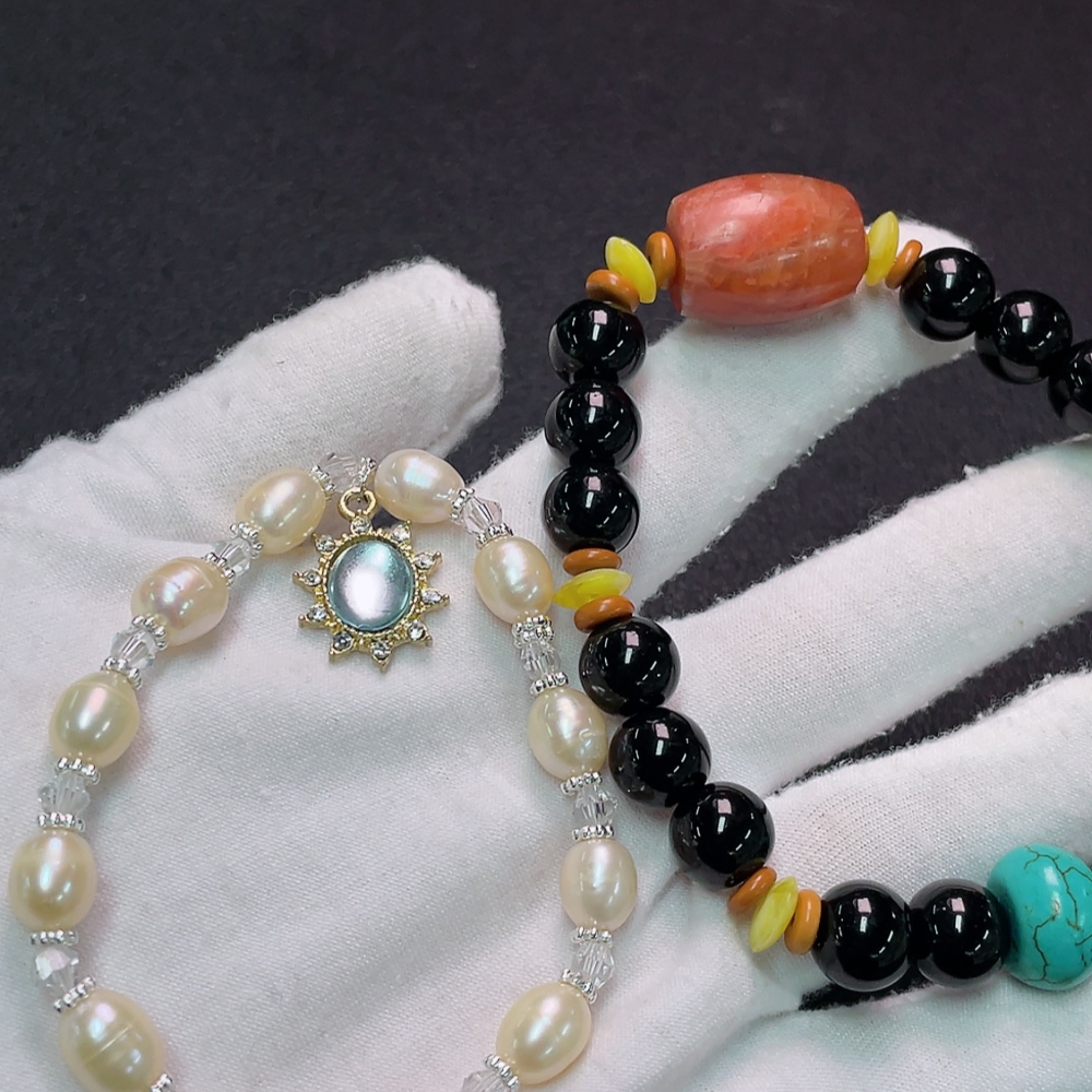 Pearl Bracelet with Non-Natural Gemstones + Red Agate Bracelet with Non-Natural Gemstones, Visible Organic Matter, Non-Gold, Total Weight Approx. 48.05g, Sell as a Lot
