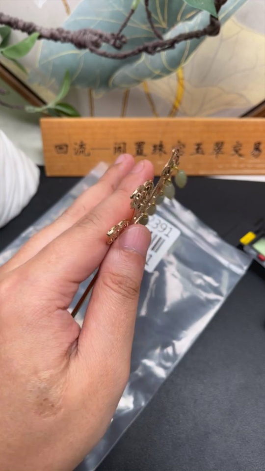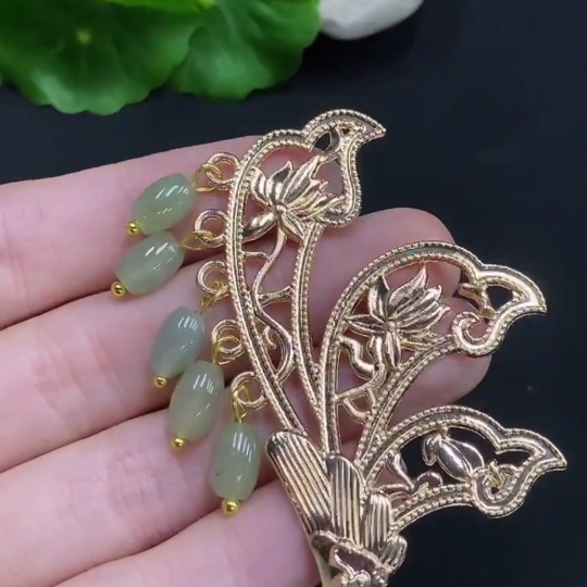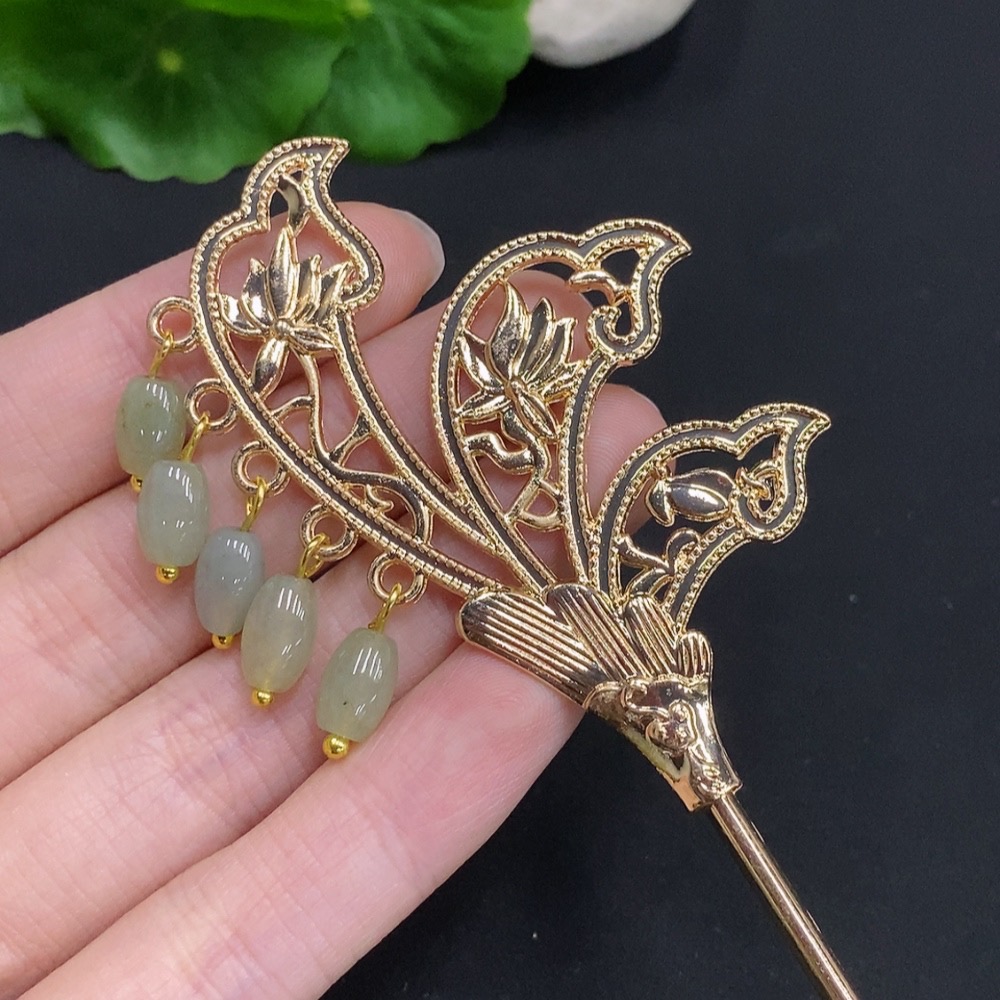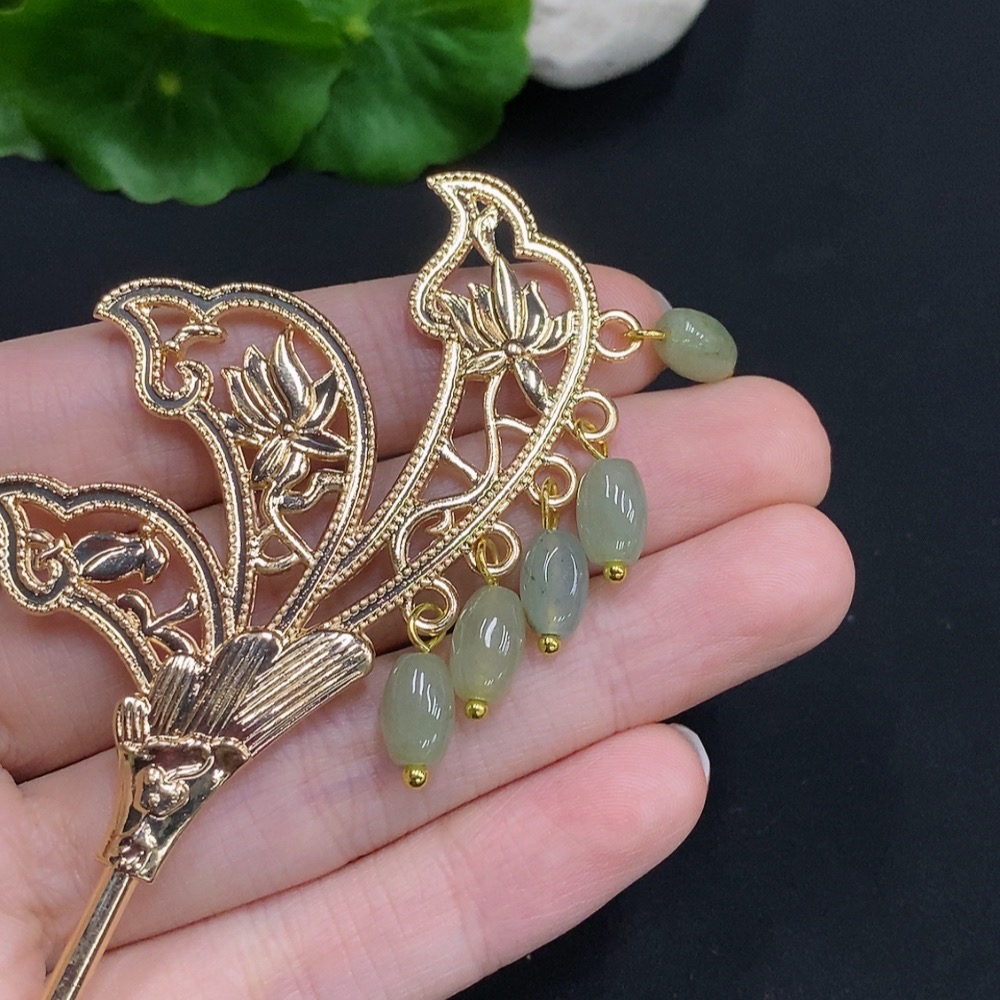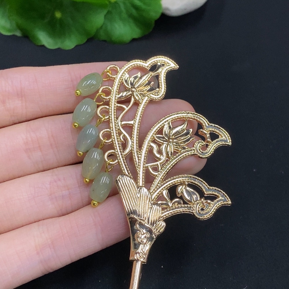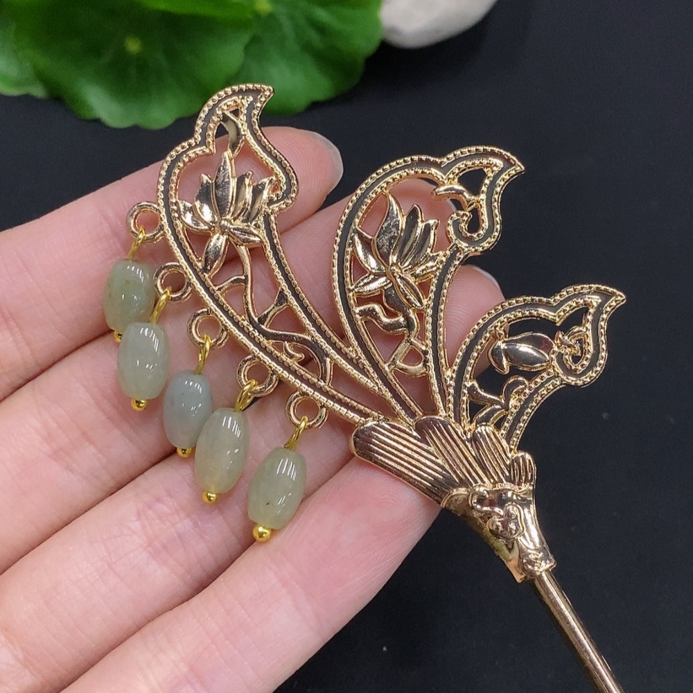 Jadeite Barrel Bead Inlaid Hairpin Non-Gold Inlaid Total Weight Approx. 15.7g