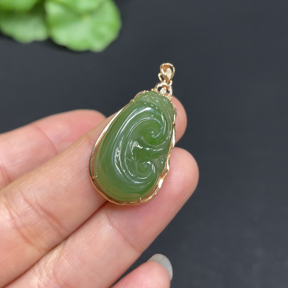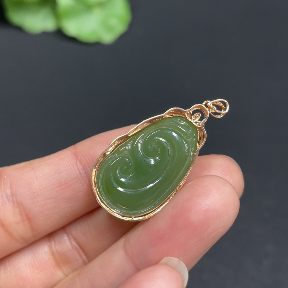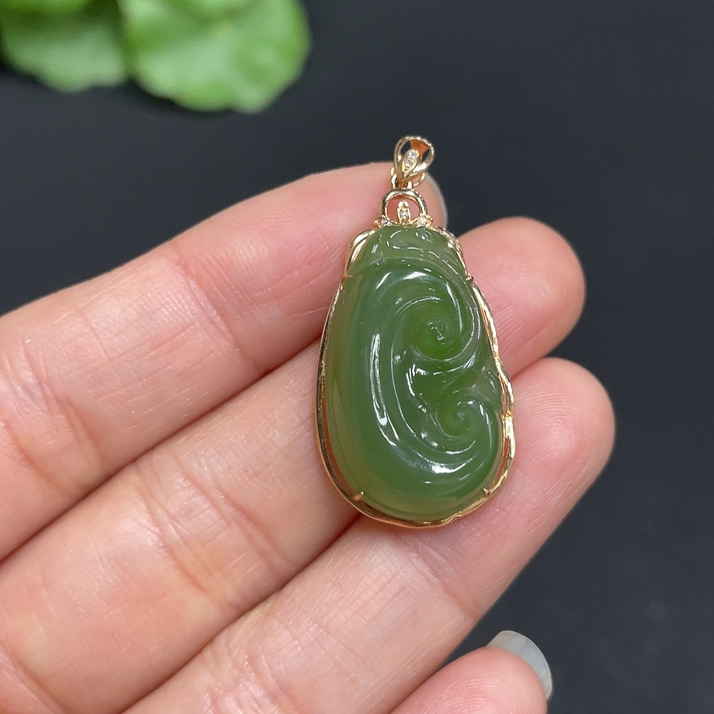 Hetian Jade Jasper Inlaid with Ruyi Design 18K Gold, Total Weight Approx. 3.5g, Accented with Diamonds