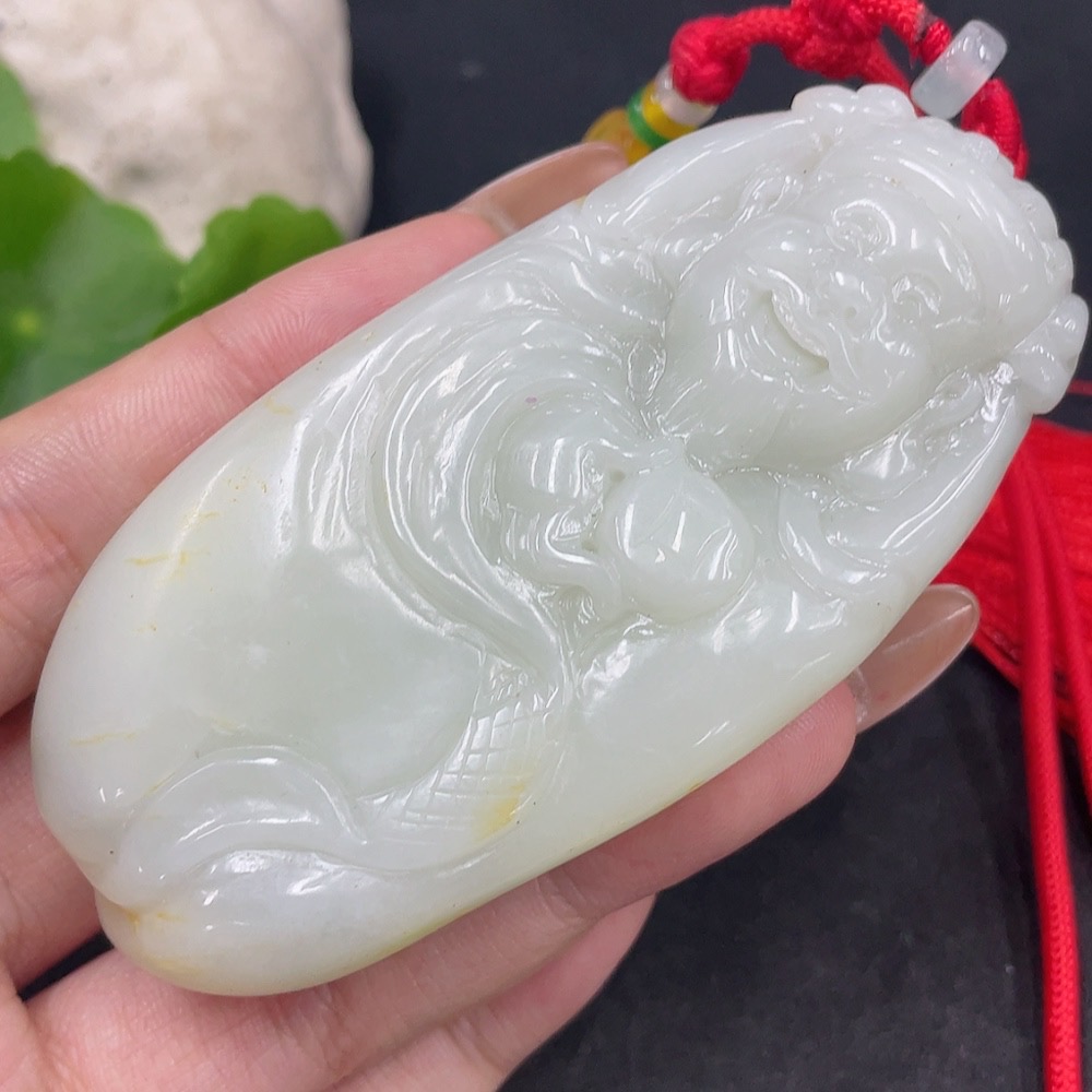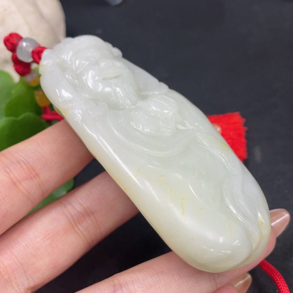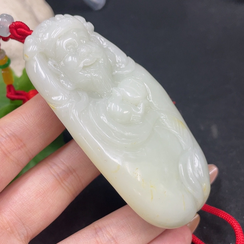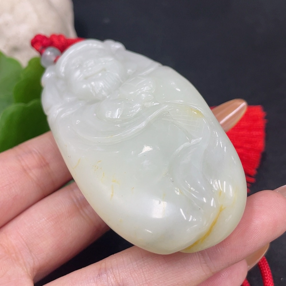 Hetian Jade Handheld Piece - God of Wealth - Contains Other Mineral Components - Undetermined Skin Color Origin - Total Weight (Including Rope) Approx. 125.4g
