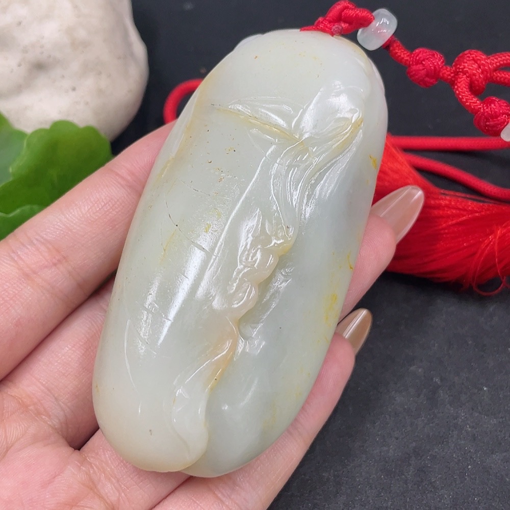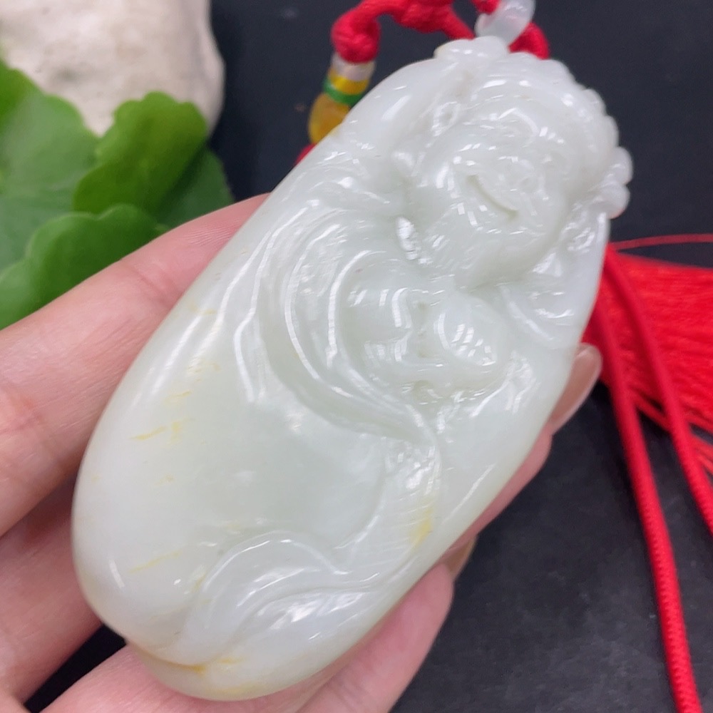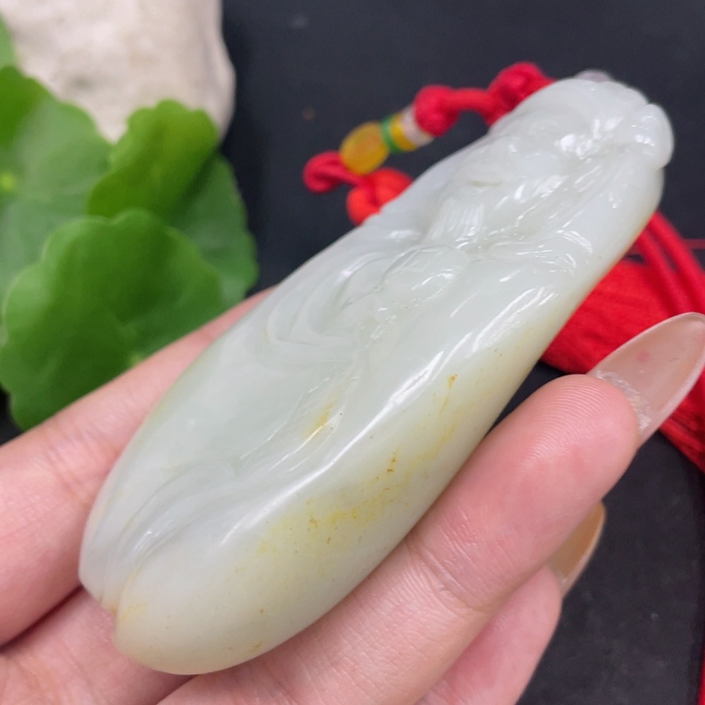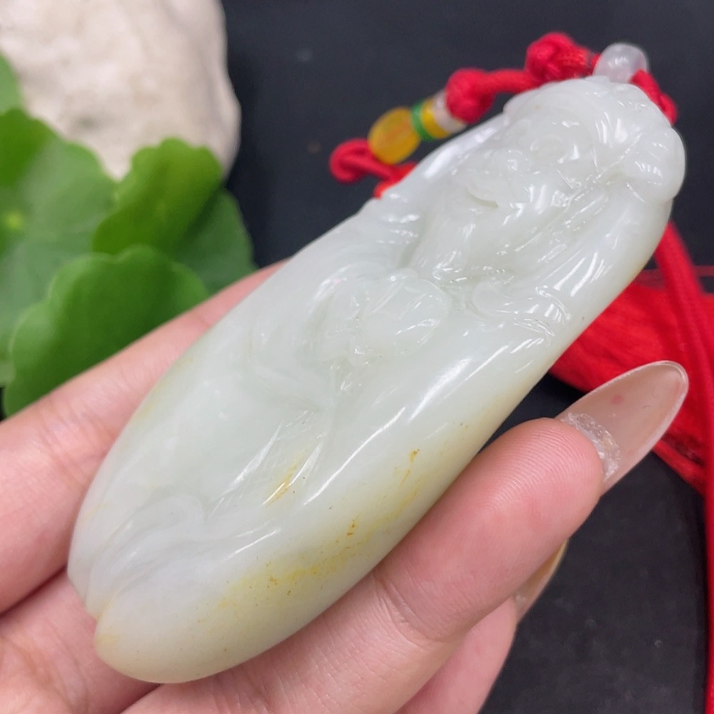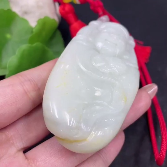 Hetian Jade Handheld Piece - God of Wealth - Contains Other Mineral Components - Undetermined Skin Color Origin - Total Weight (Including Rope) Approx. 125.4g