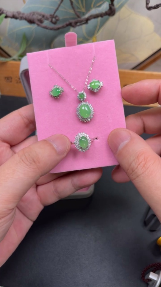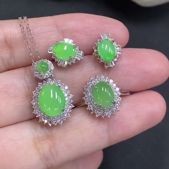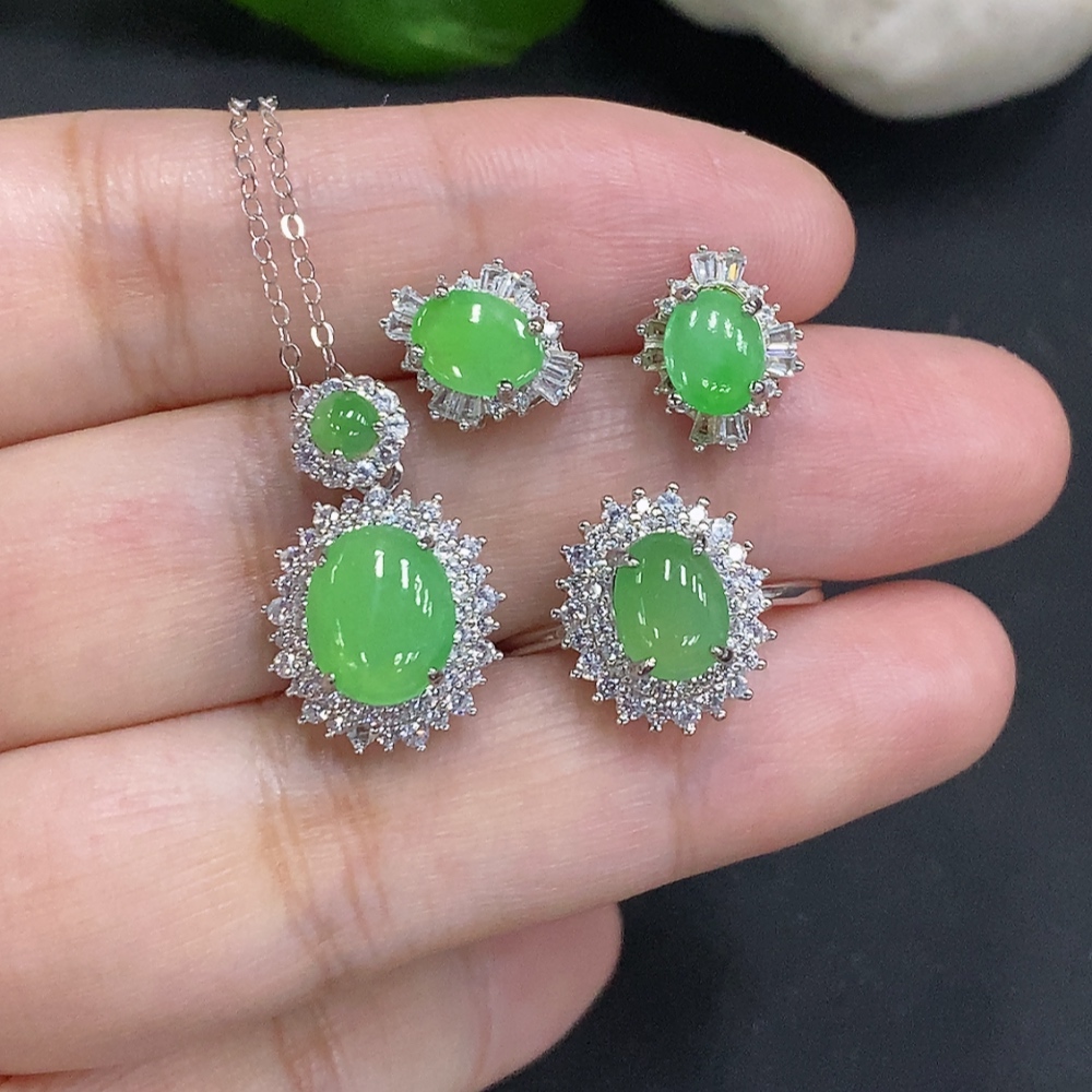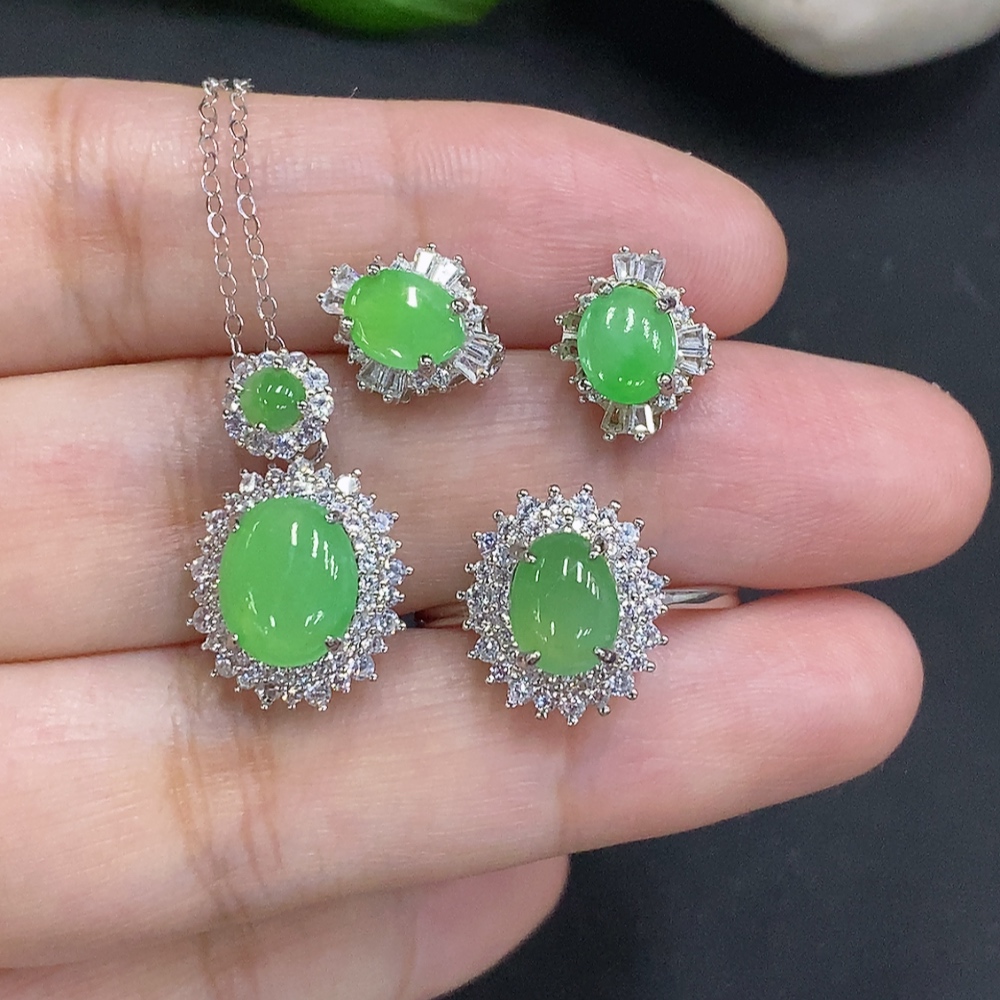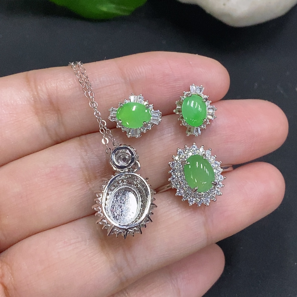 Jadeite Cabochon Pendant with Ring and Earrings Set Sell as a Lot Adjustable Size Non-Gold Setting