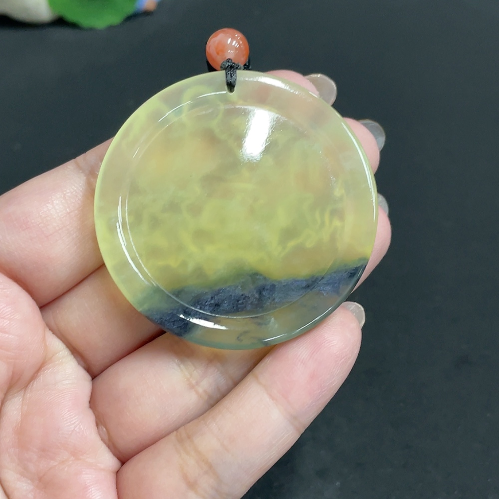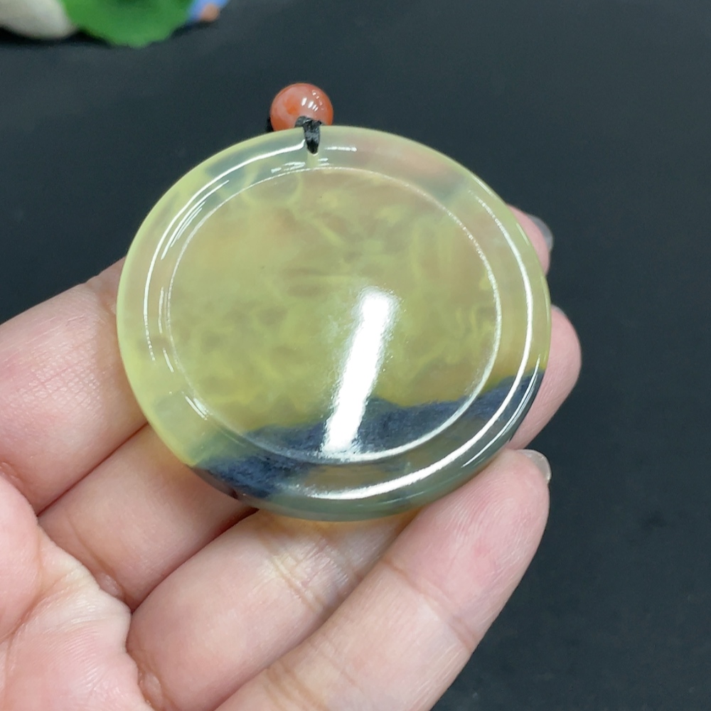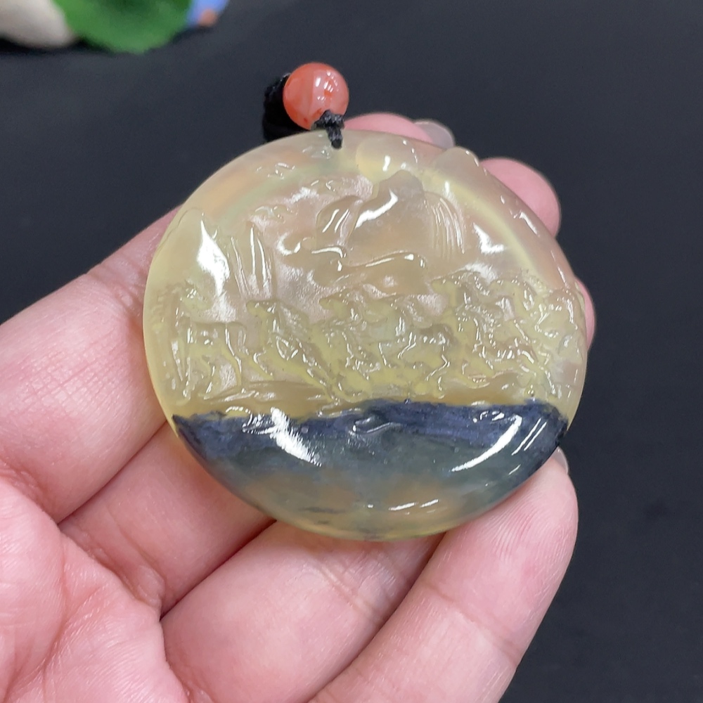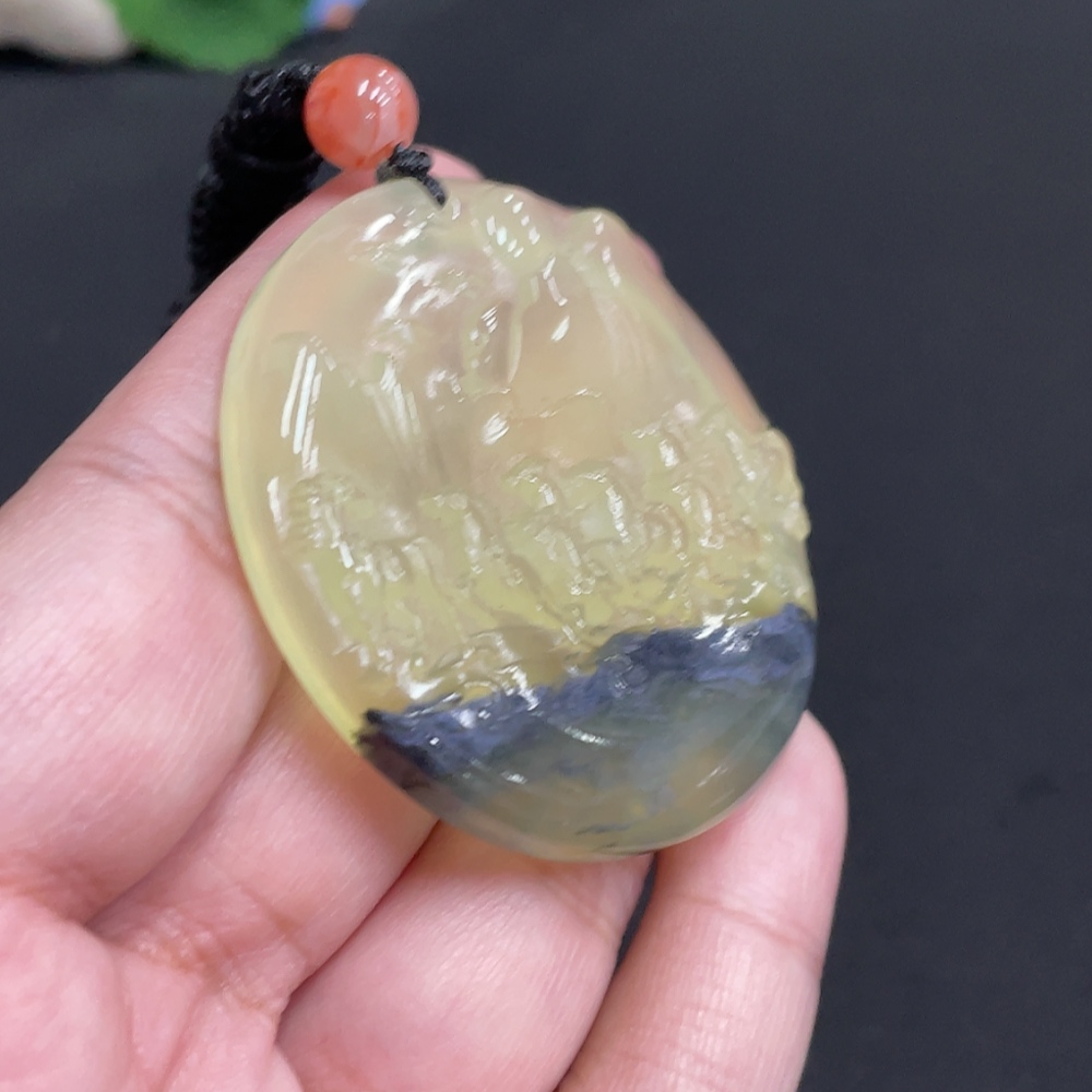 Xiuyu (serpentine jade) pendant with landscape design, non-Xiuyu bead included, total weight approx. 32.6g (including cord)