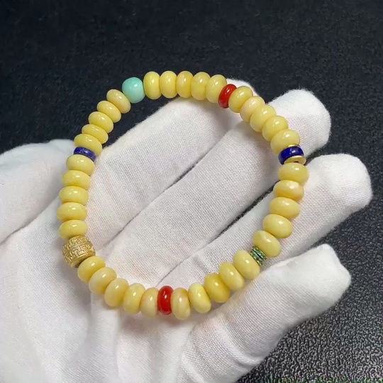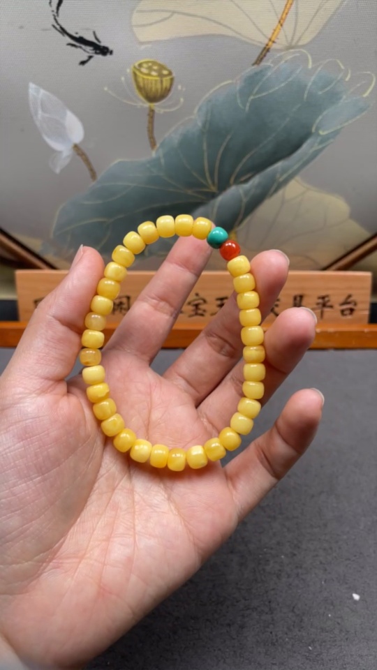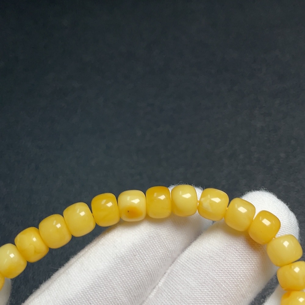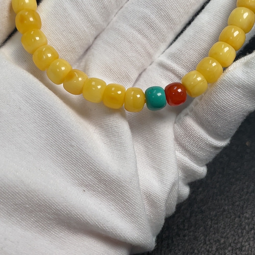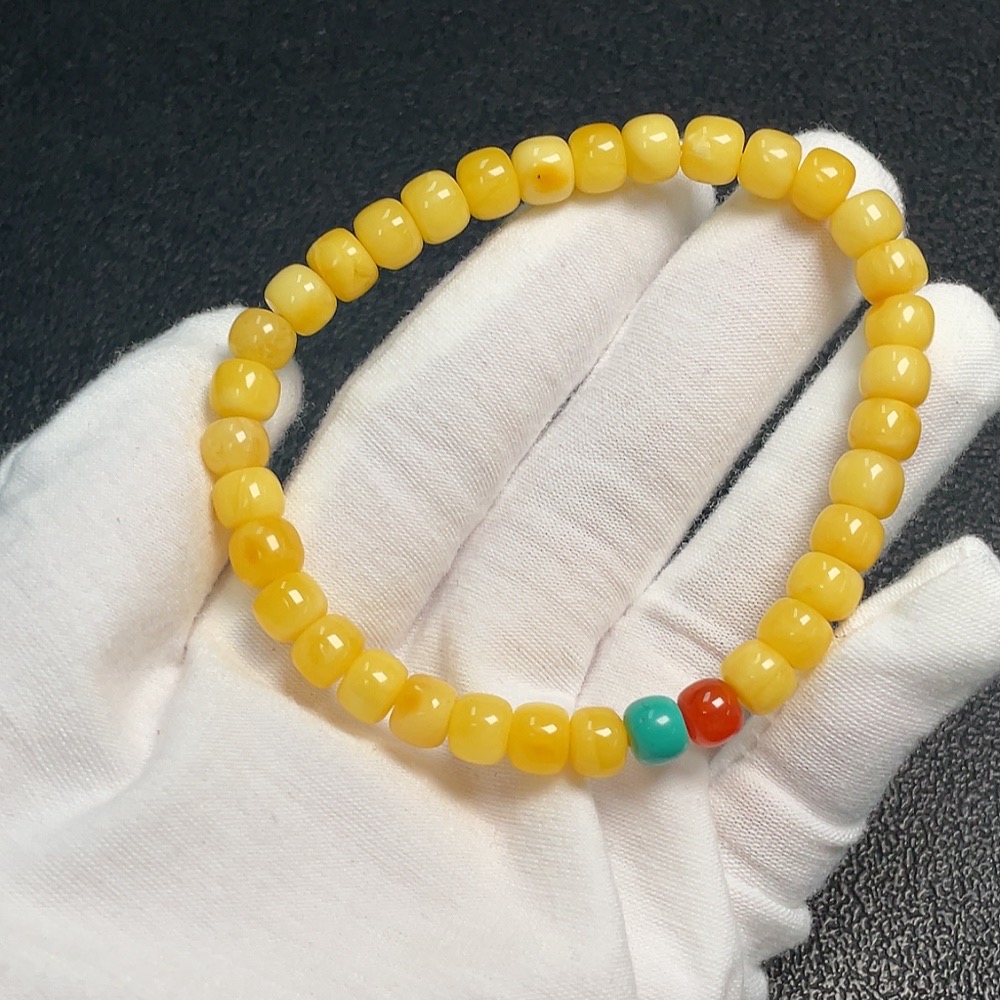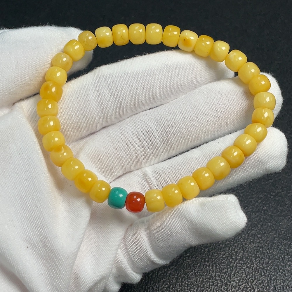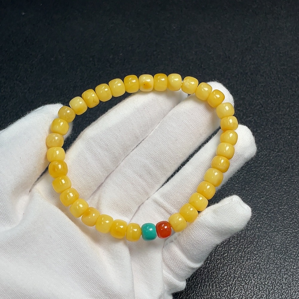 Amber Beeswax Bracelet with Southern Red Agate, Partial Repairs Visible, Possible Non-Natural Accent Stones, Total Weight Approx. 7.8g, Size Around 7.1mm