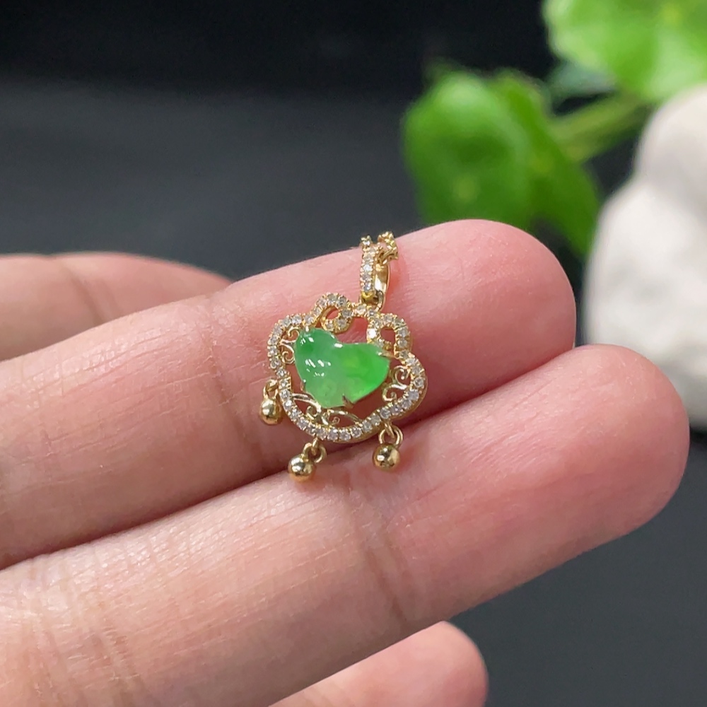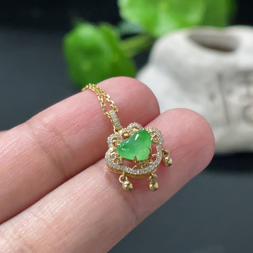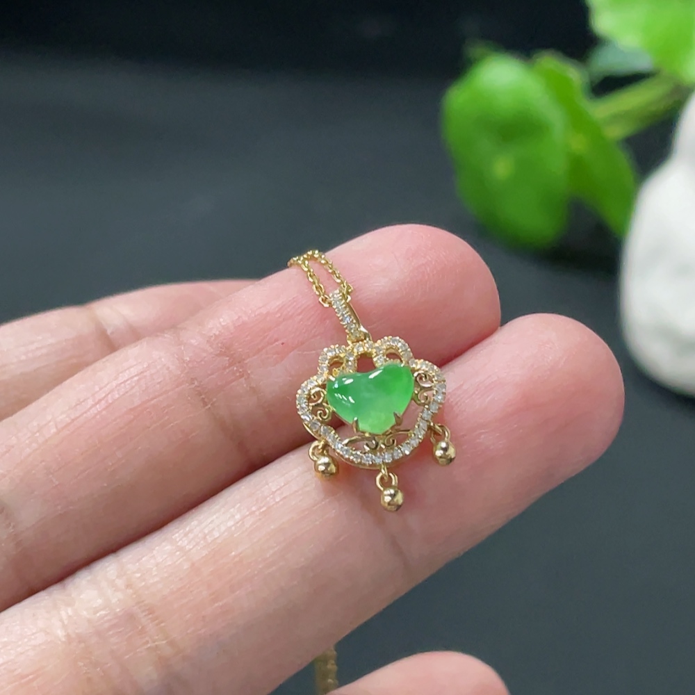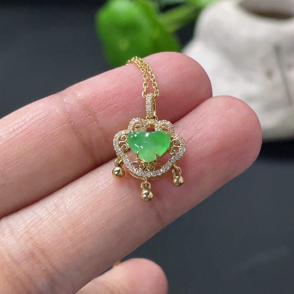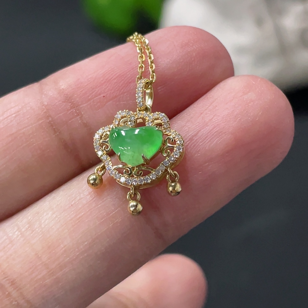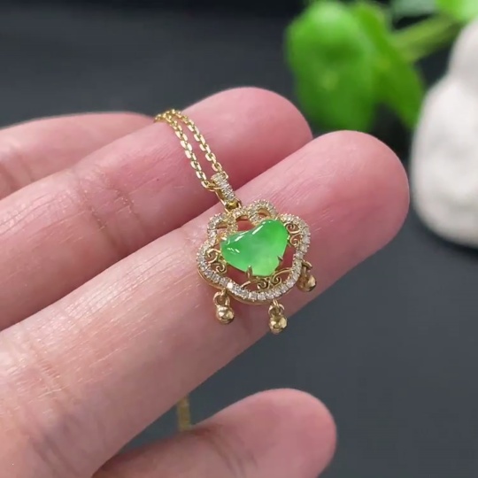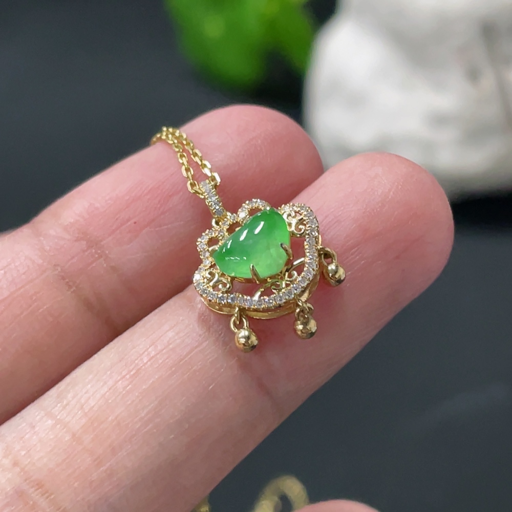 Jadeite Cabochon Pendant with 18K Gold Body and Chain, Accented with Diamonds, Total Weight Approximately 2.8g