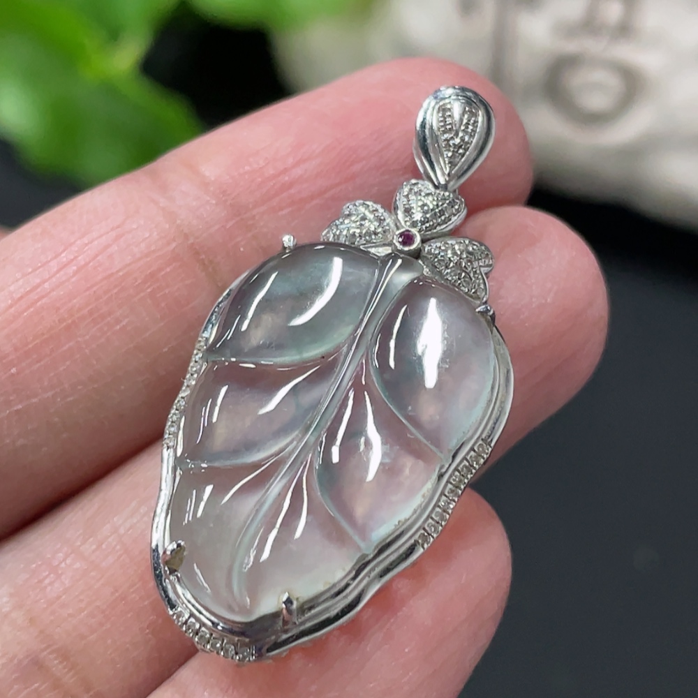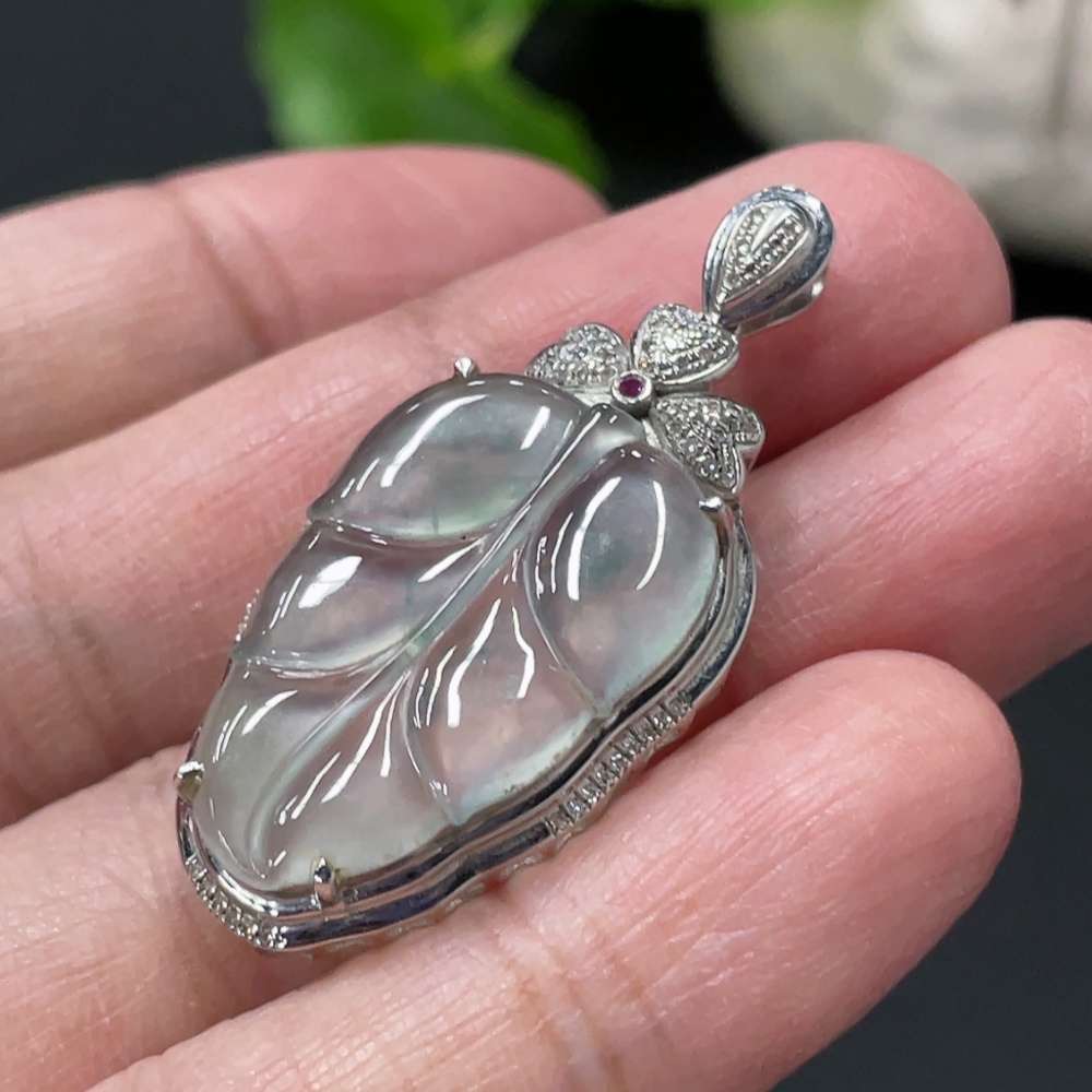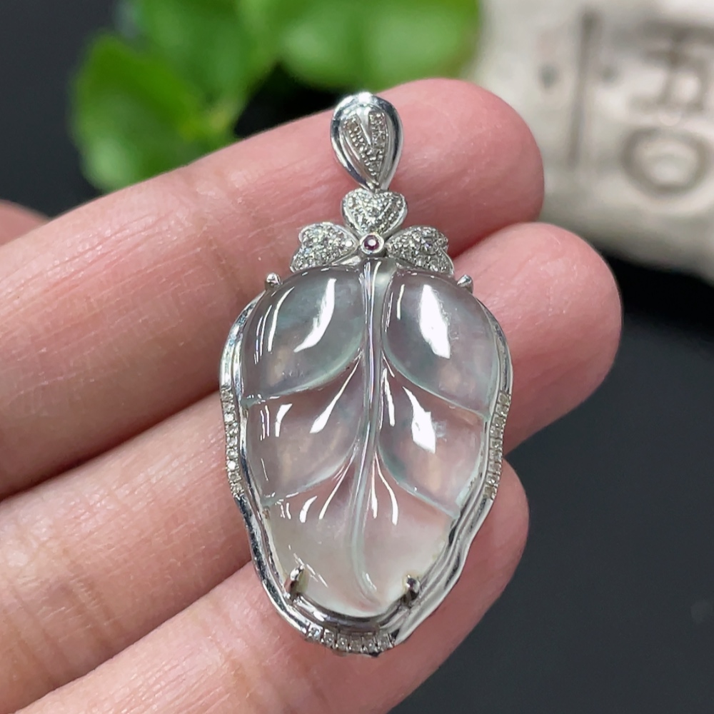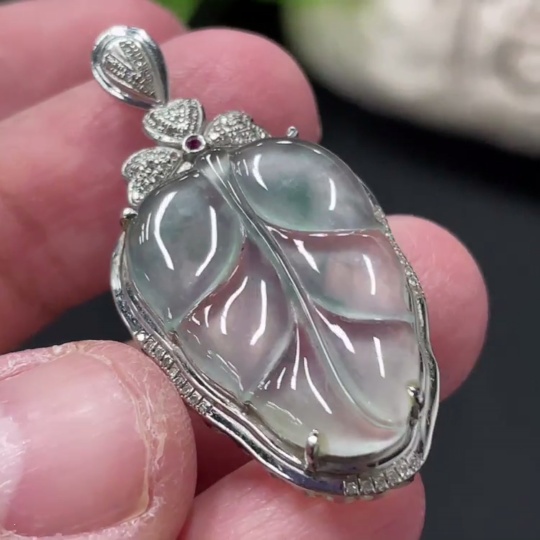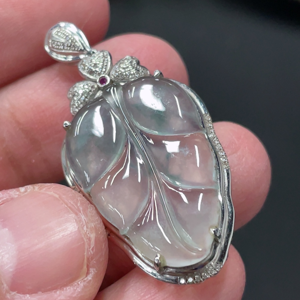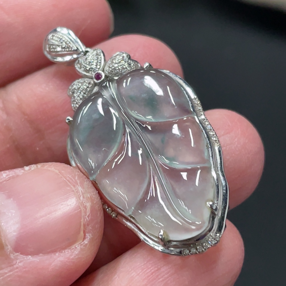 Jadeite Leaf Inlay Pendant 18K Gold Inlay Total Weight Approx. 3.8g with Diamond Accents (Colorless)