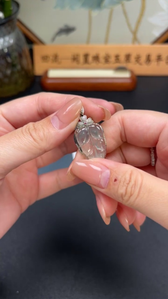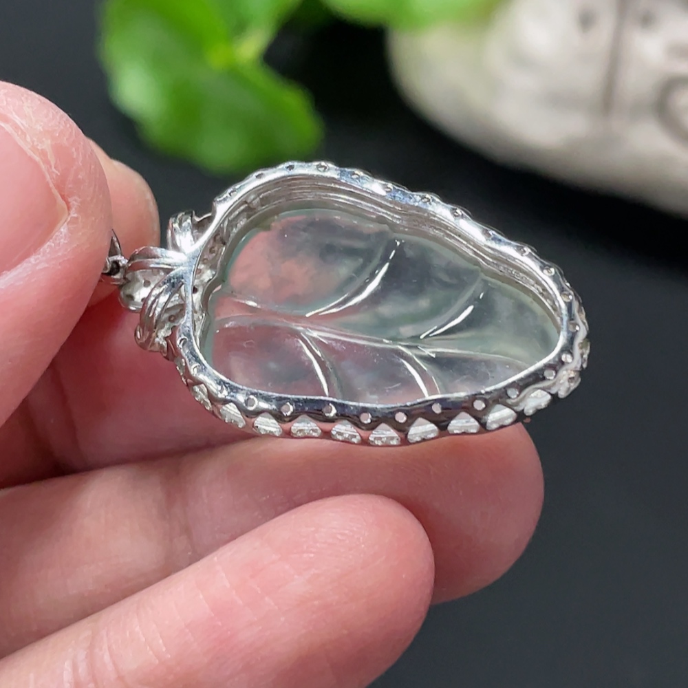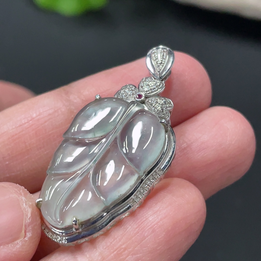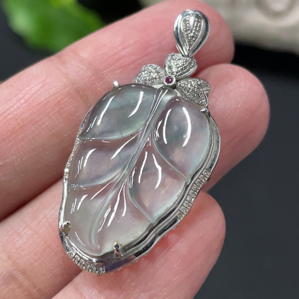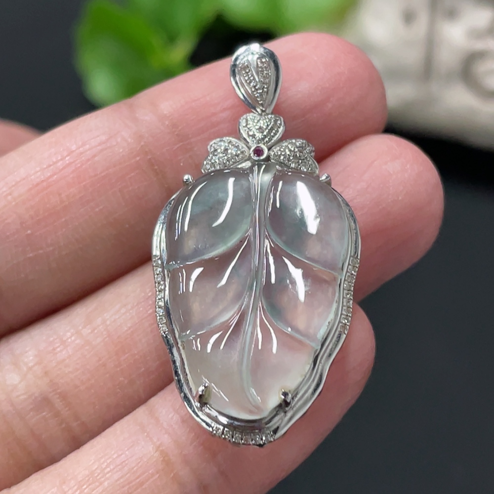 Jadeite Leaf Inlay Pendant 18K Gold Inlay Total Weight Approx. 3.8g with Diamond Accents (Colorless)