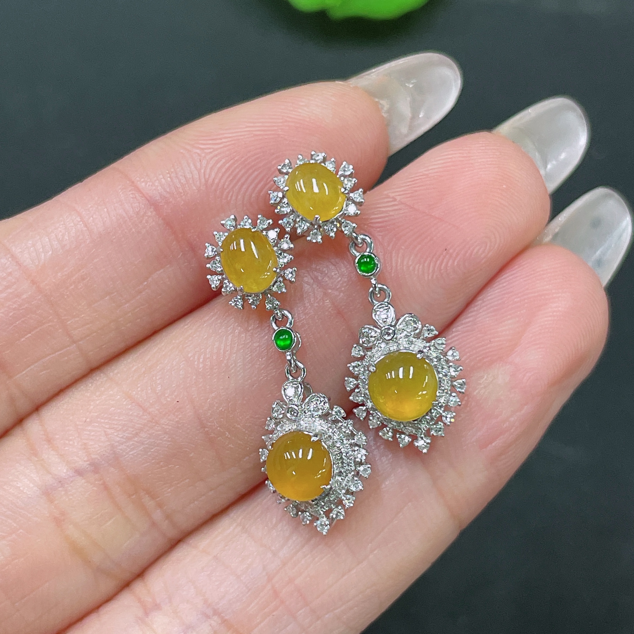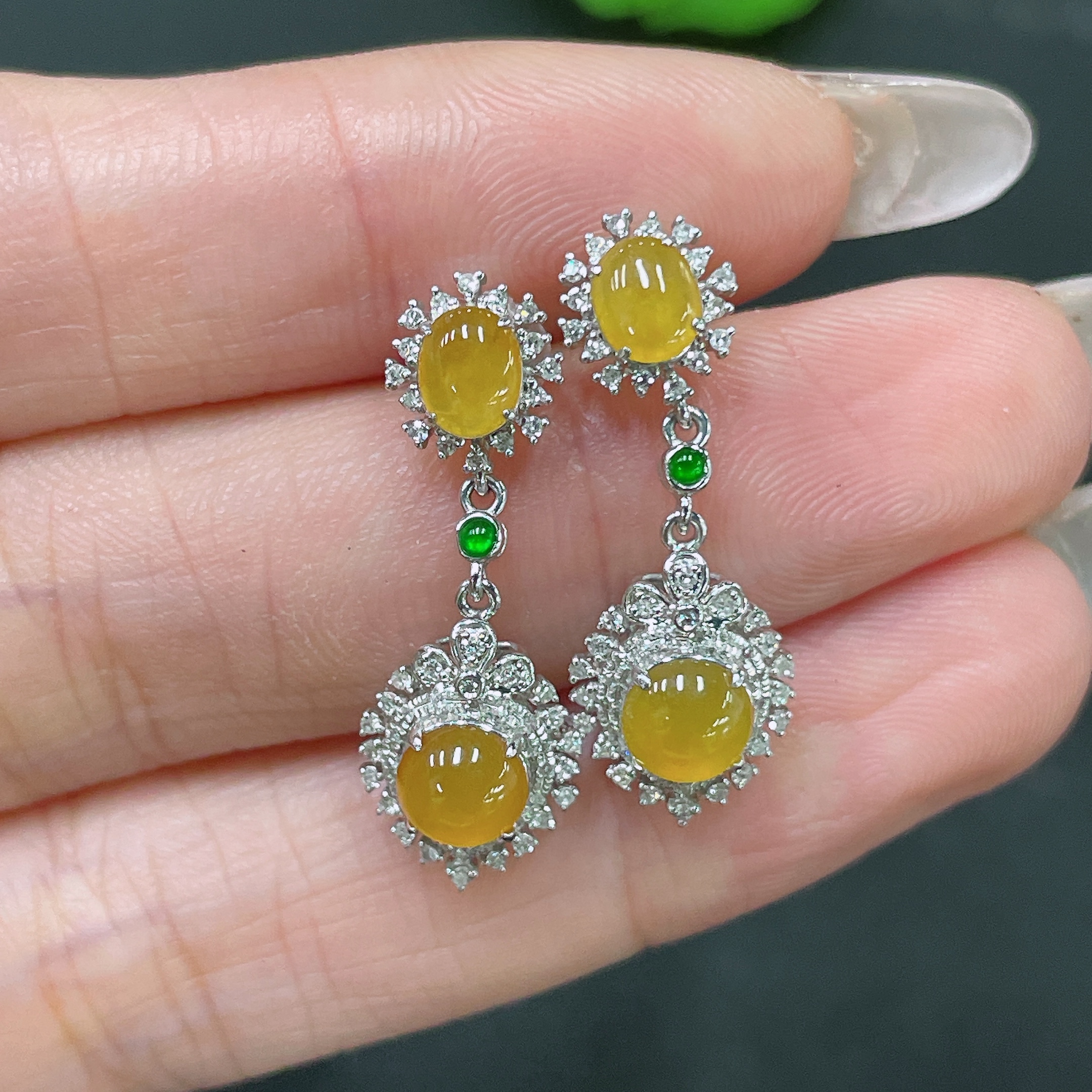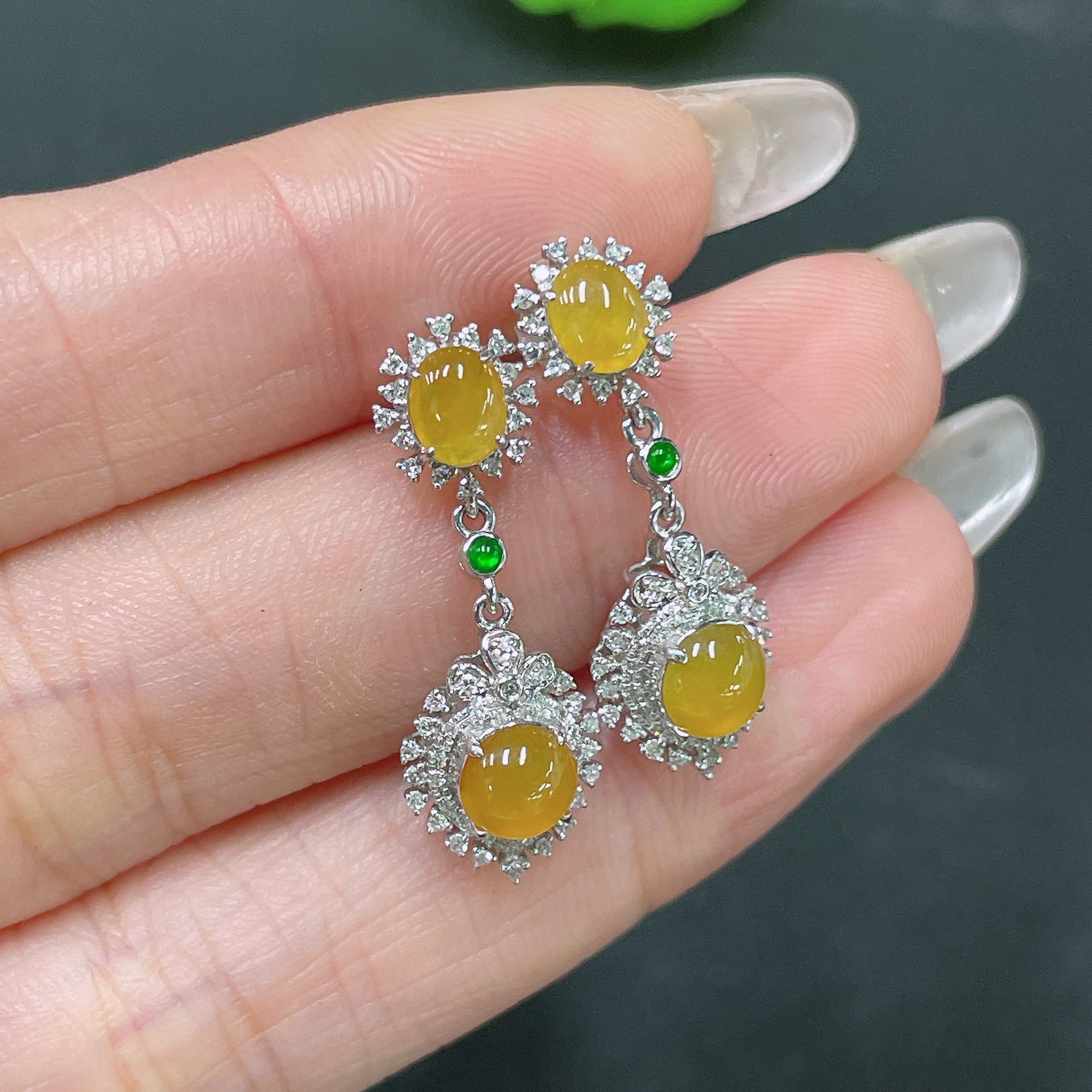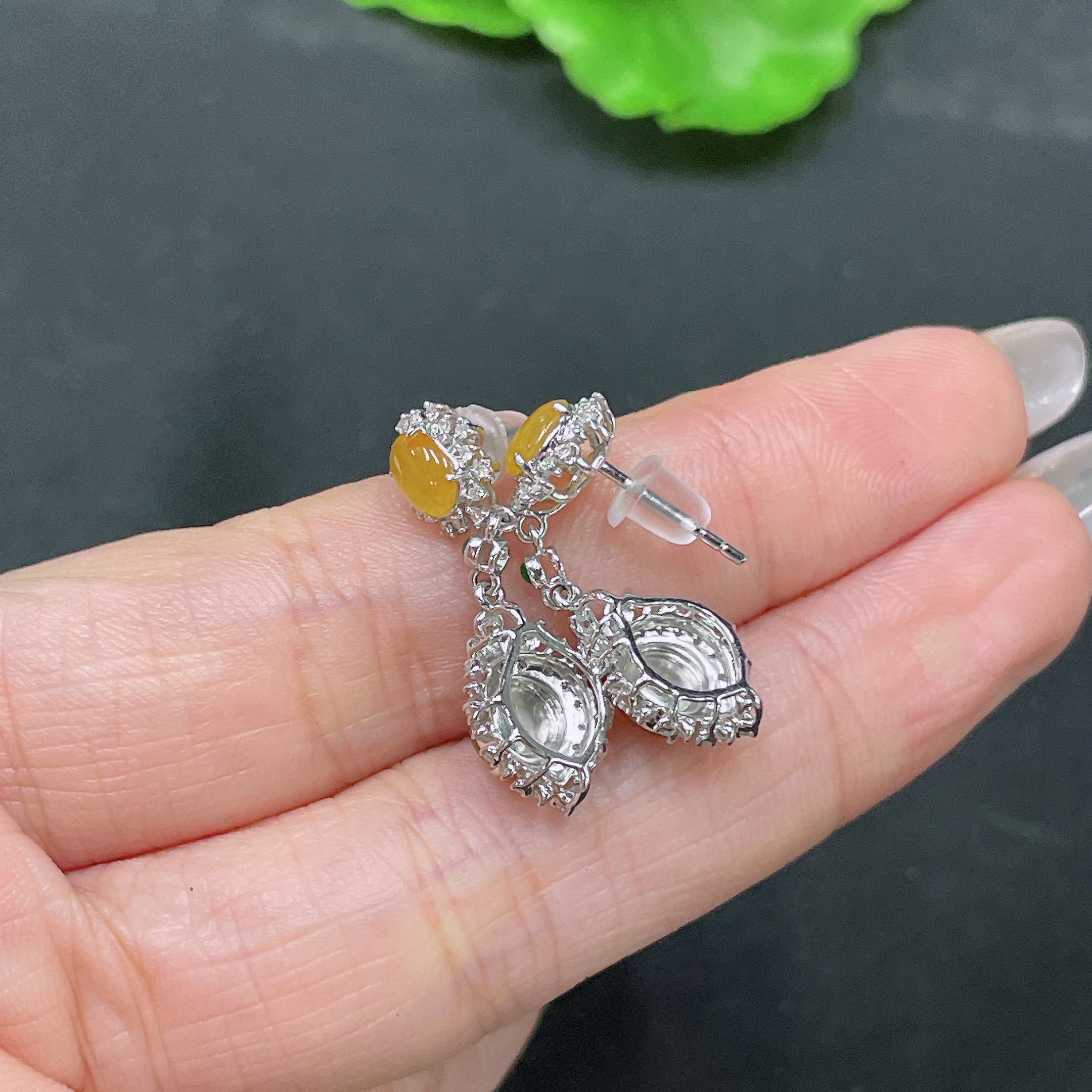 Jadeite earrings set in 18k gold with diamond accents, colorless, including ear backs, total weight approximately 3.4g