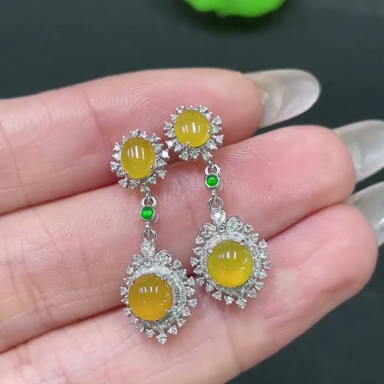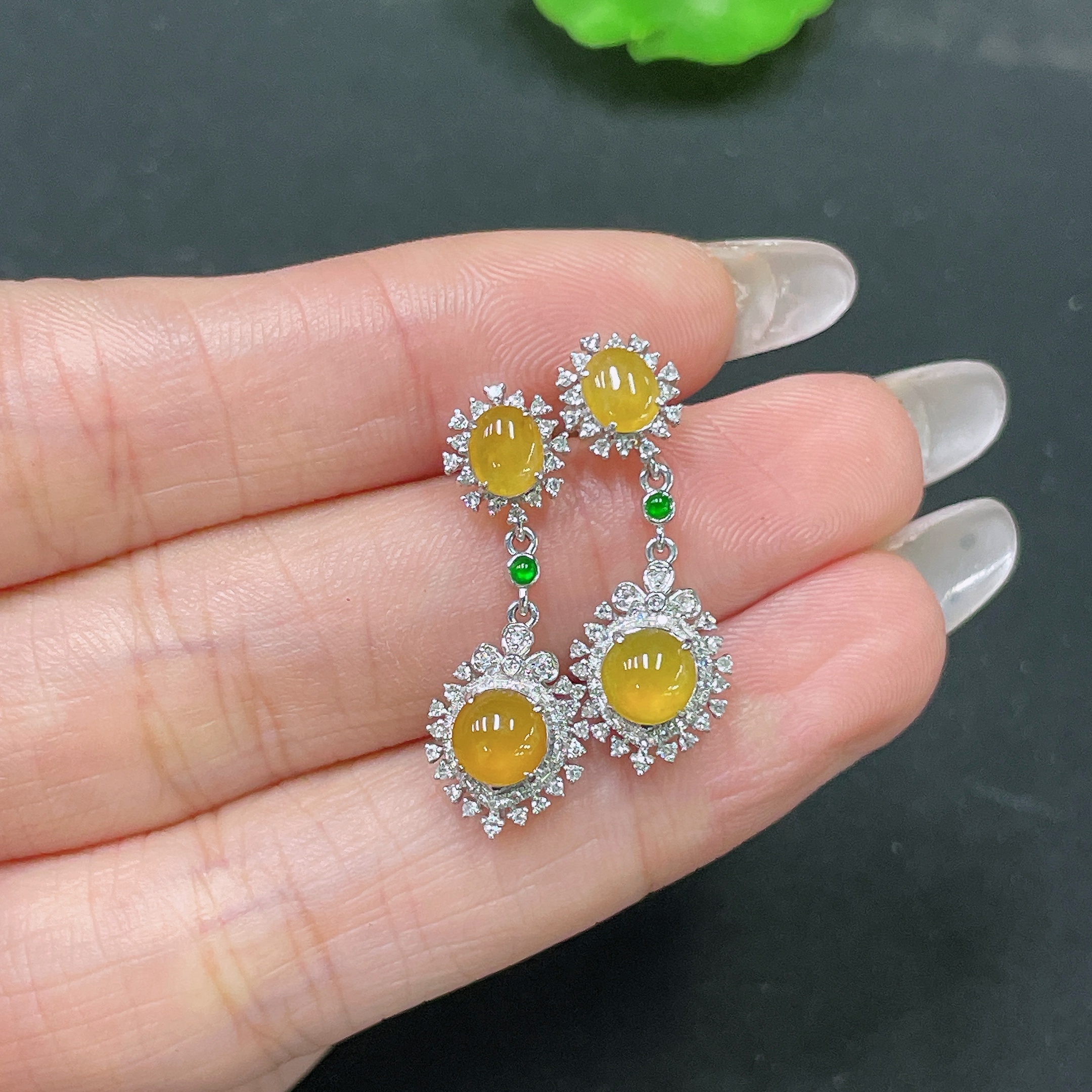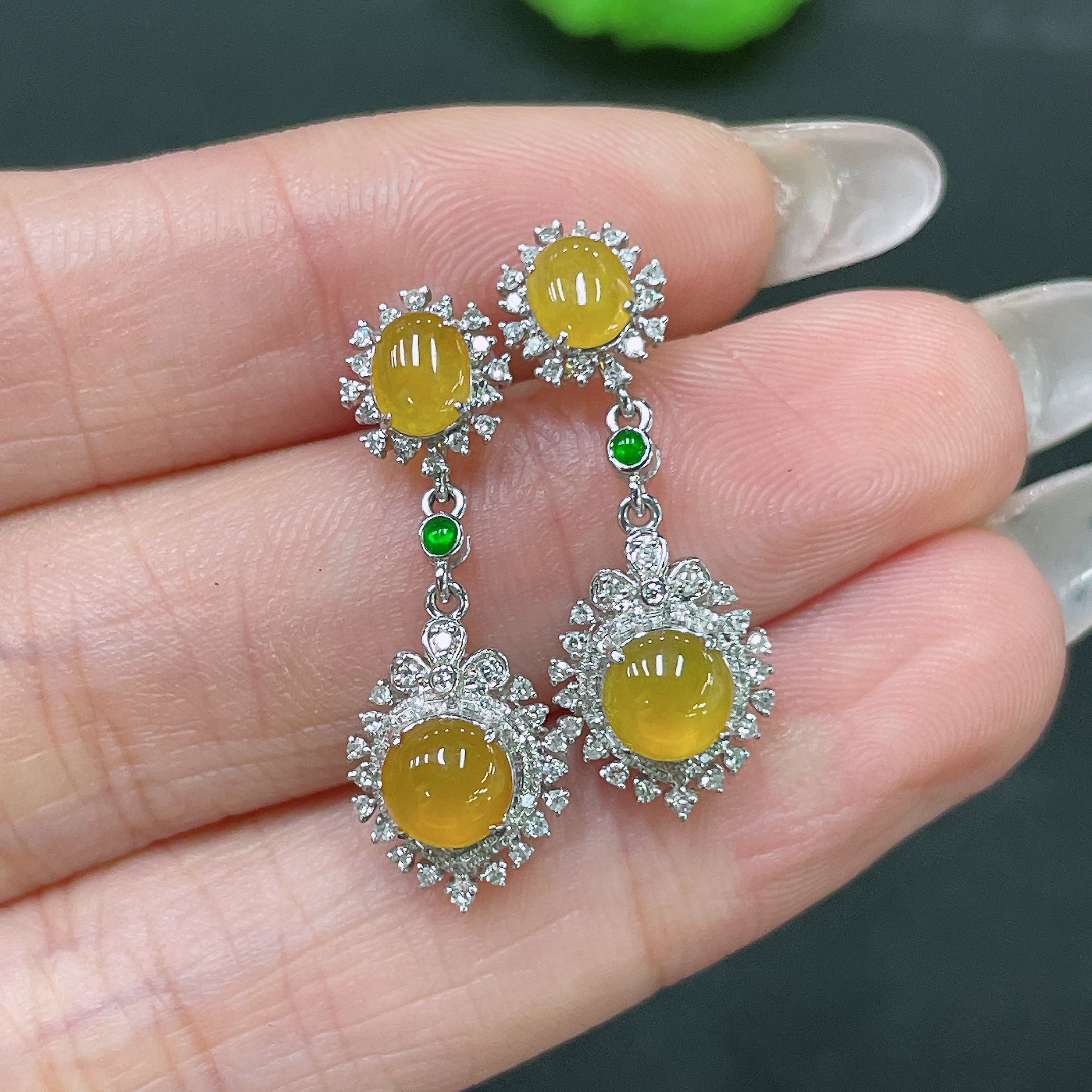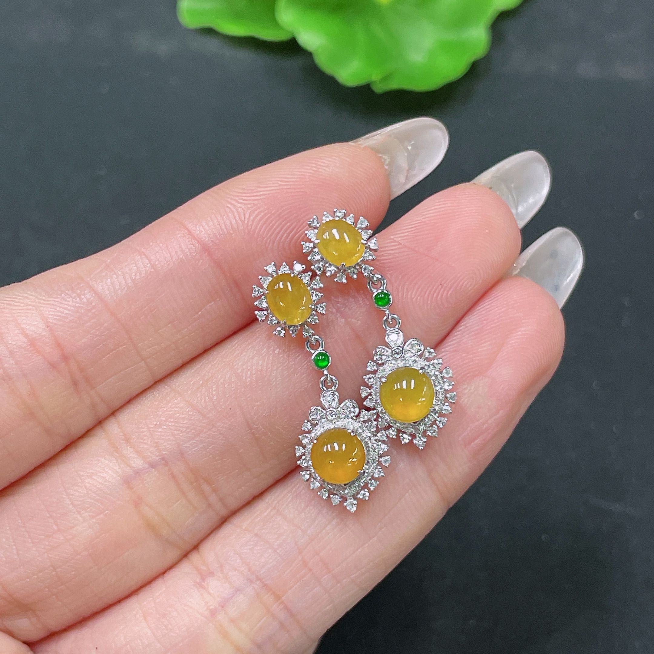 Jadeite earrings set in 18k gold with diamond accents, colorless, including ear backs, total weight approximately 3.4g