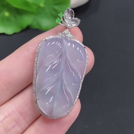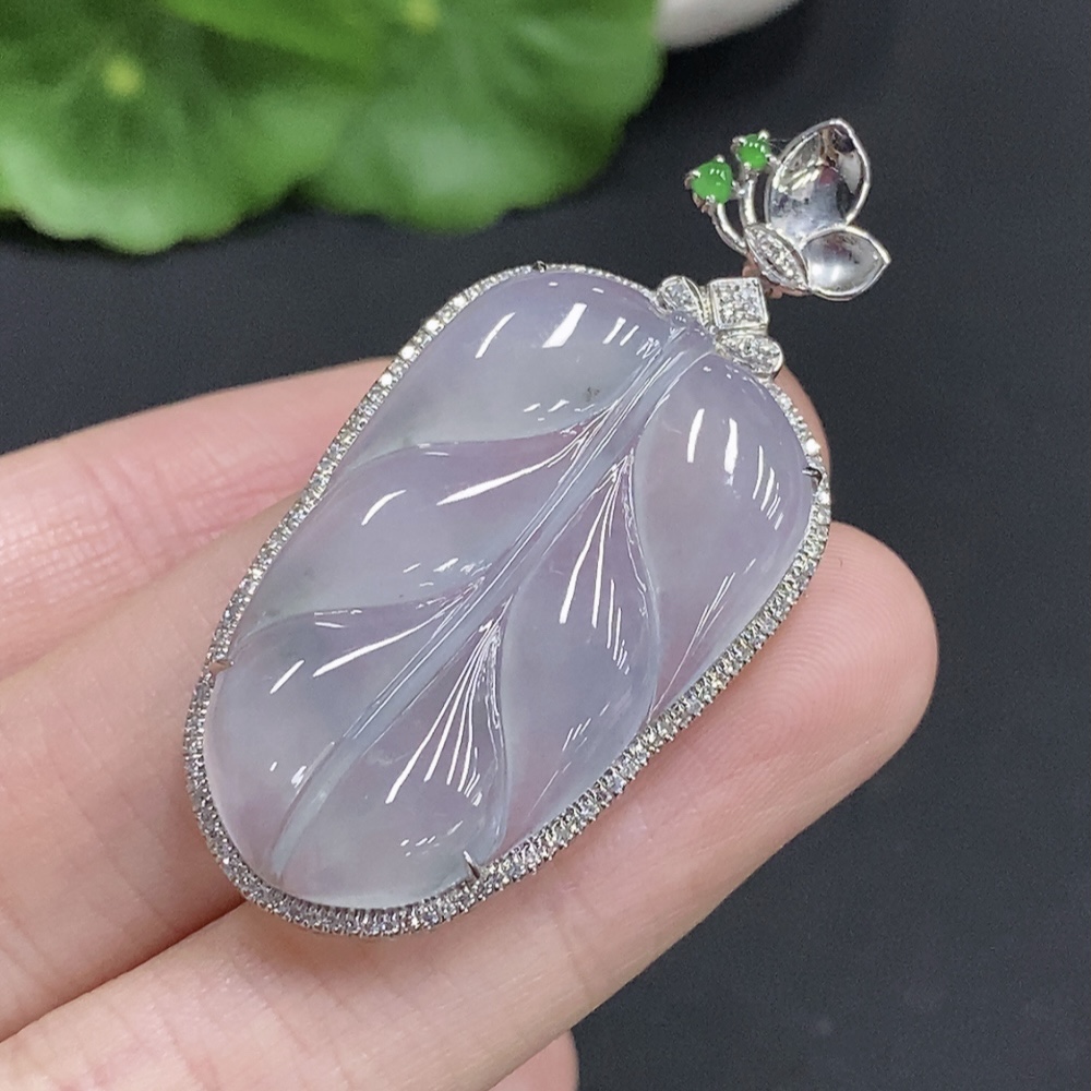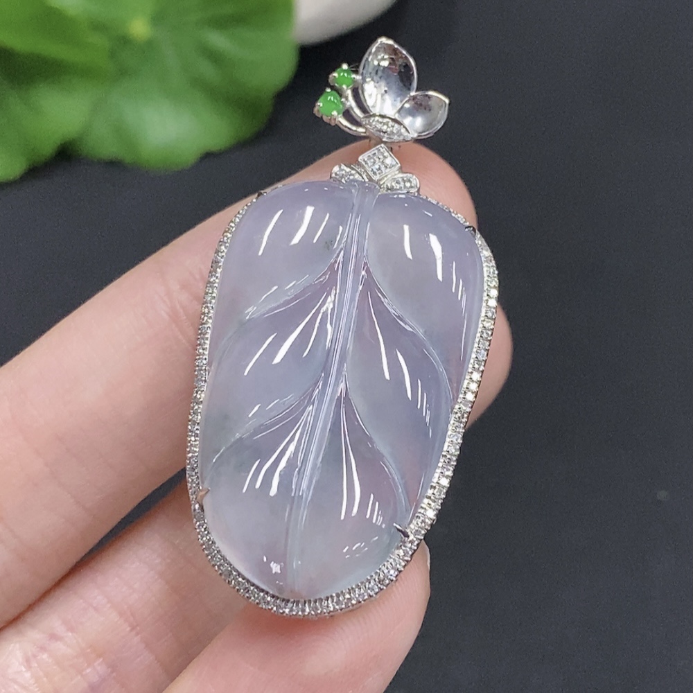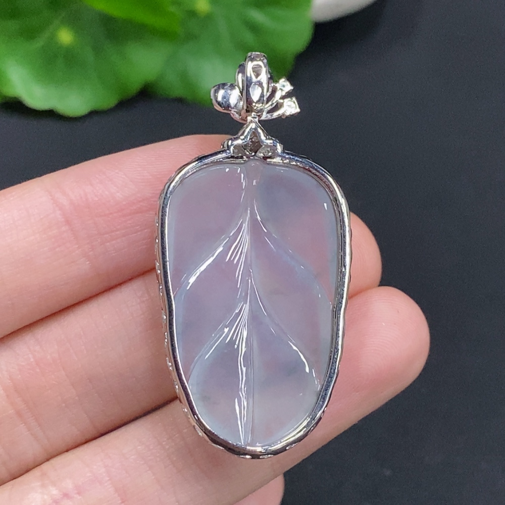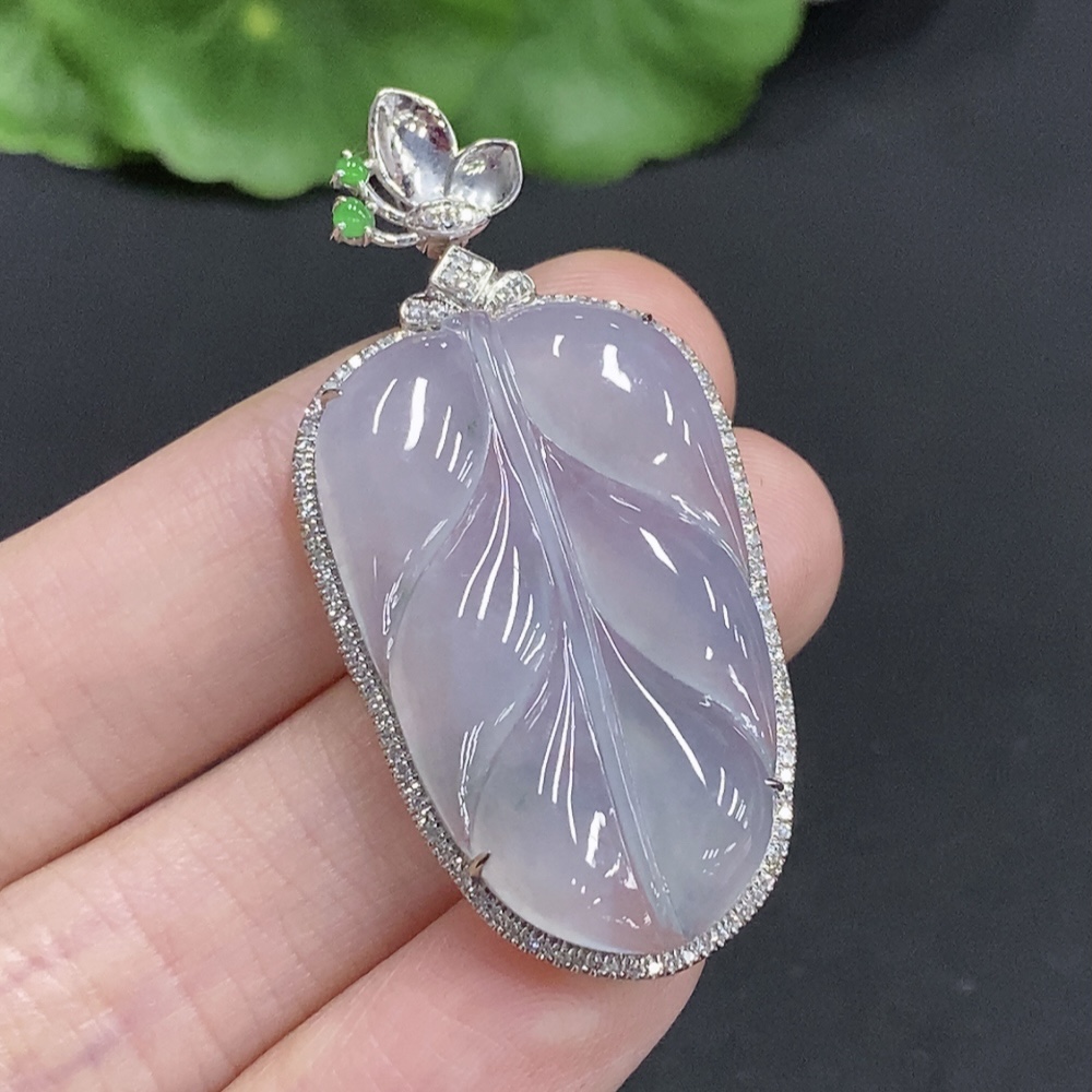 Jadeite Leaf Inlay Pendant 18k Gold Inlaid with Diamonds Total Weight Approximately 7.5g