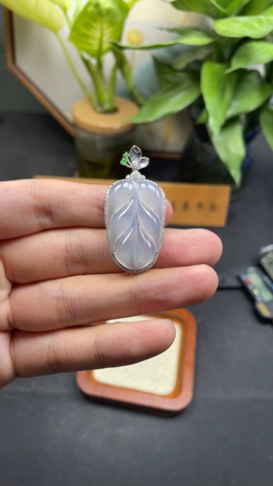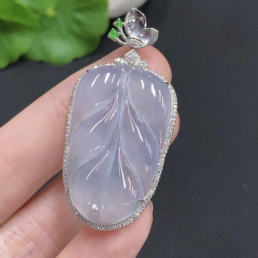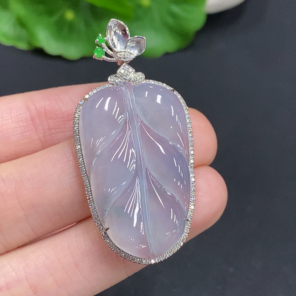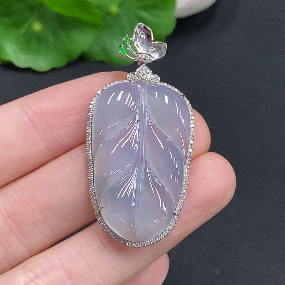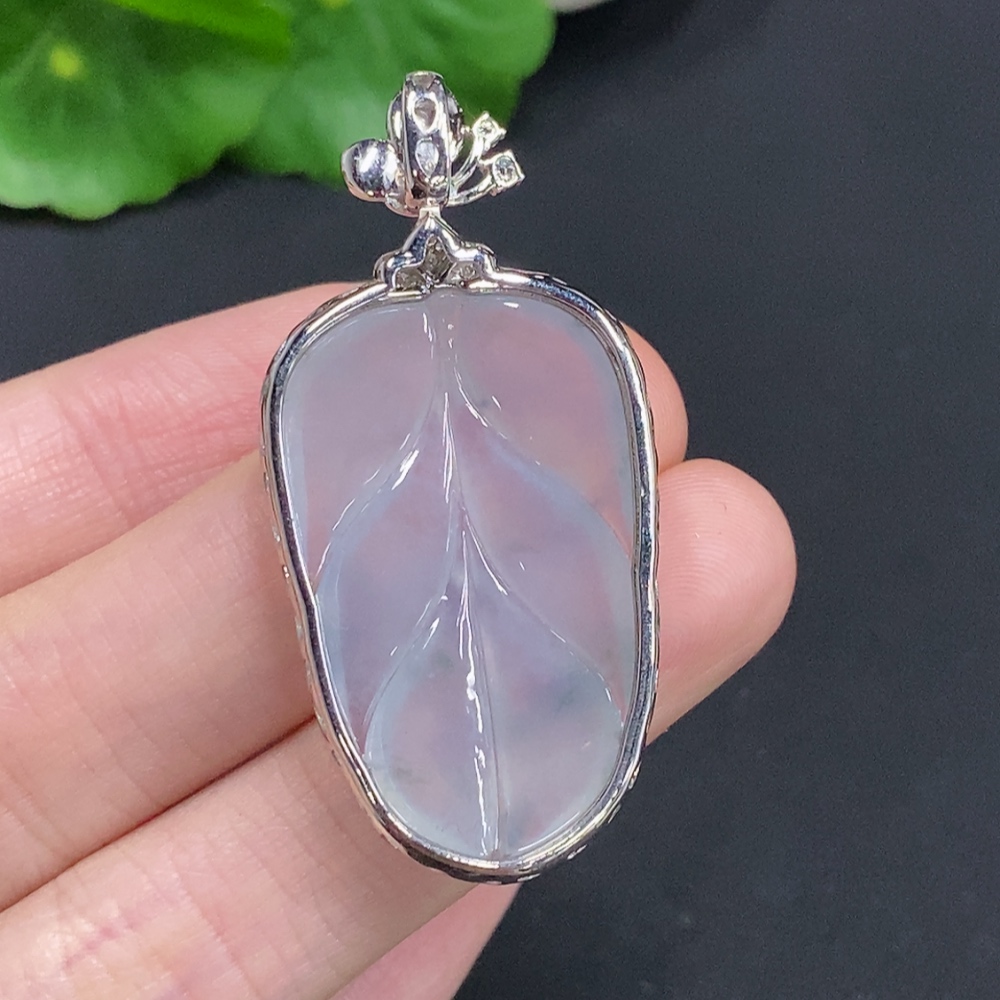 Jadeite Leaf Inlay Pendant 18k Gold Inlaid with Diamonds Total Weight Approximately 7.5g