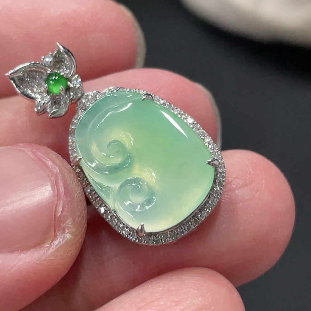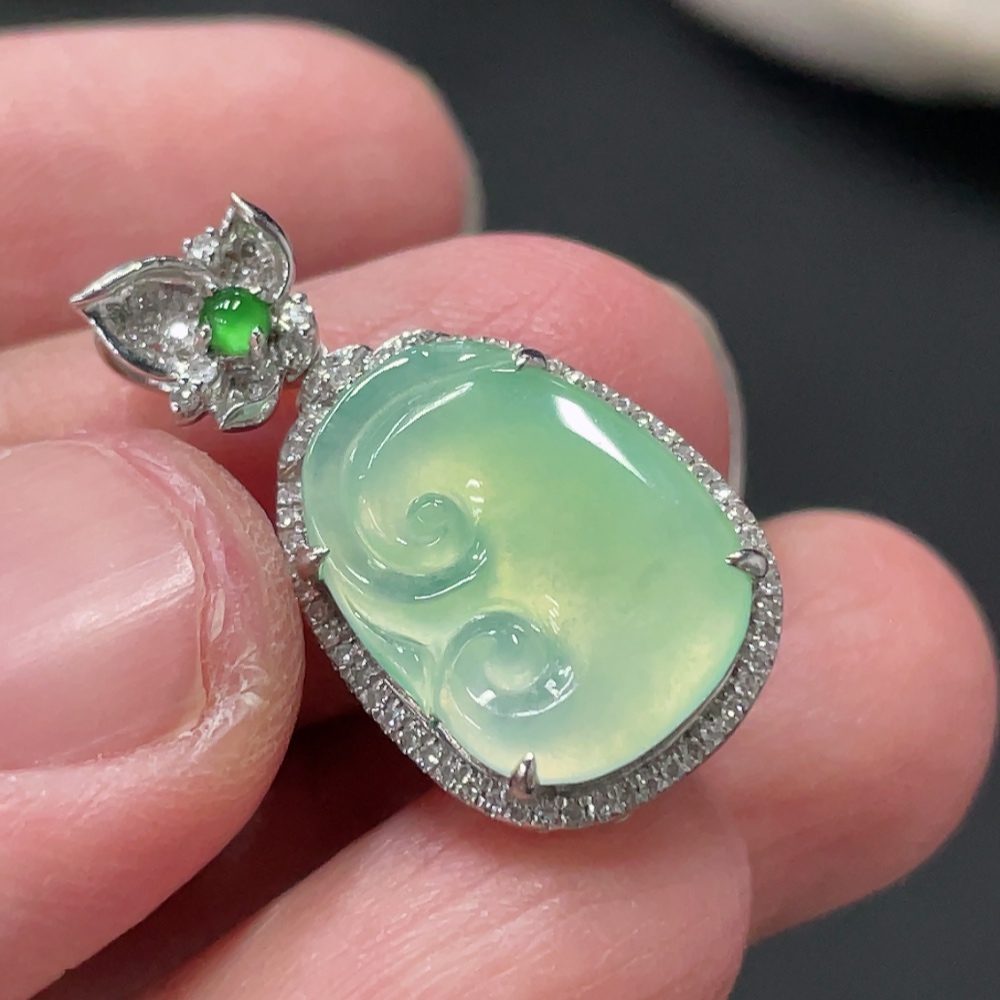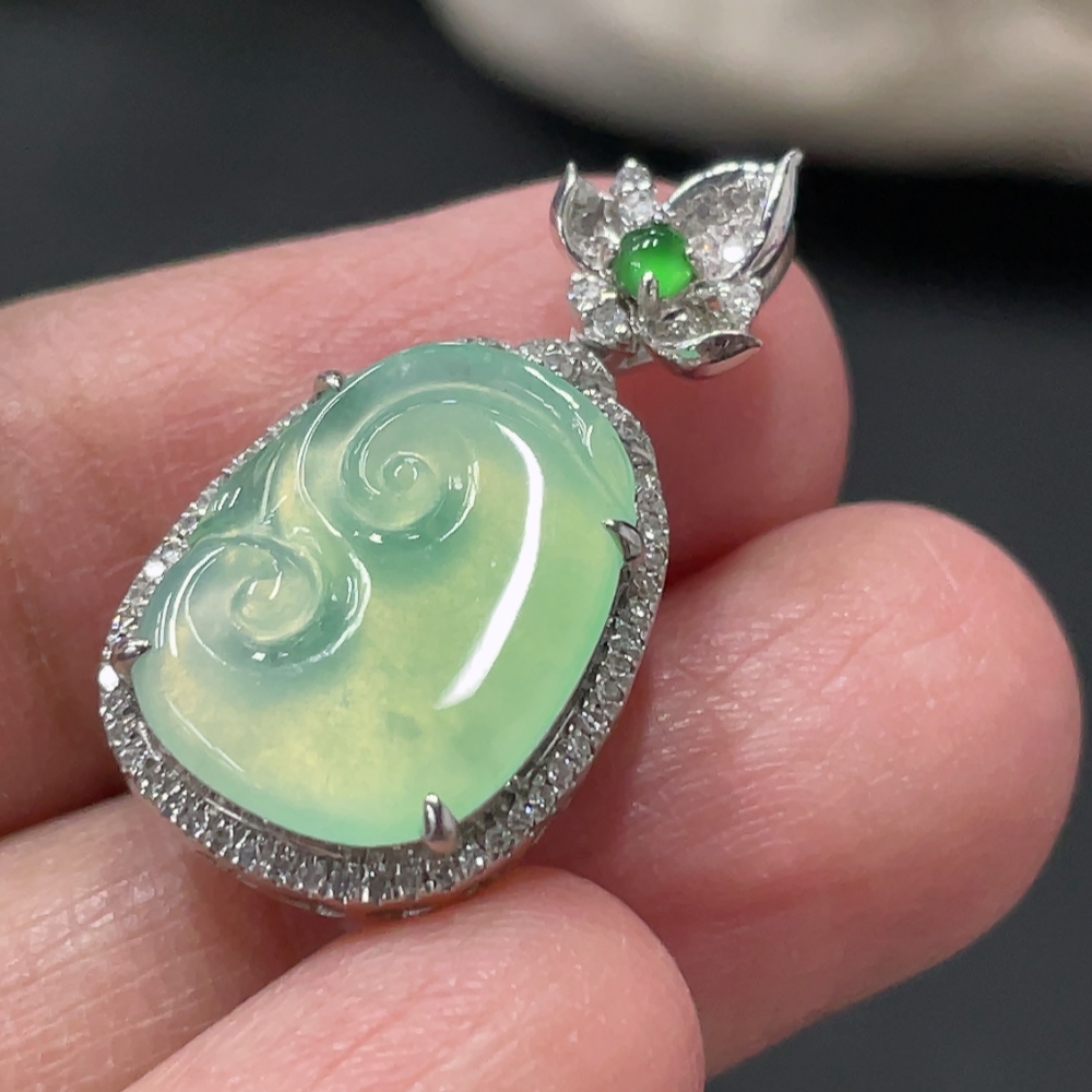 Jadeite Ruyi Inlaid Pendant 18k Gold Inlaid Total Weight Approx. 2.27g with Diamond Accents