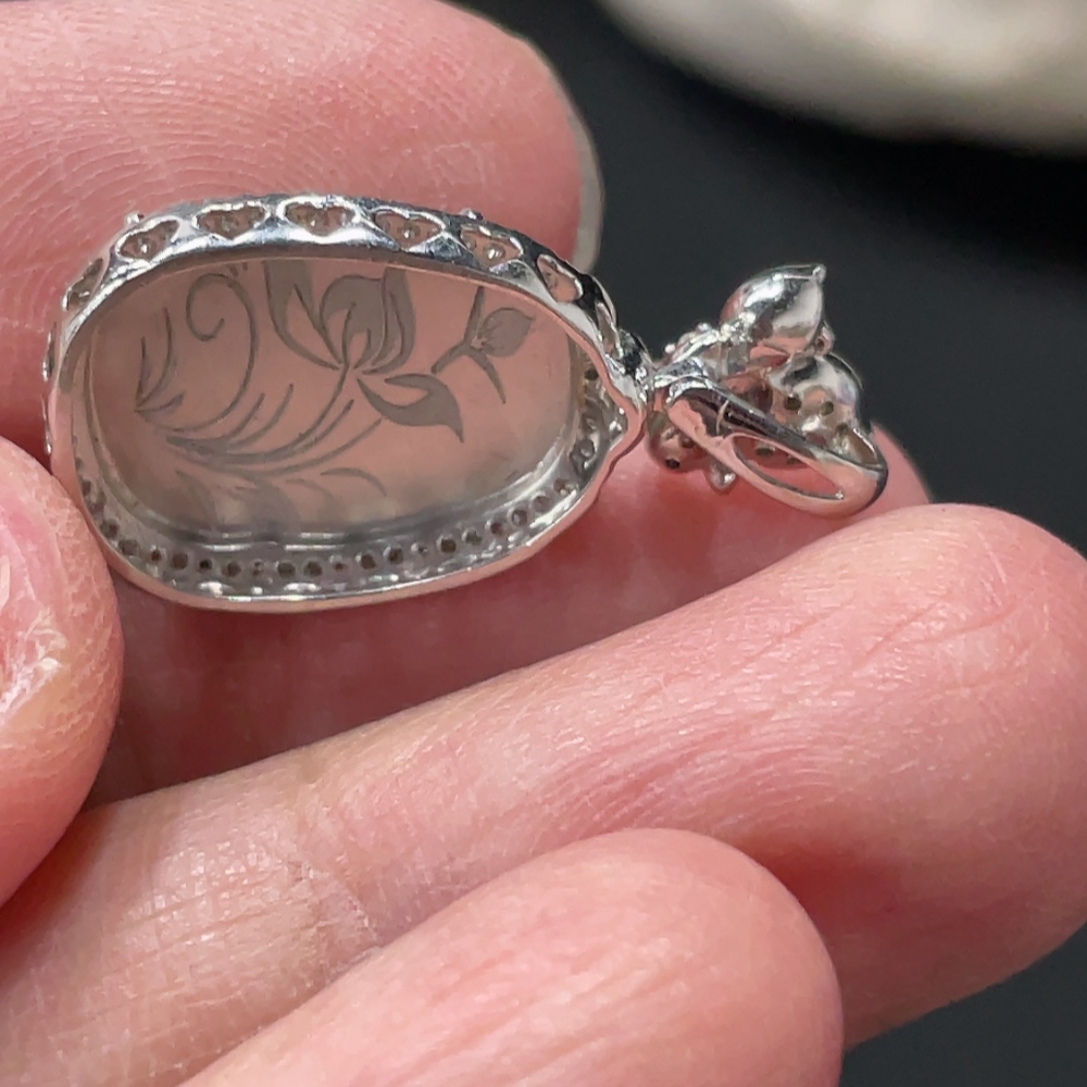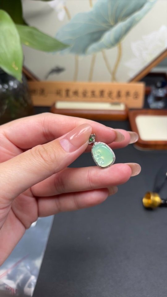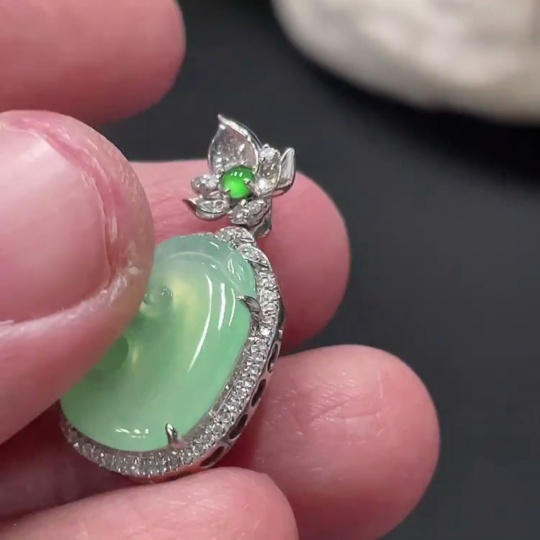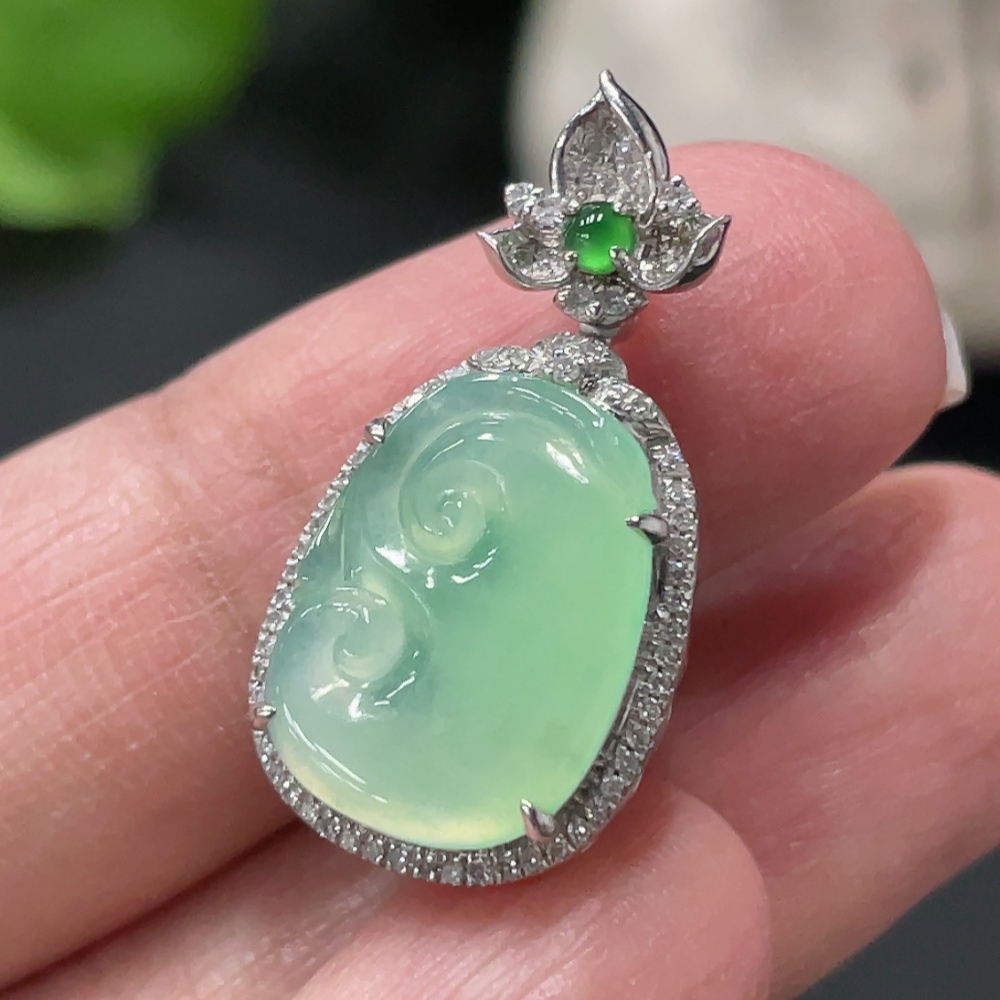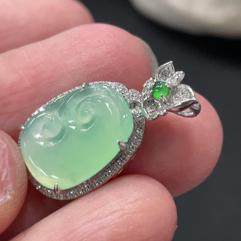Jadeite Ruyi Inlaid Pendant 18k Gold Inlaid Total Weight Approx. 2.27g with Diamond Accents