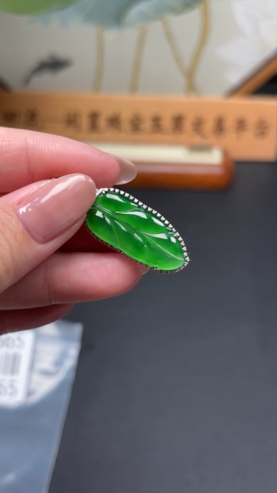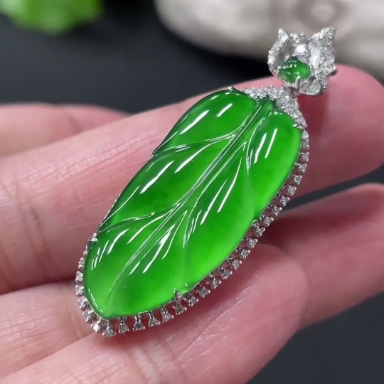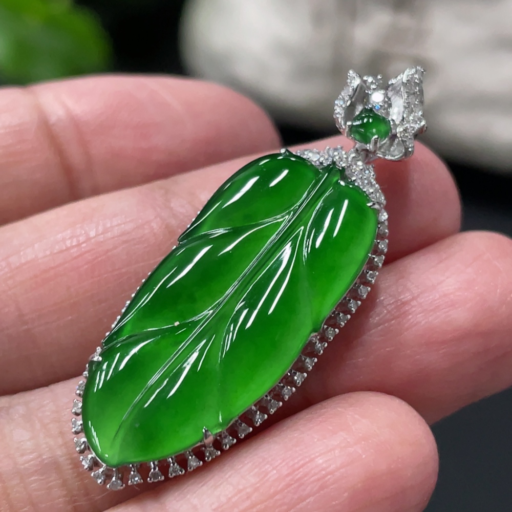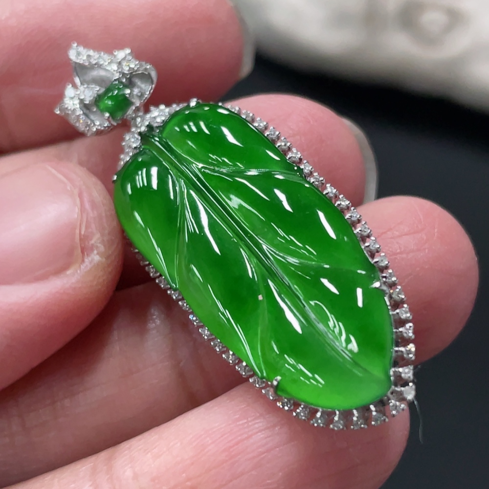 Jadeite Leaf Inlaid Pendant 18k Gold Setting Total Weight Approx.4.79g With Diamond Accents