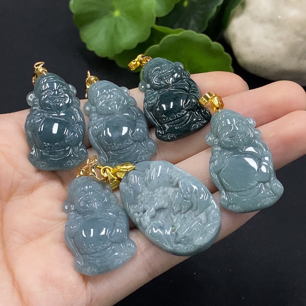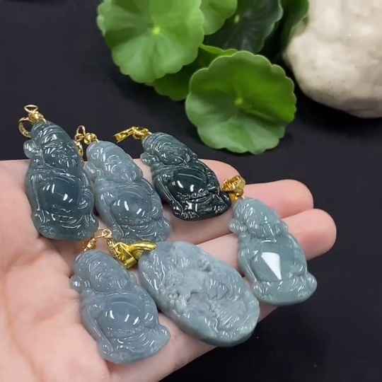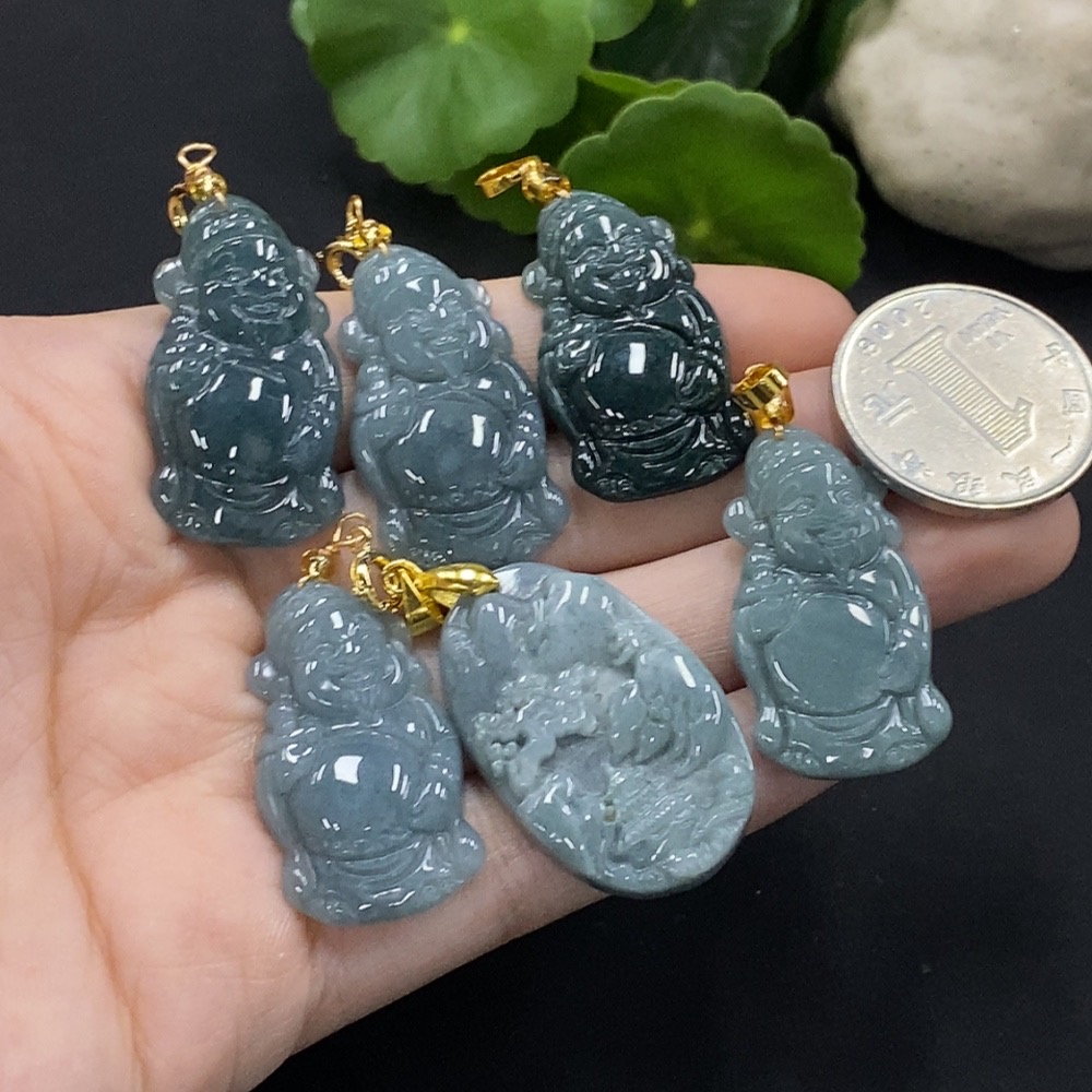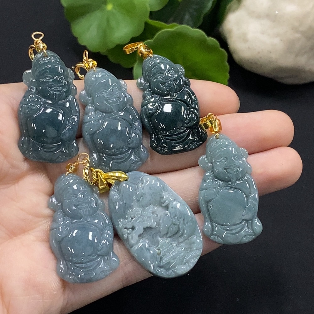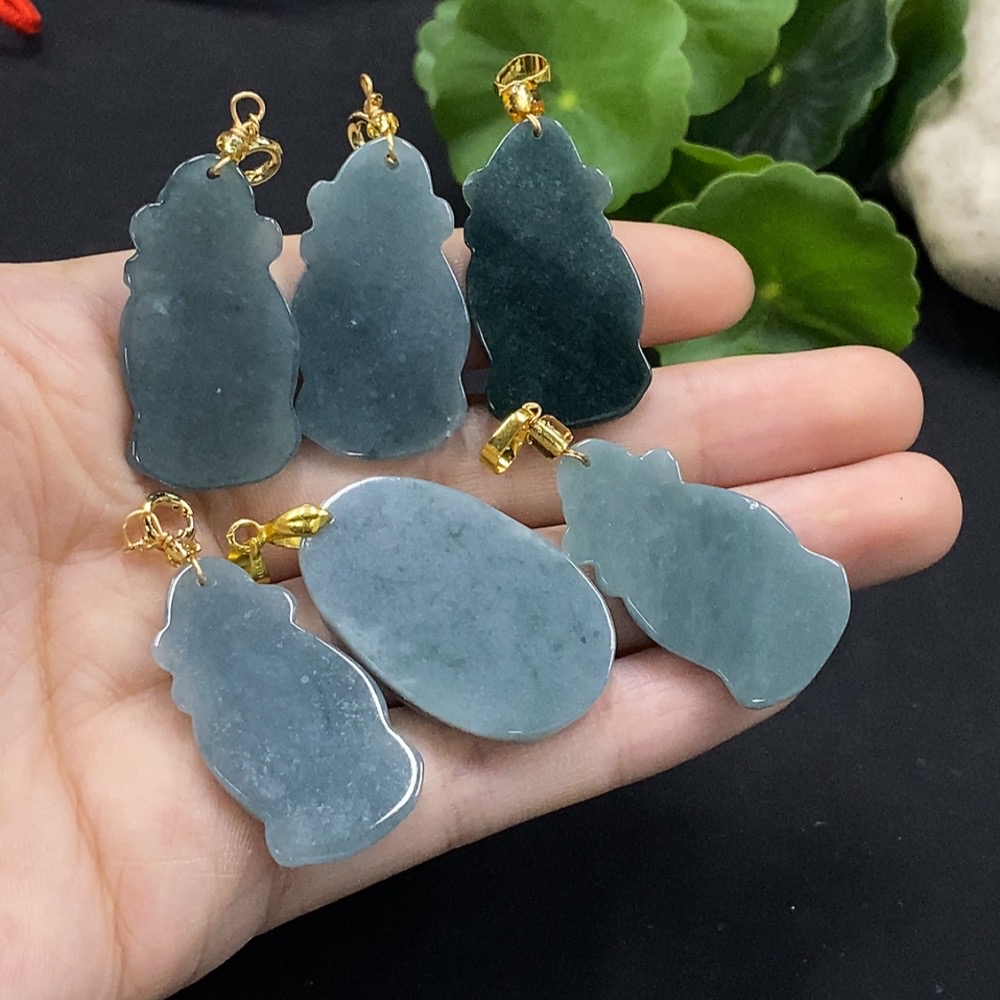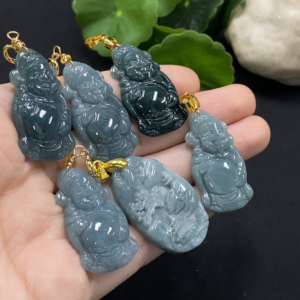 Jadeite God of Wealth/Landscape Pendant with Non-A Beads, Non-Gold Inlaid