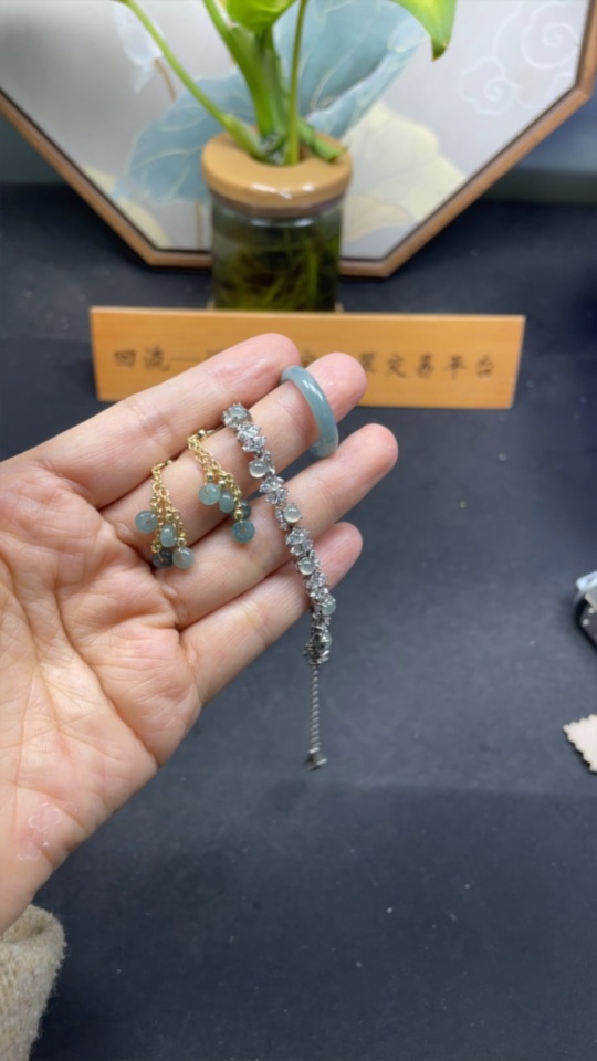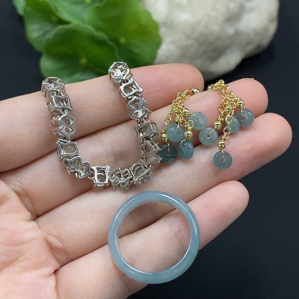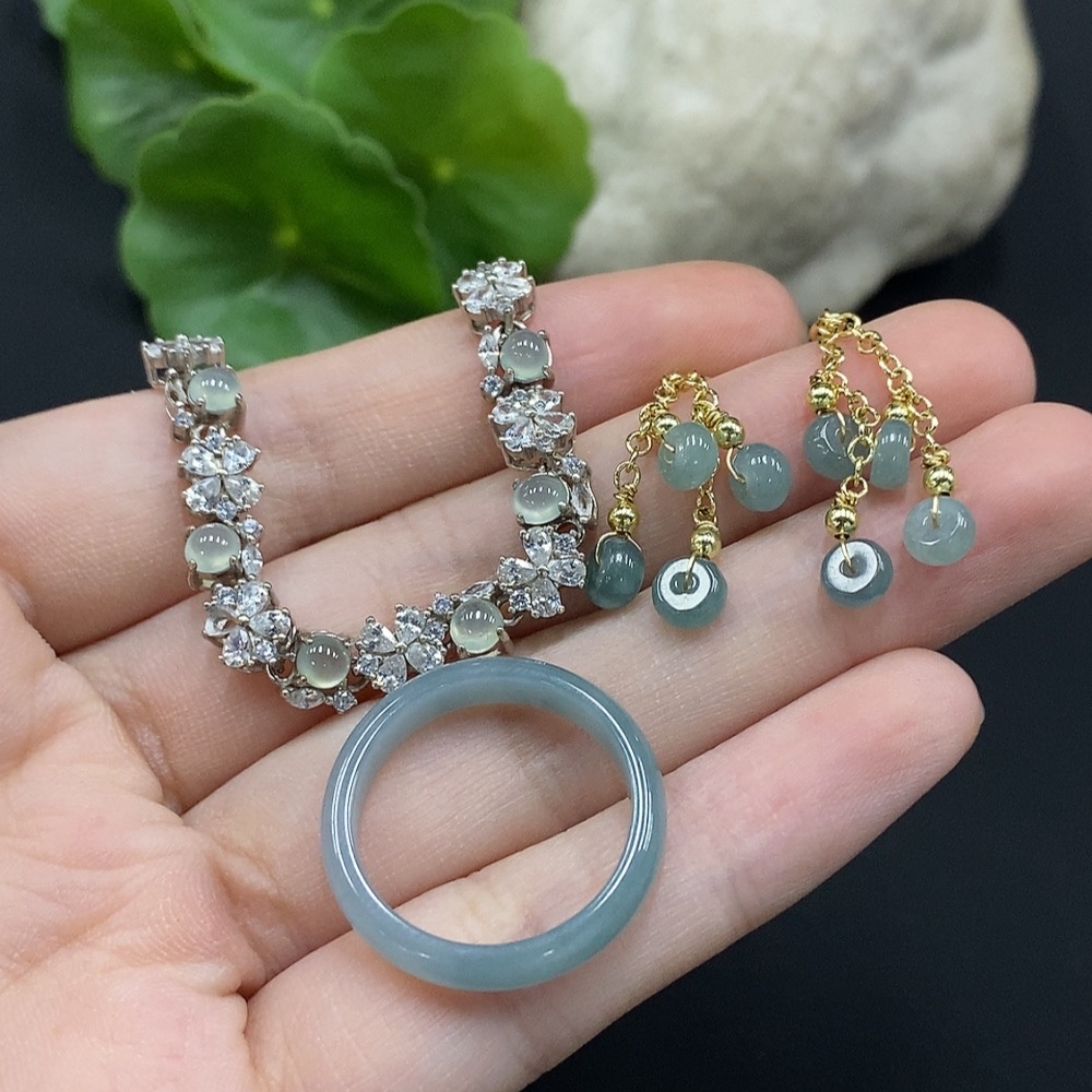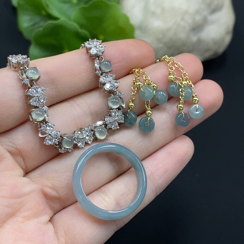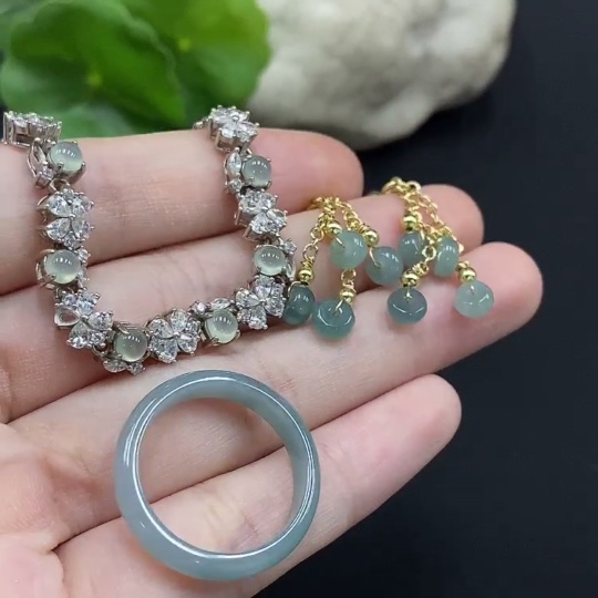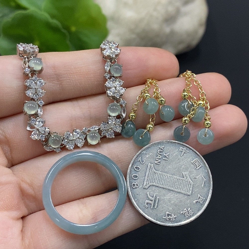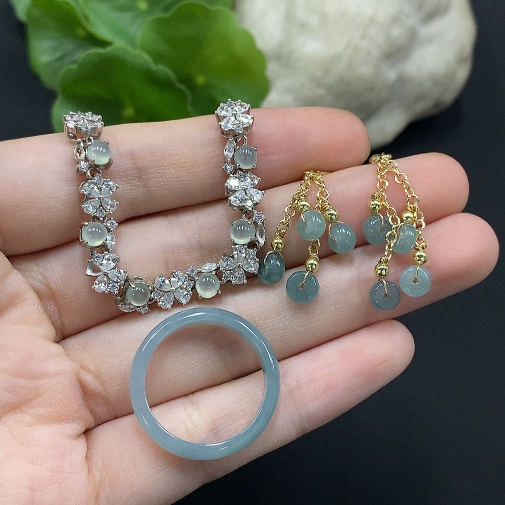 Jadeite Cabochon Inlaid Bracelet/Earrings/Ring Non-Gold Inlay Sell as a Lot