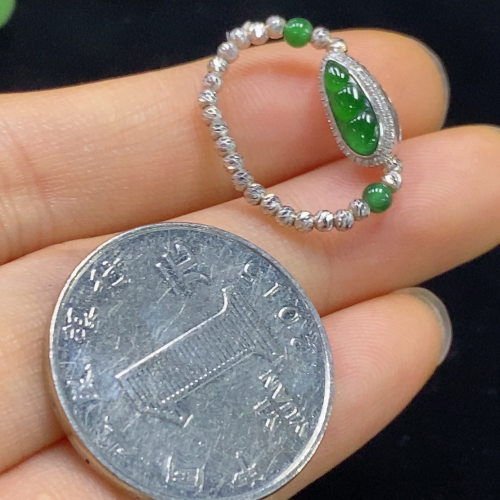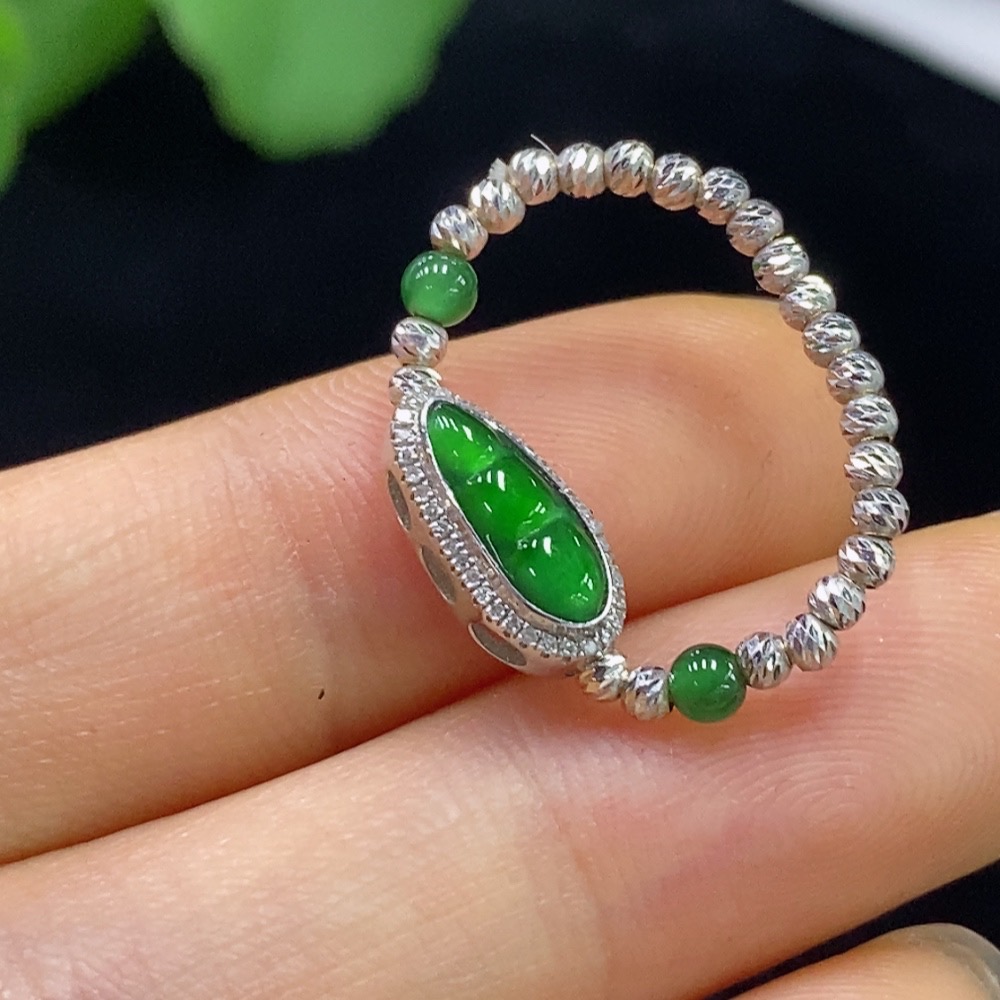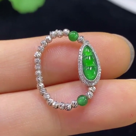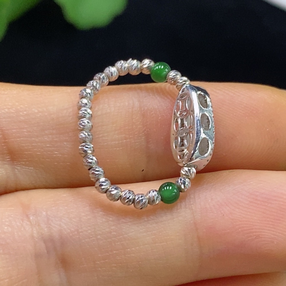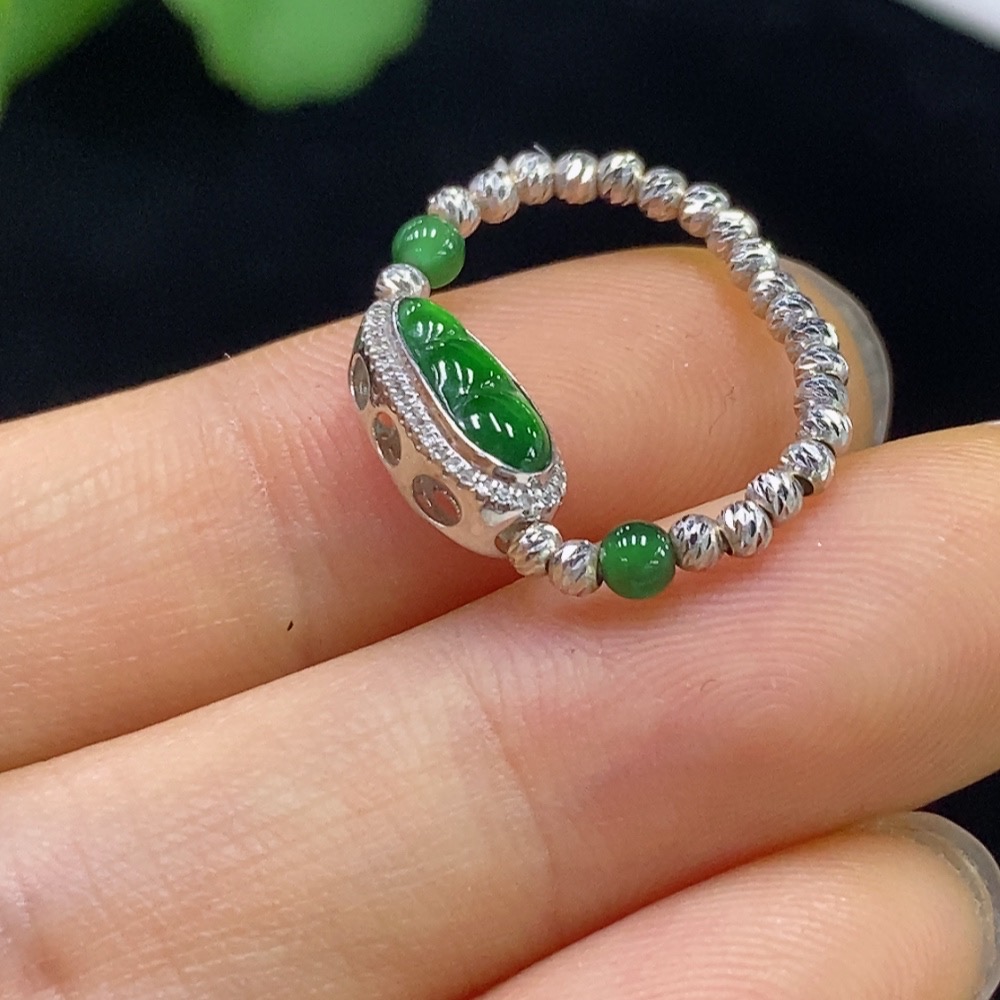 Jadeite Blessed Bean Inlaid Ring 18k with Diamond Accent Size 5 Total Weight Approx. 0.82g
