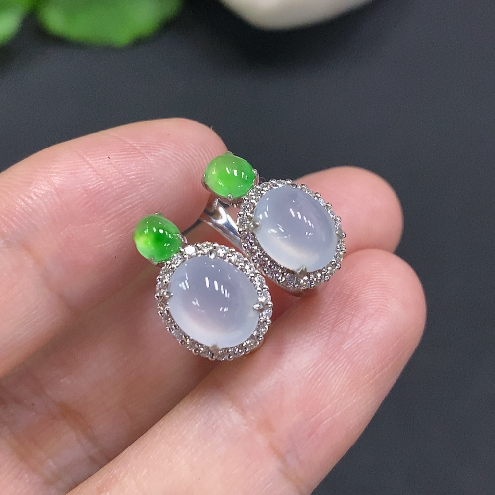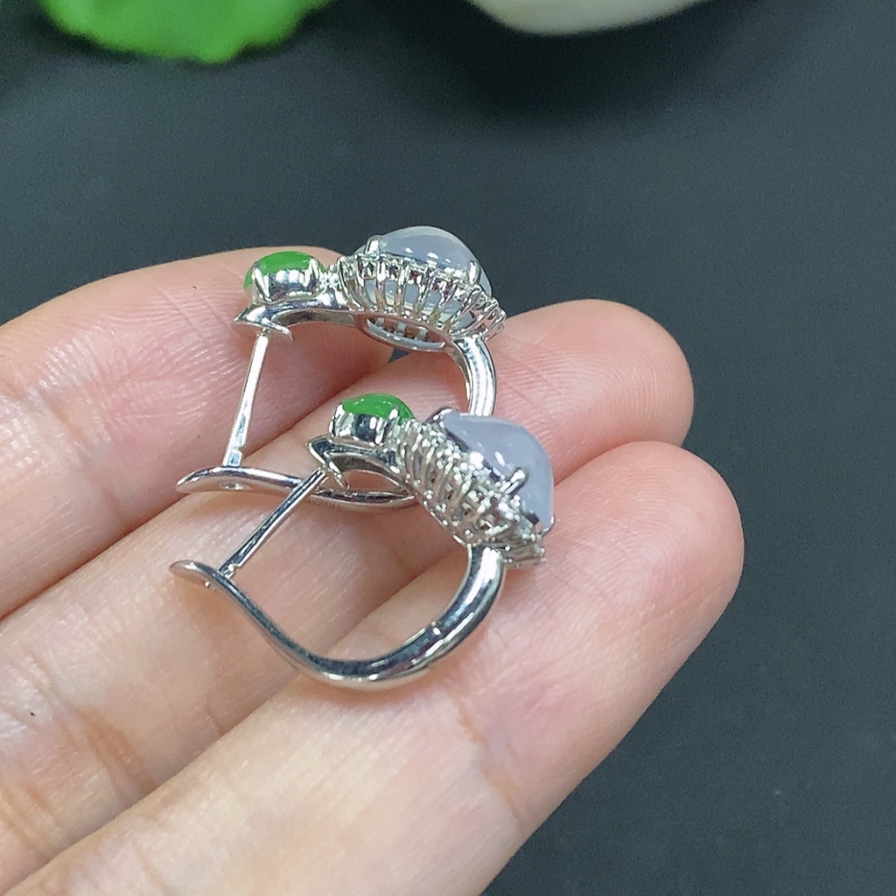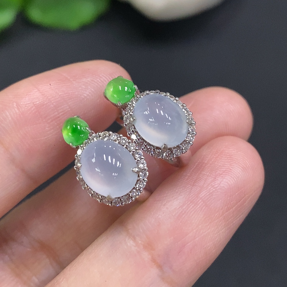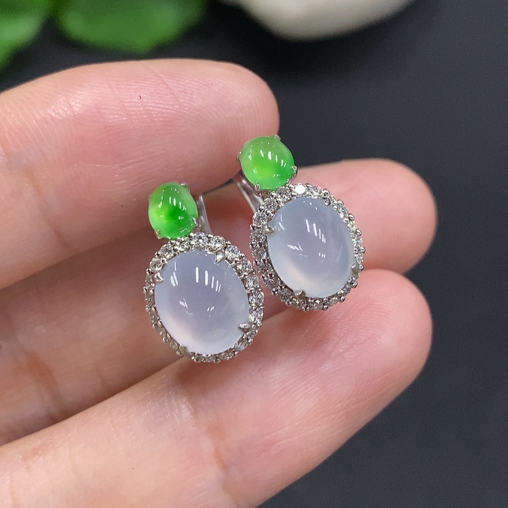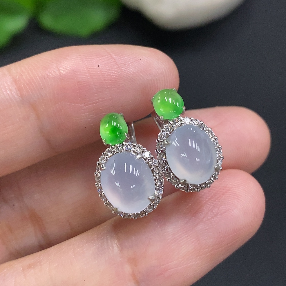 Jadeite Cabochon Earrings with 18k Gold and Diamond Accents, Total Weight Approximately 5.4g
