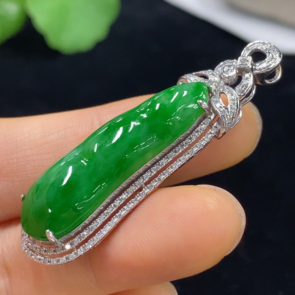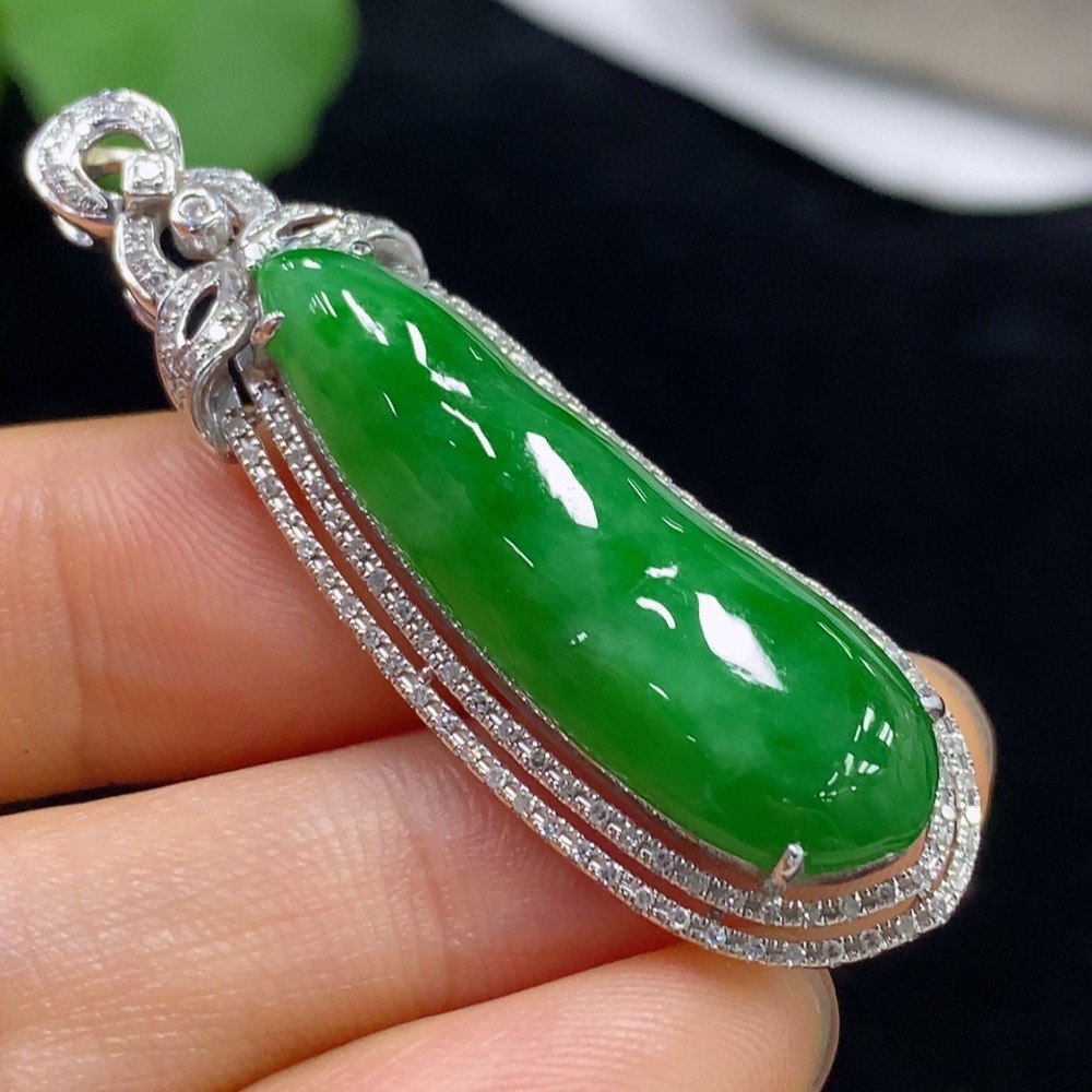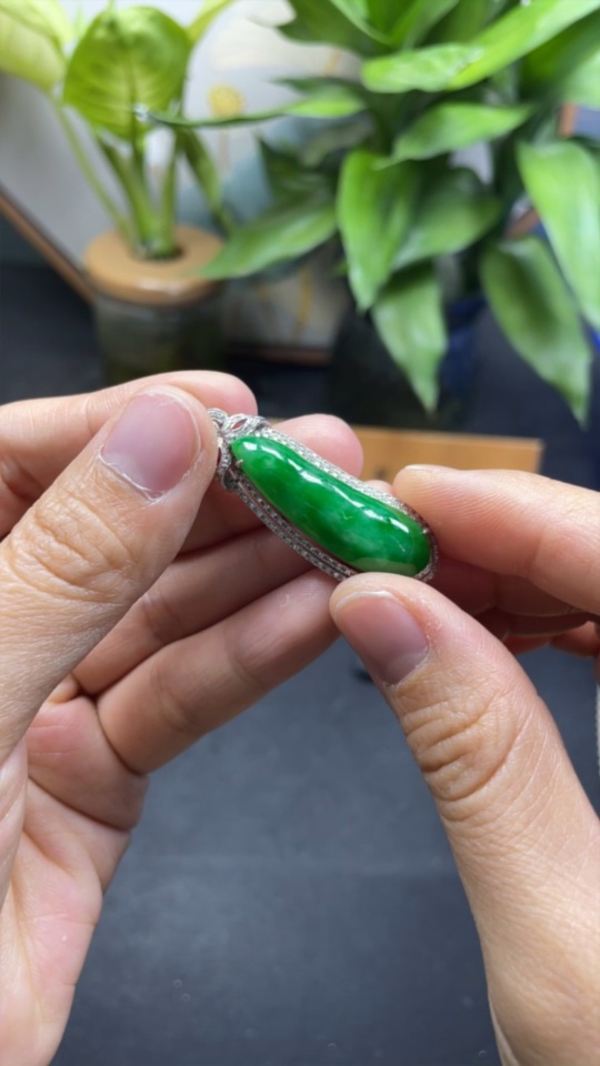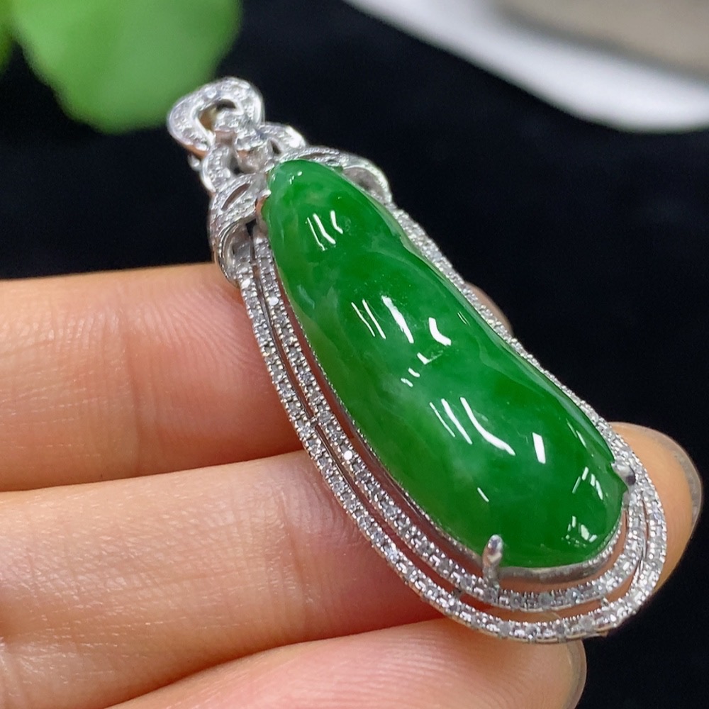 Jadeite Auspicious Bean Pendant with 18K Gold and Diamond Accents, Total Weight Approximately 7.96g
