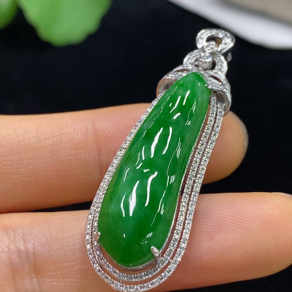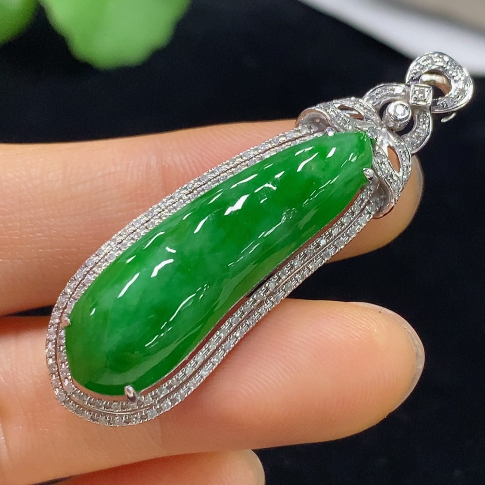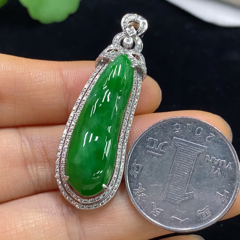 Jadeite Auspicious Bean Pendant with 18K Gold and Diamond Accents, Total Weight Approximately 7.96g
