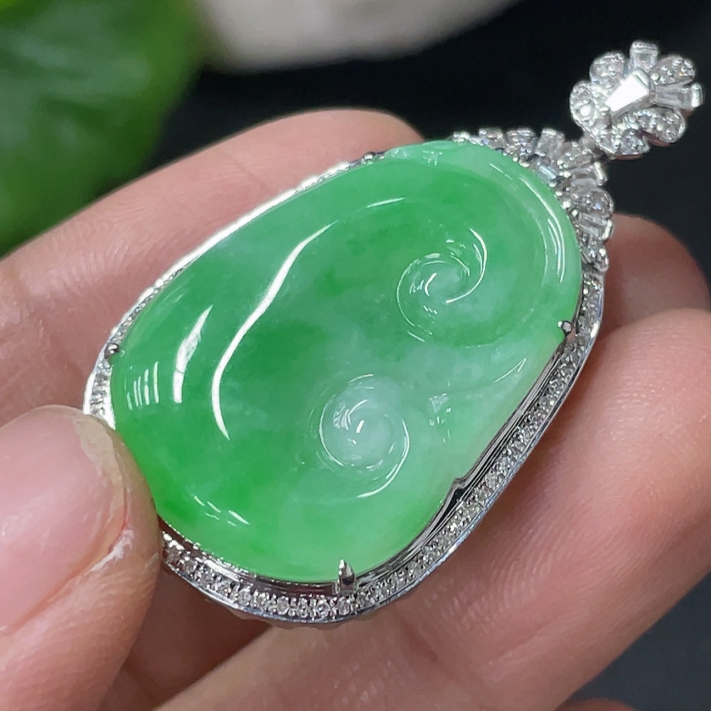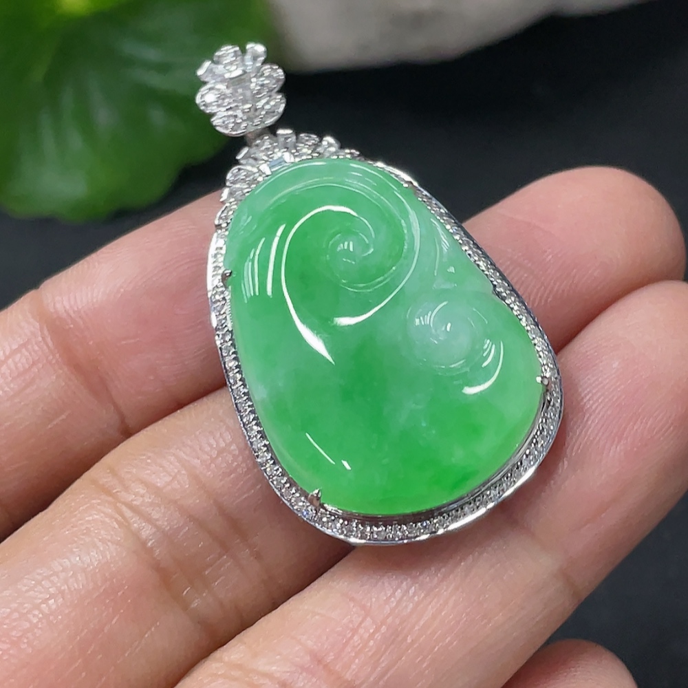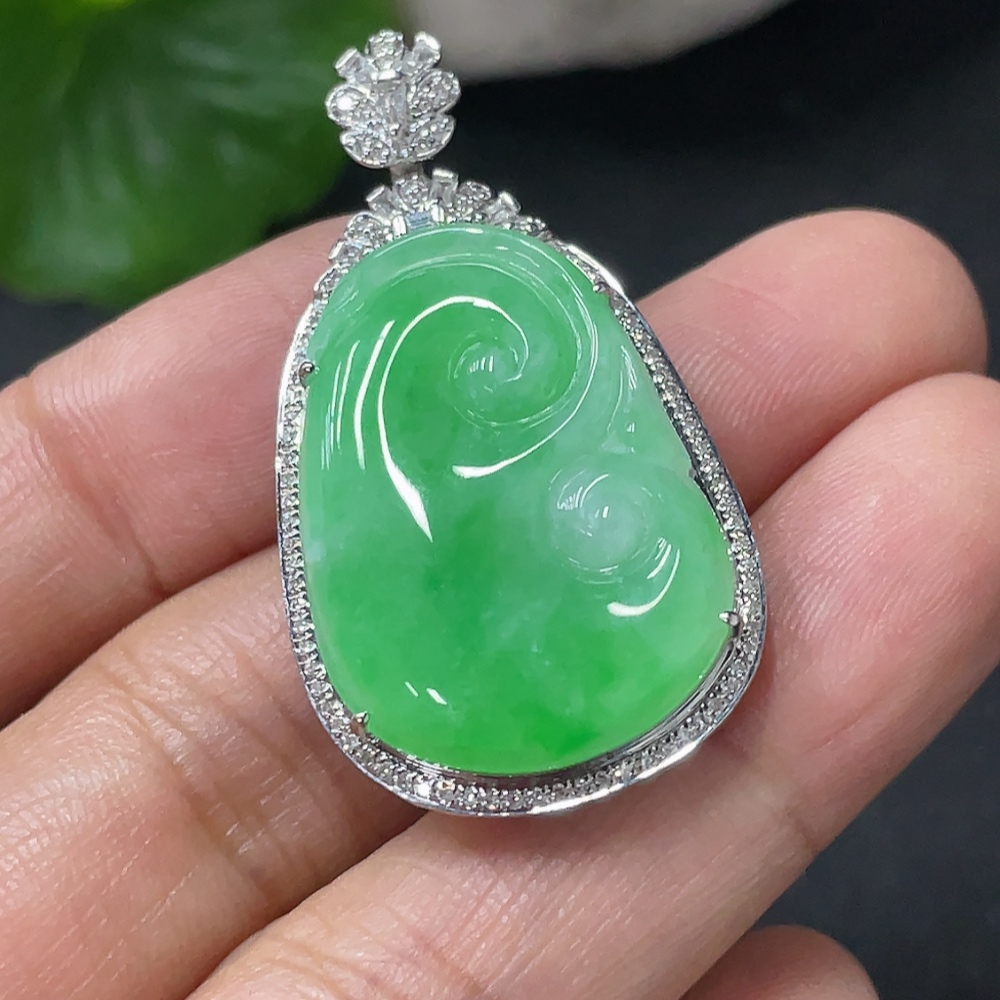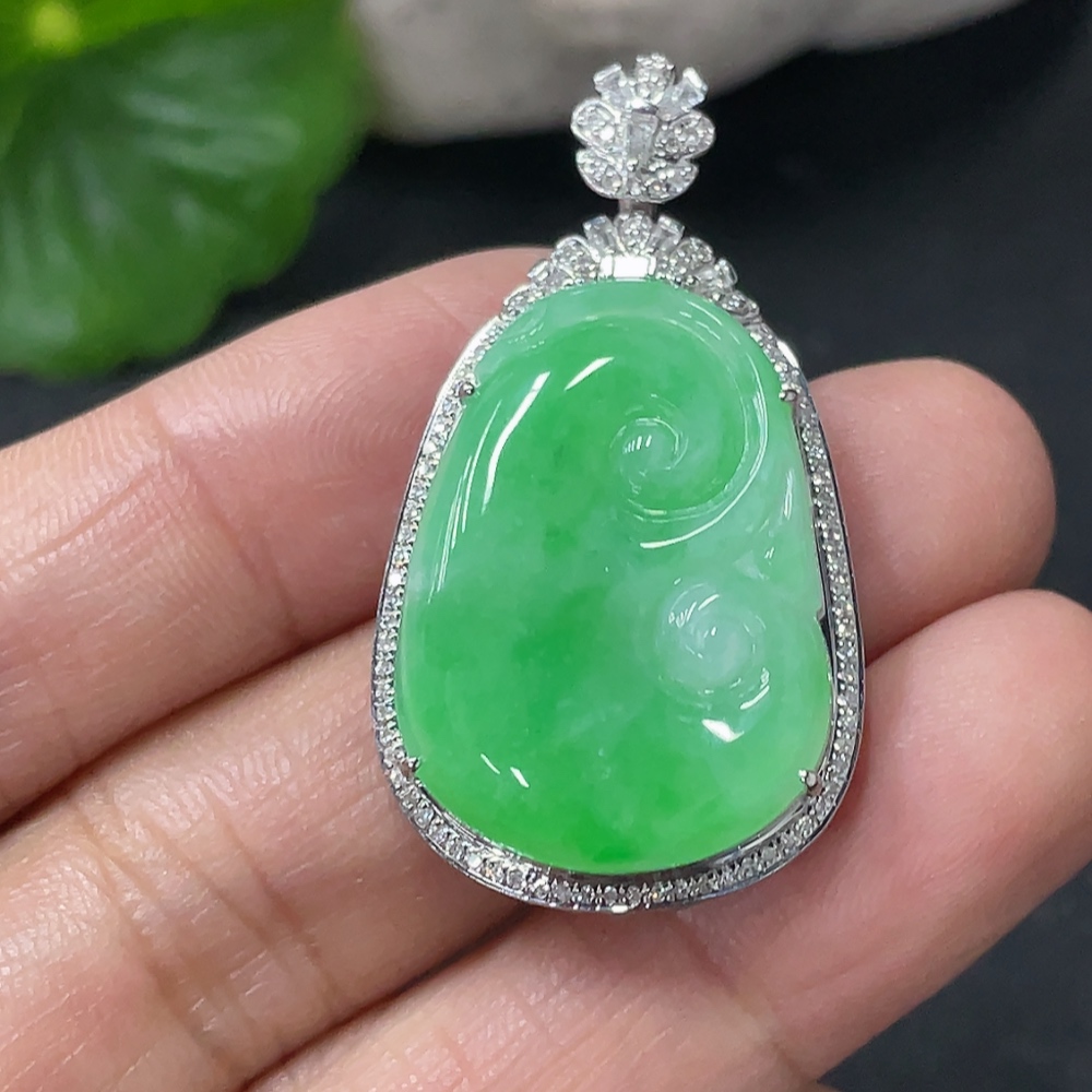 Jadeite Ruyi Inlaid Pendant 18k Gold Inlaid with Diamonds Total Weight Approximately 6.17g