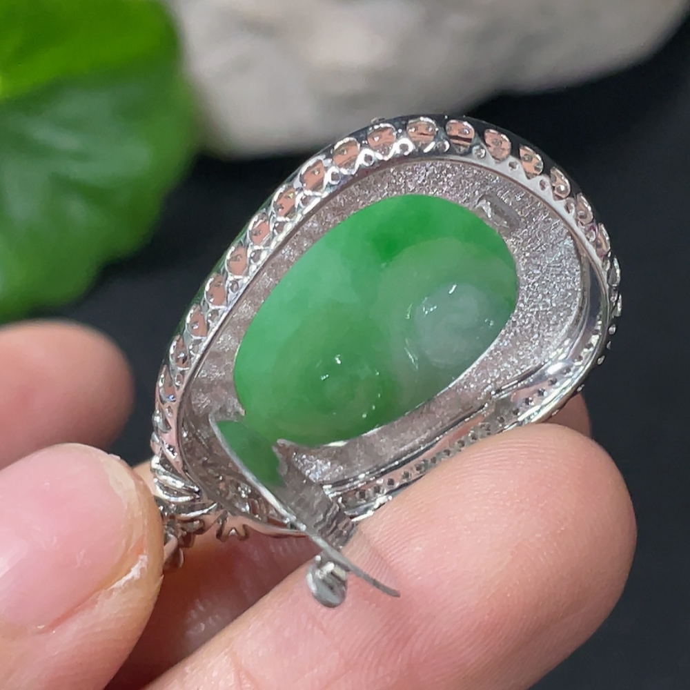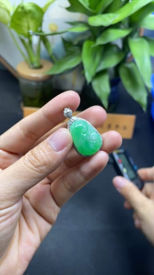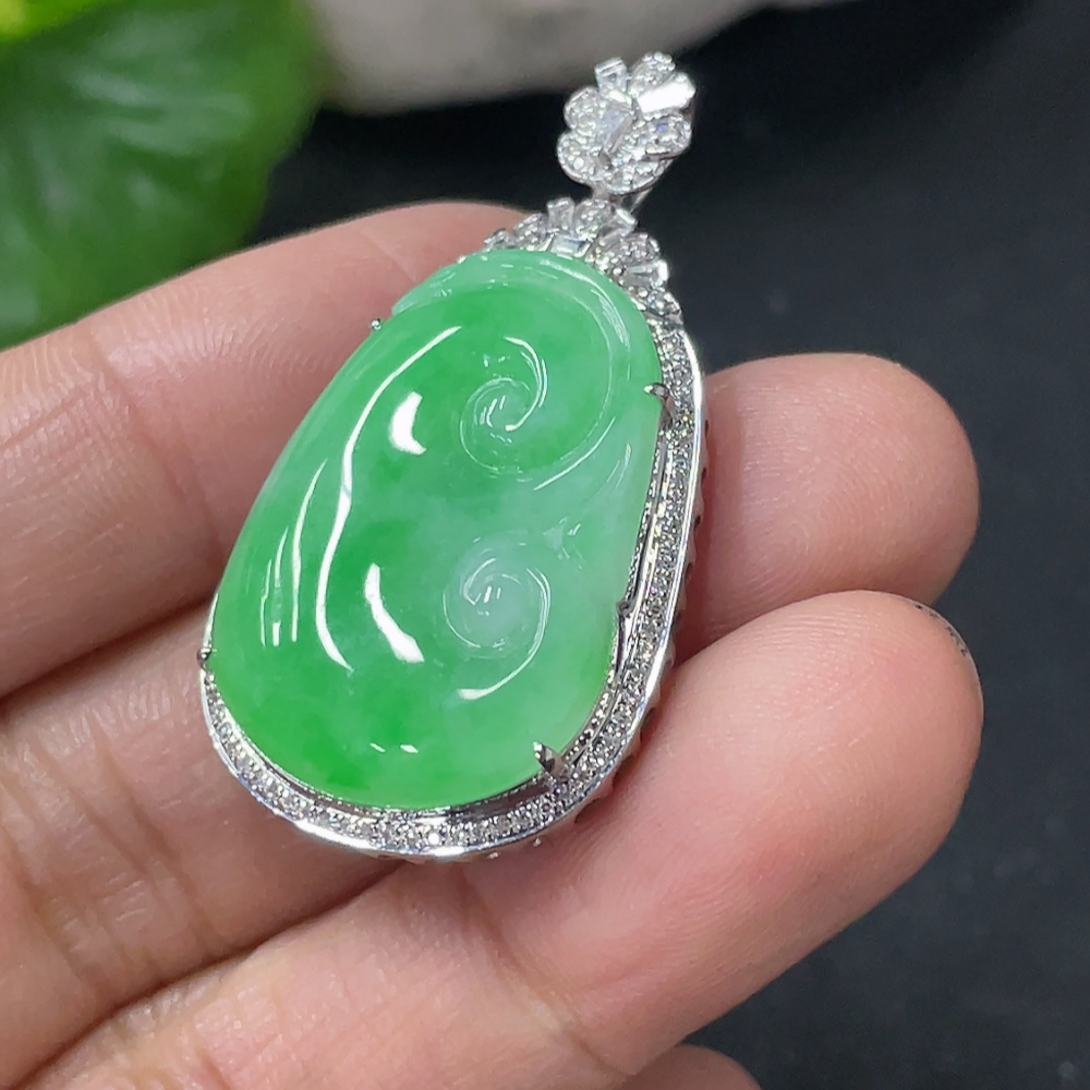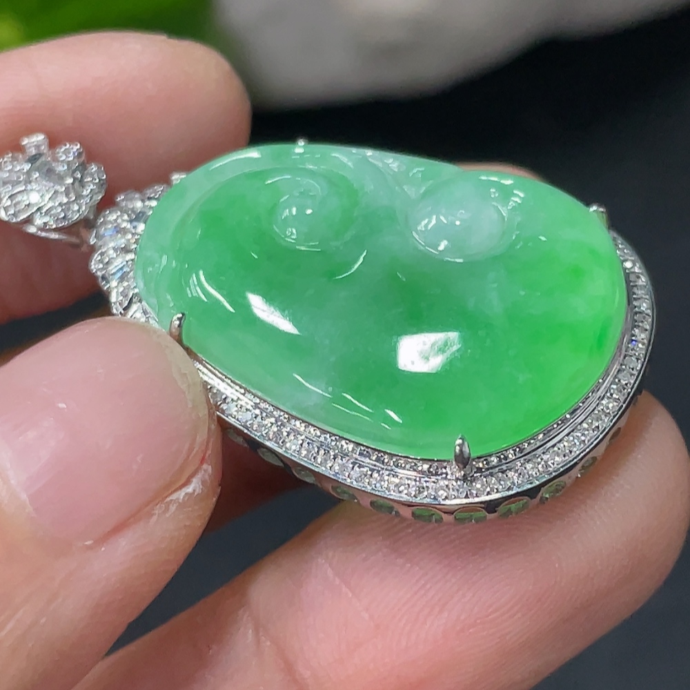 Jadeite Ruyi Inlaid Pendant 18k Gold Inlaid with Diamonds Total Weight Approximately 6.17g