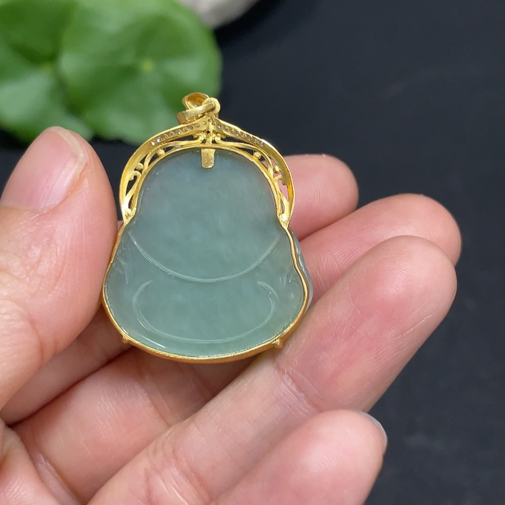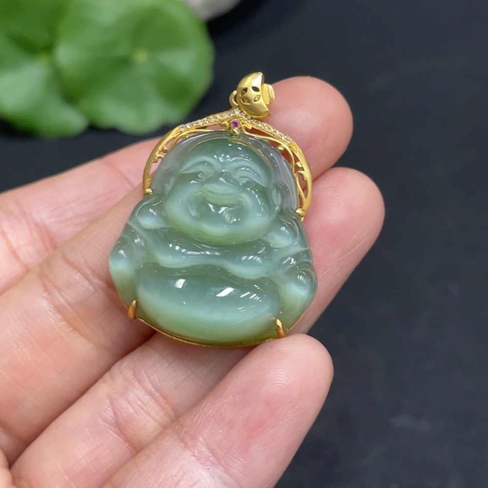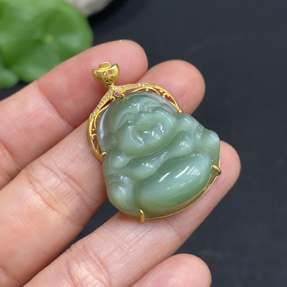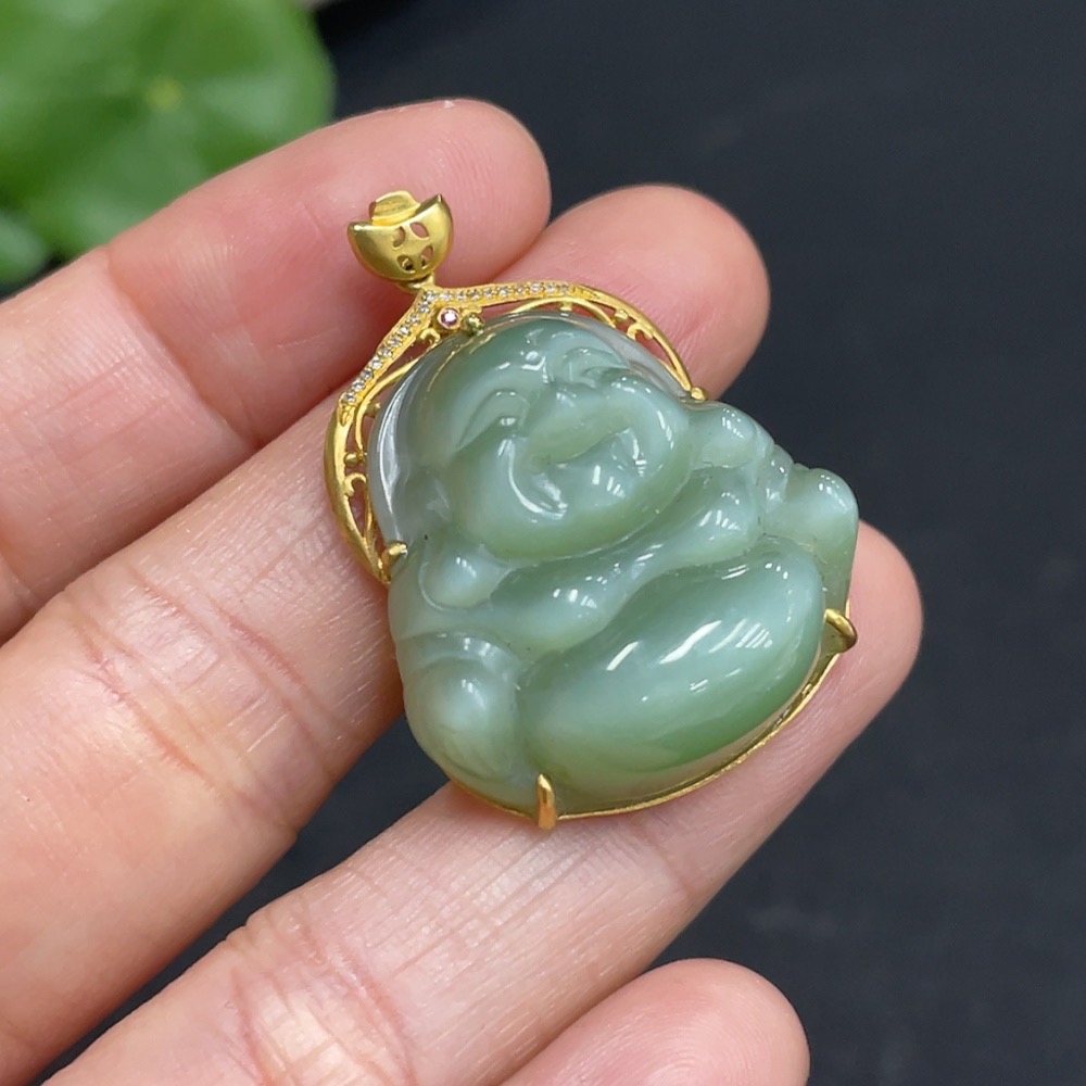 Hetian Jade Inlaid Pendant - Buddha, 18K Gold, with Diamond Accents (Colorless), Total Weight Approximately 8.5g