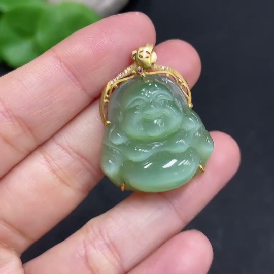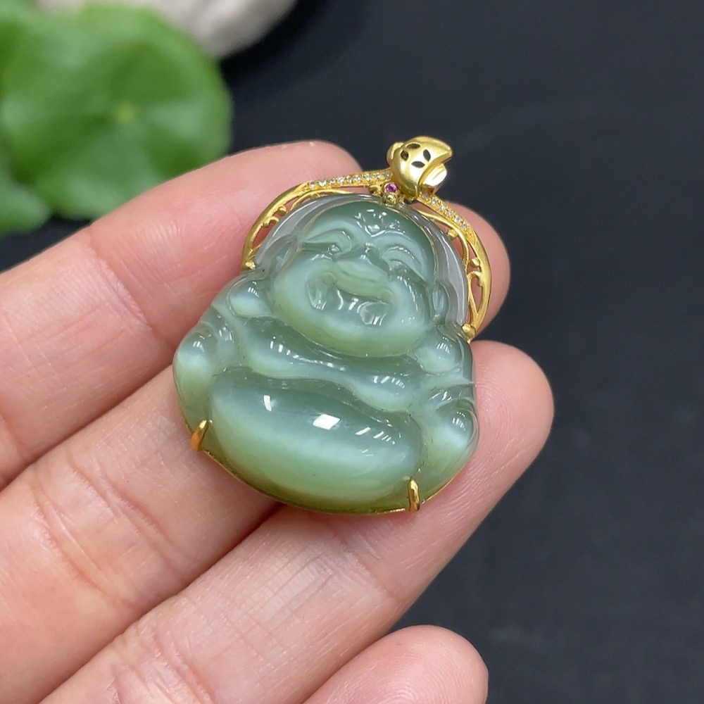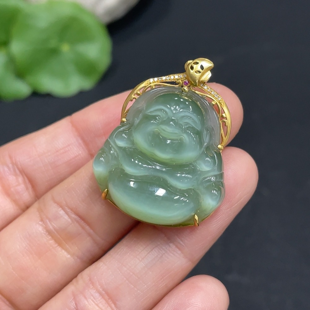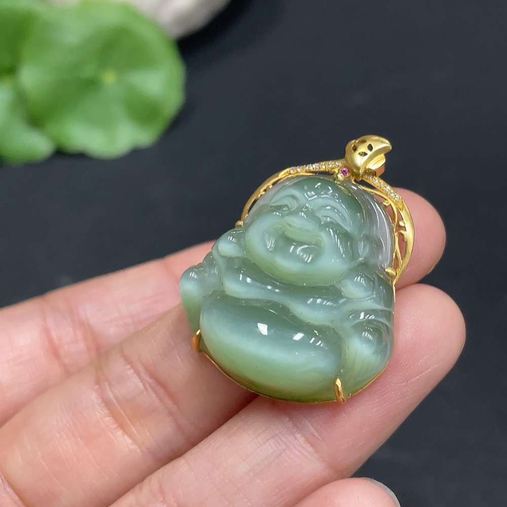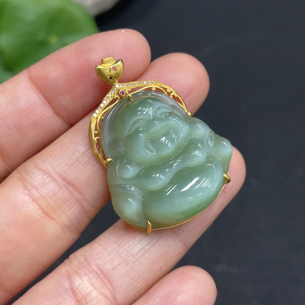 Hetian Jade Inlaid Pendant - Buddha, 18K Gold, with Diamond Accents (Colorless), Total Weight Approximately 8.5g