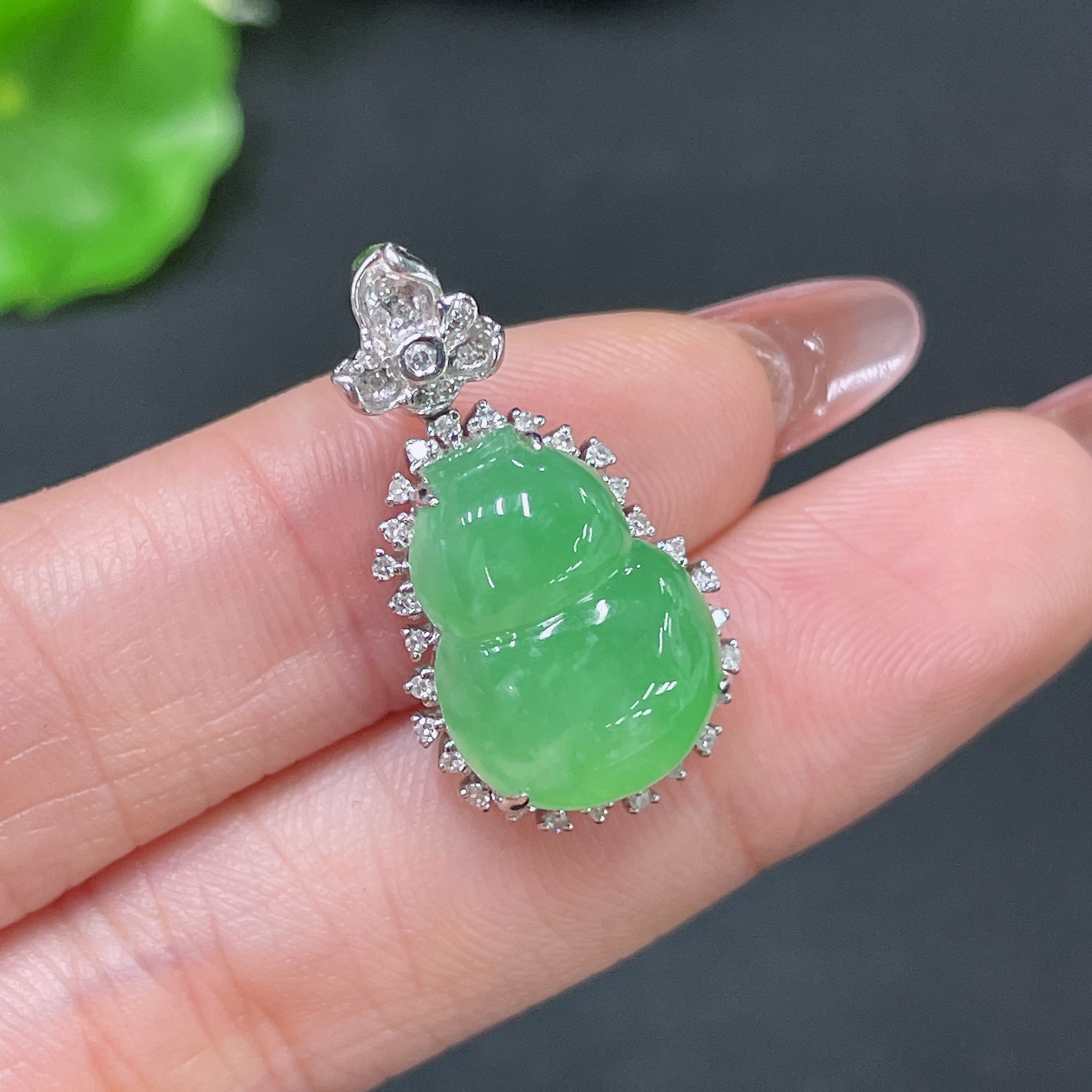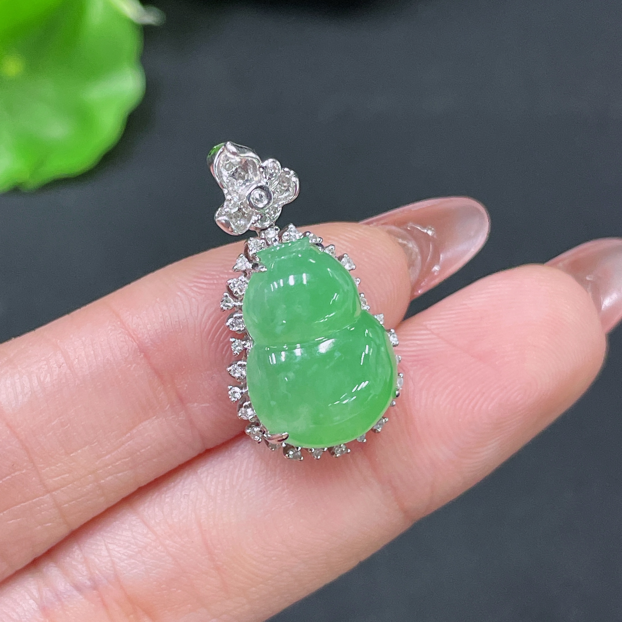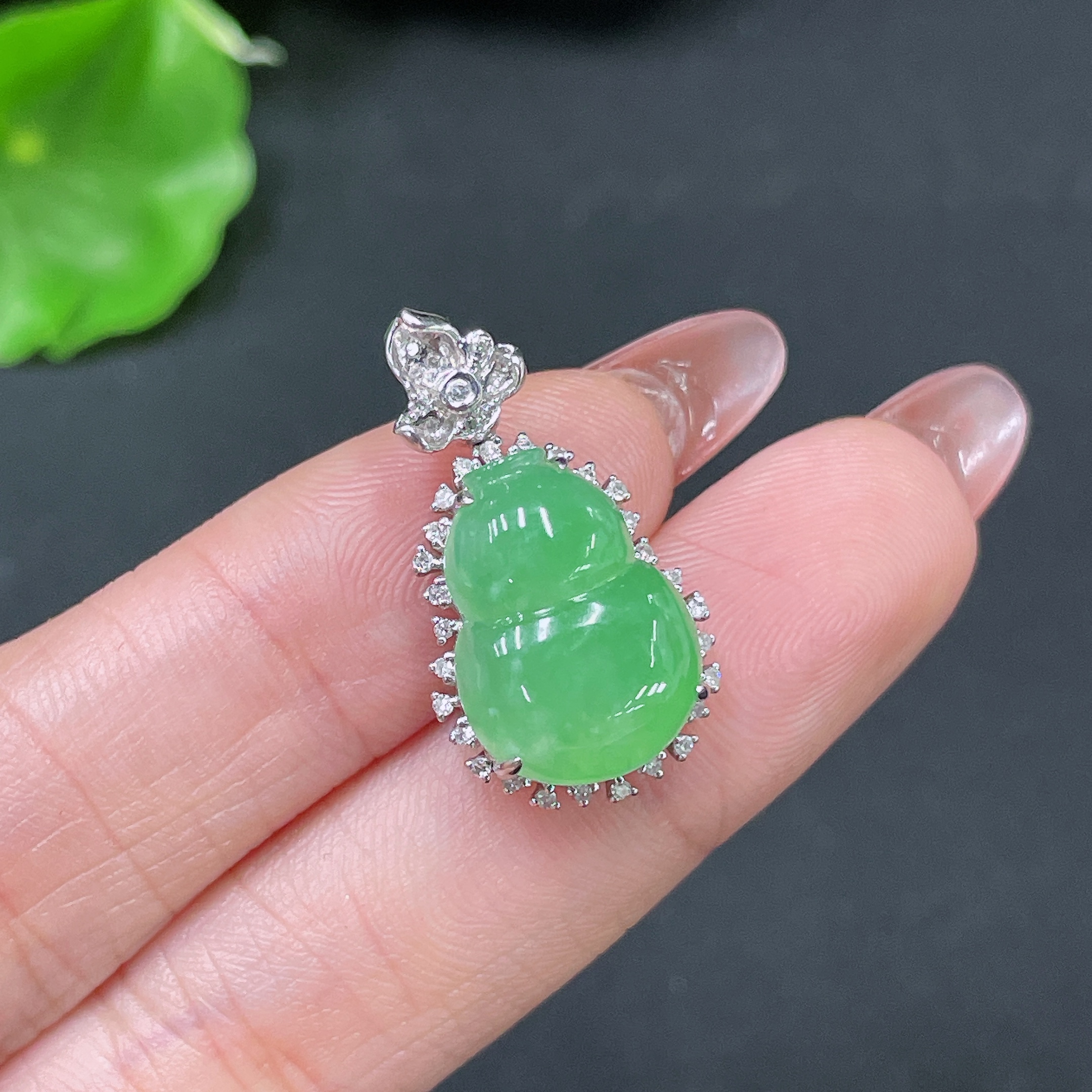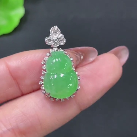 Jadeite Pendant Gourd 18k Gold Inlaid with Diamonds Total Weight Approx. 3.55g