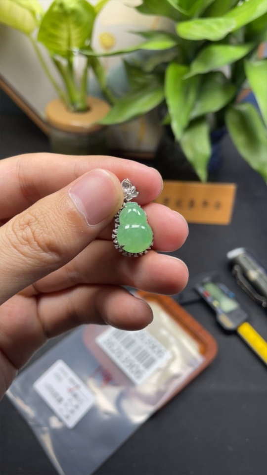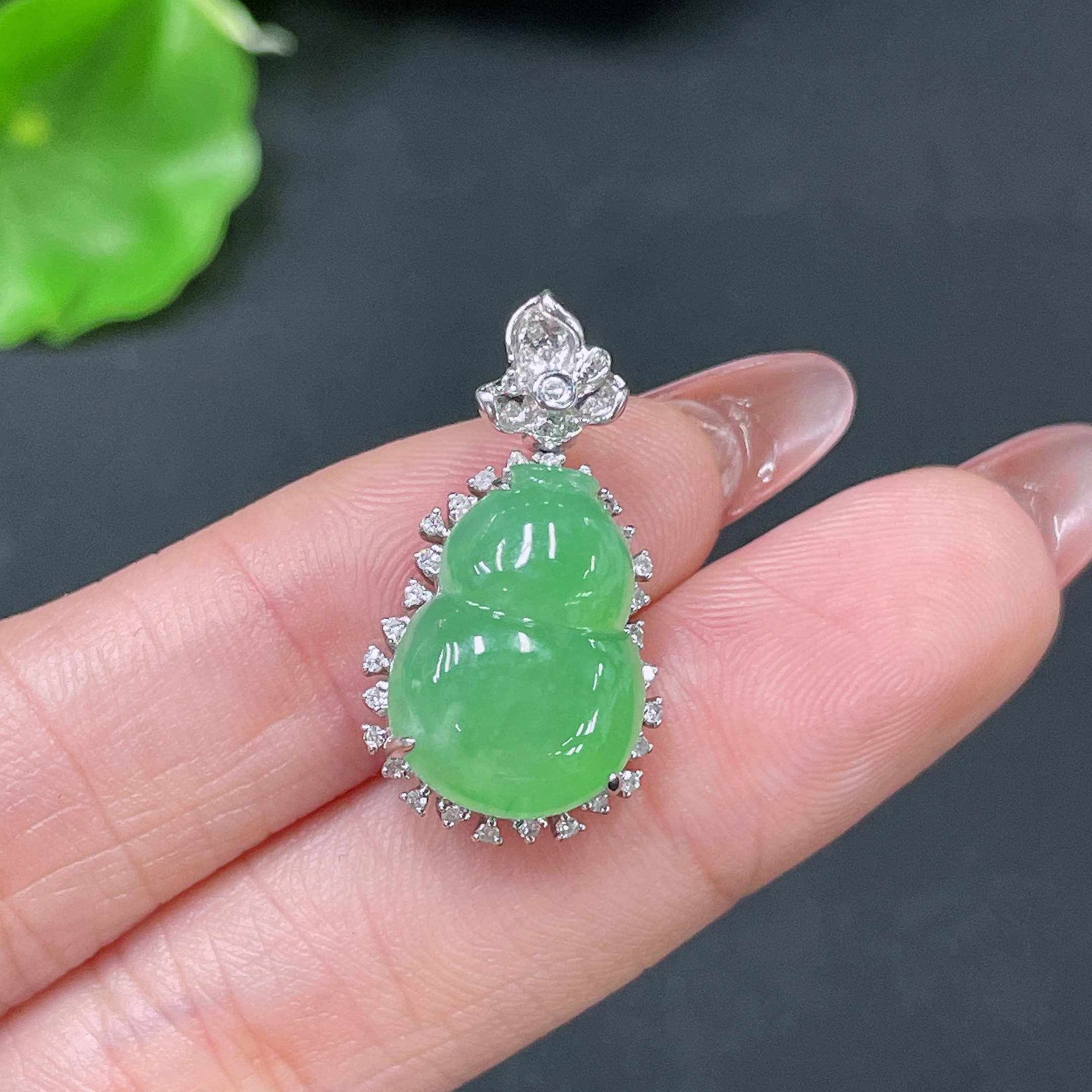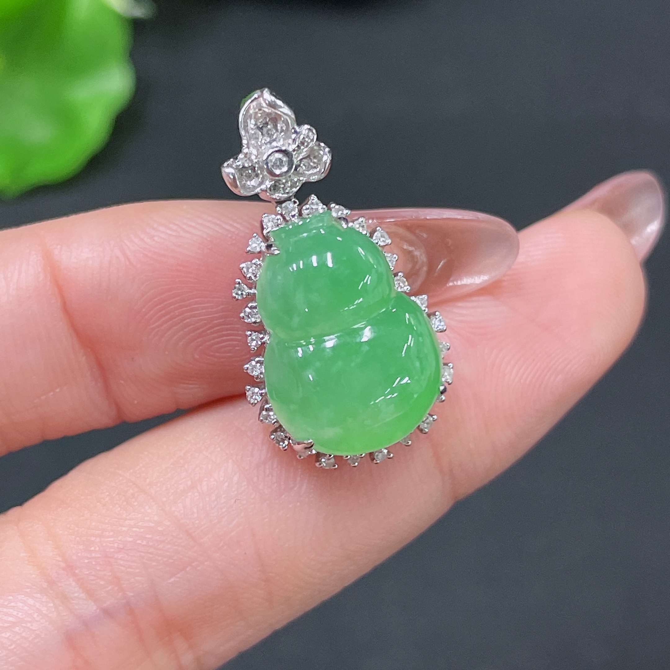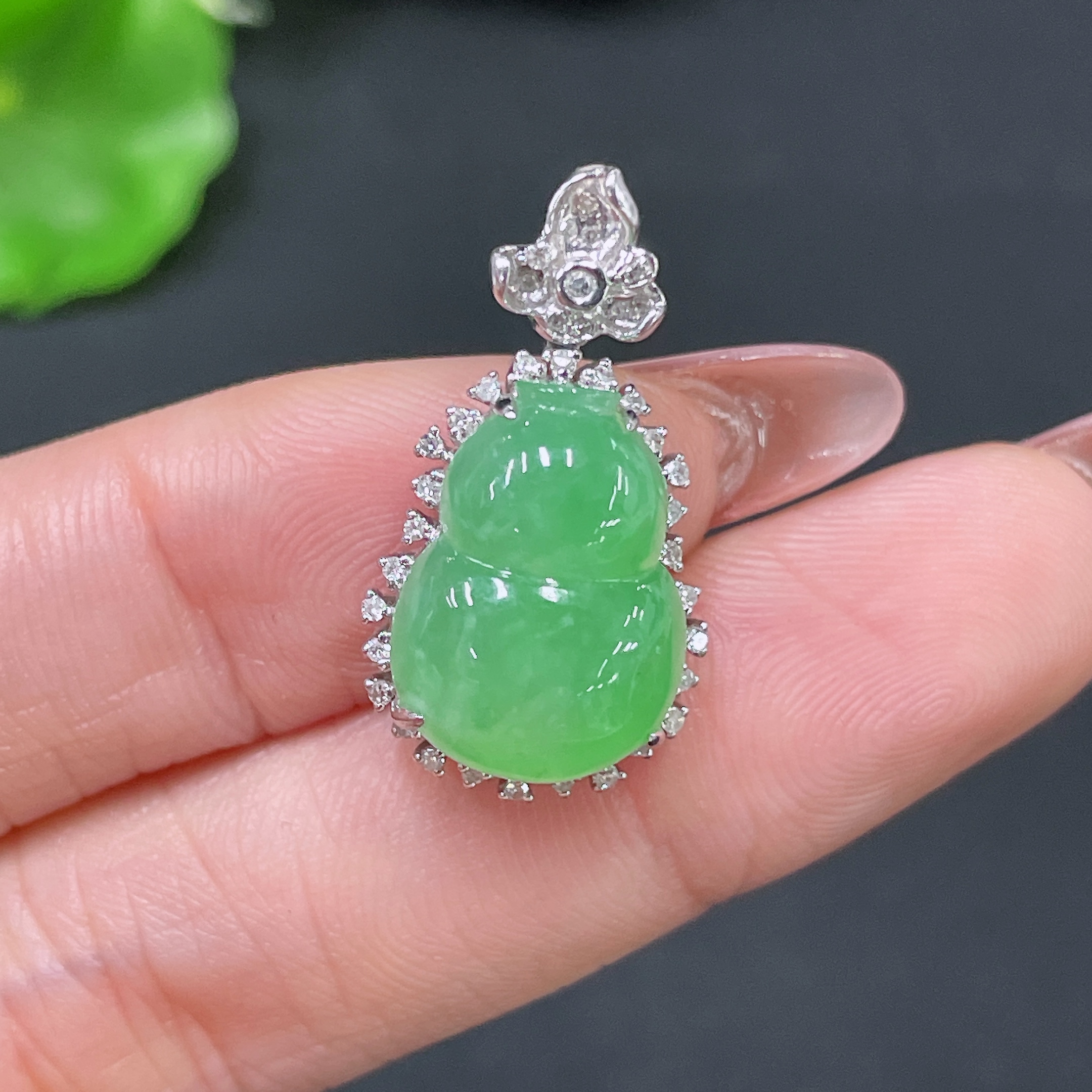 Jadeite Pendant Gourd 18k Gold Inlaid with Diamonds Total Weight Approx. 3.55g