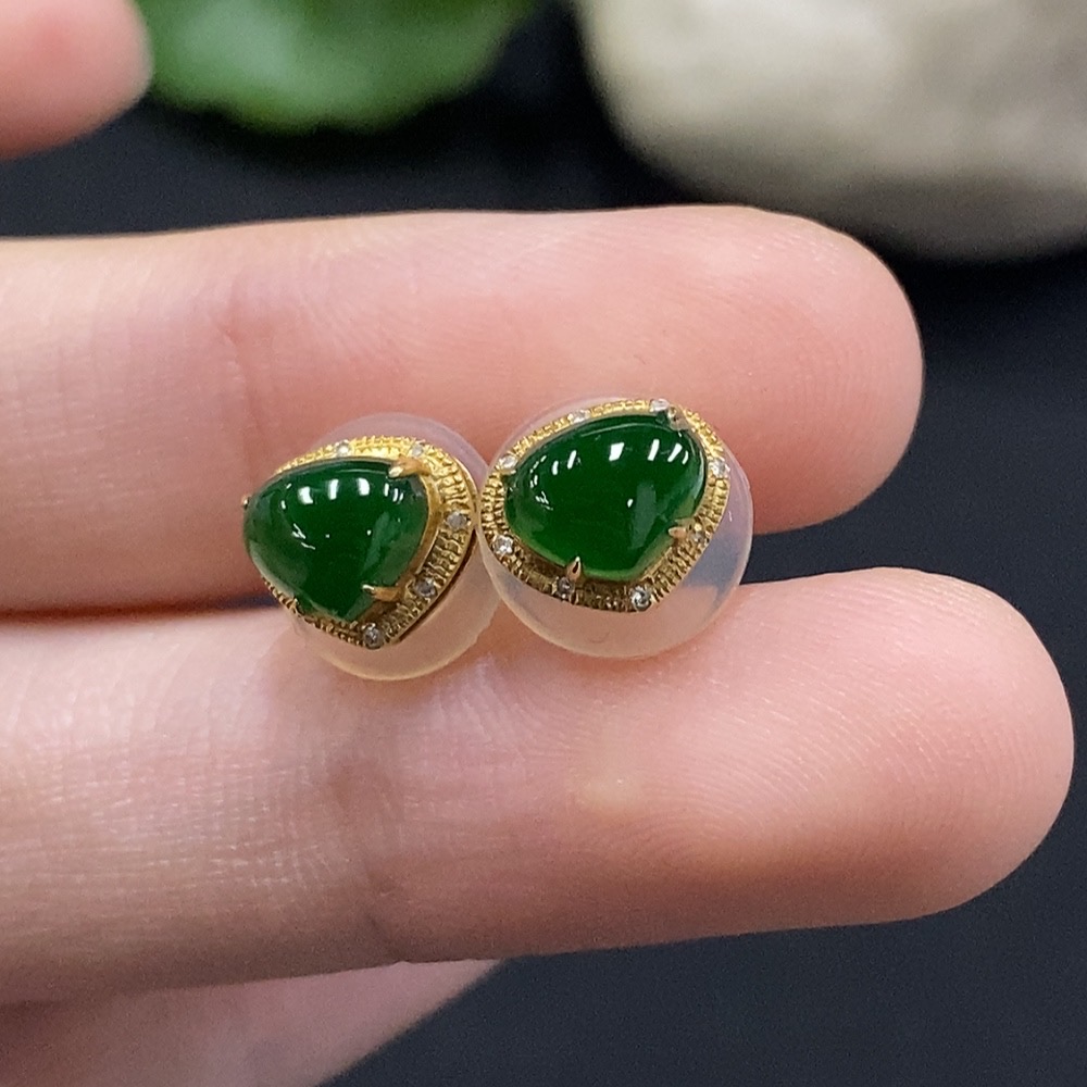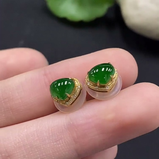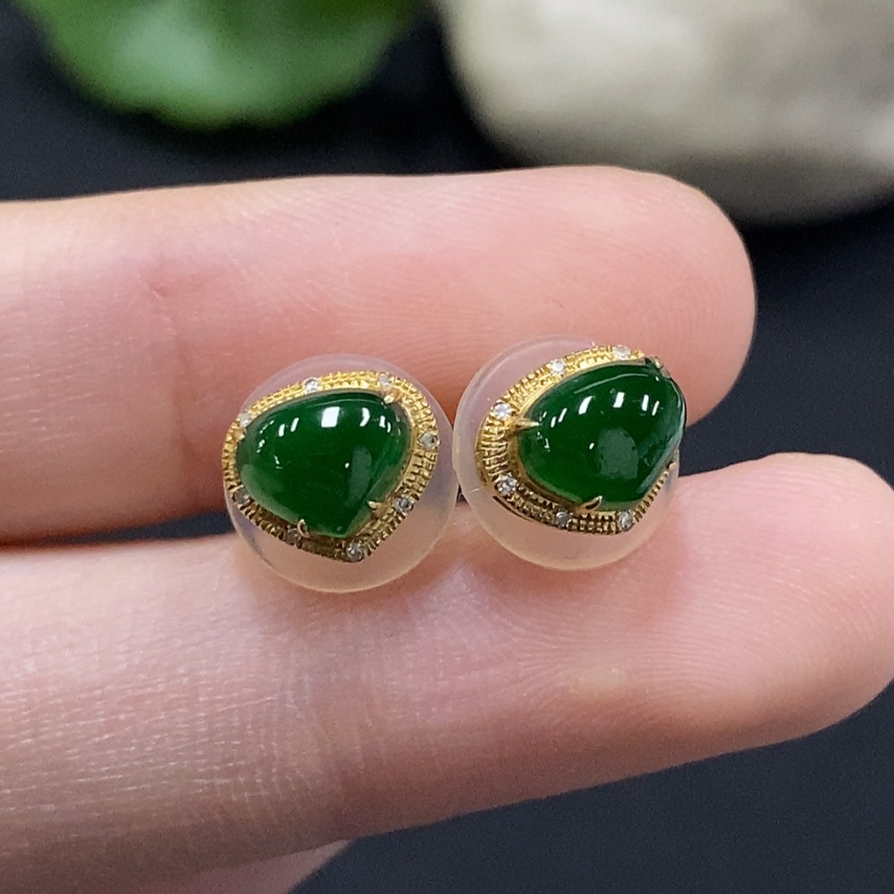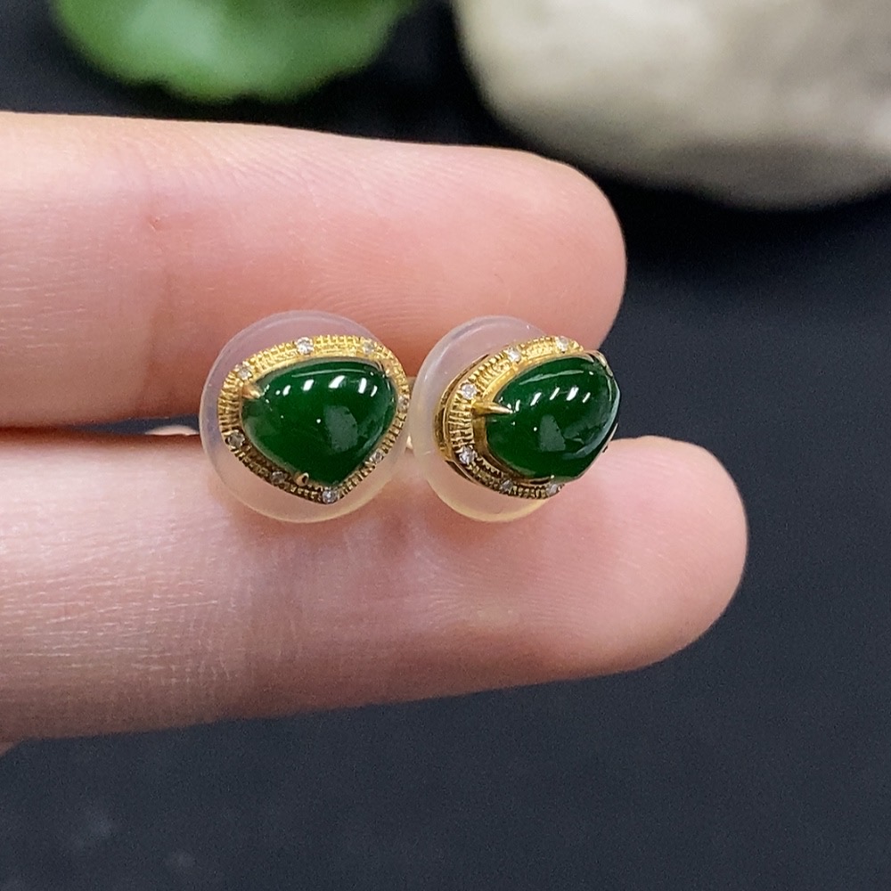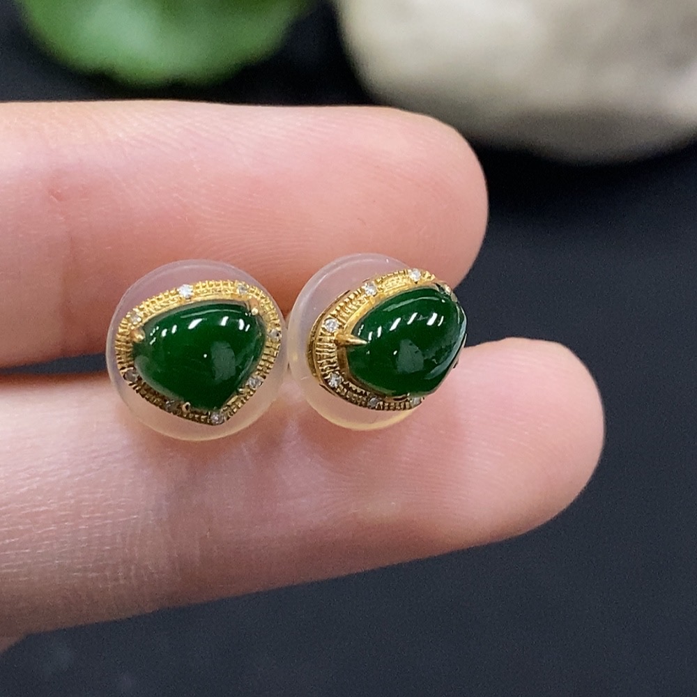 Jadeite earrings set in 18K gold with diamond accents, total weight approximately 1.69g including ear stoppers