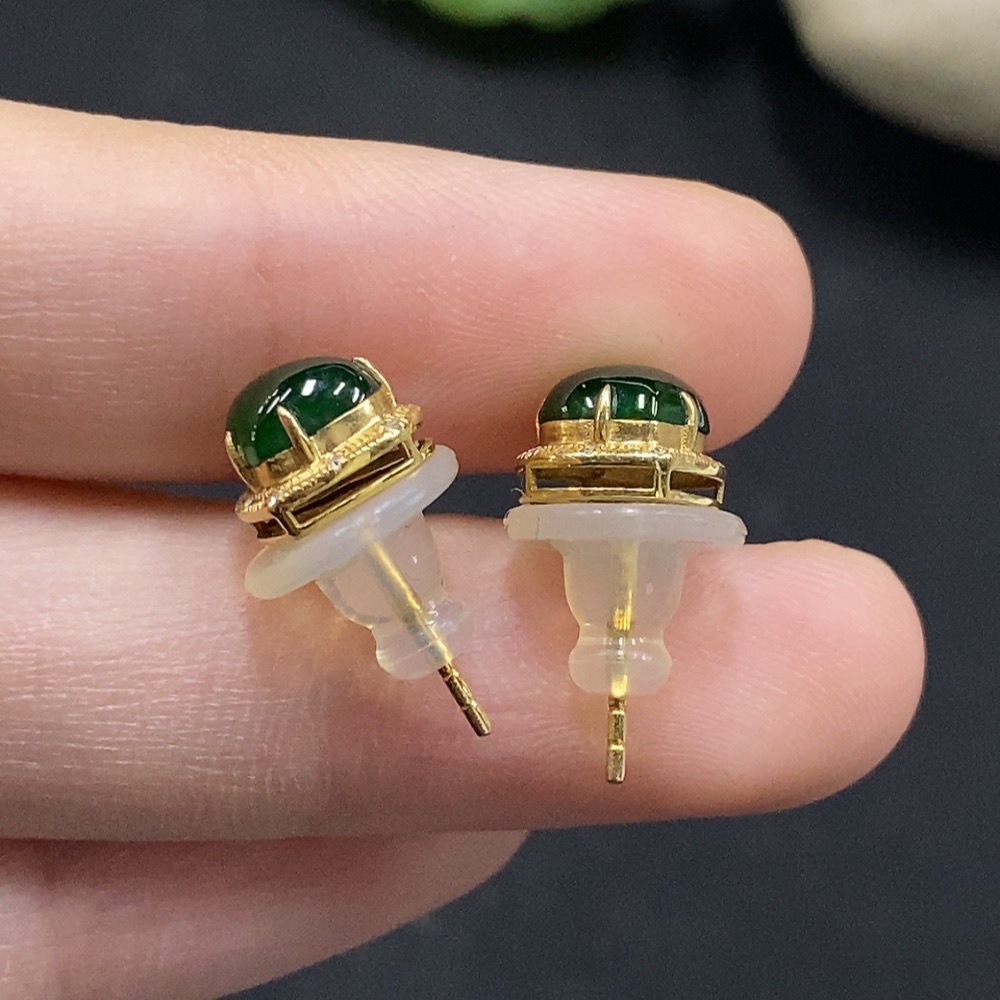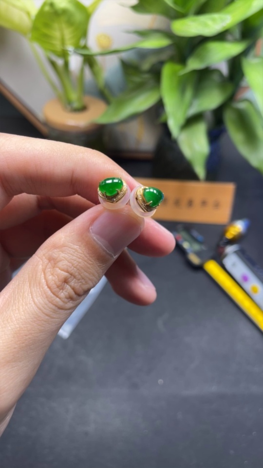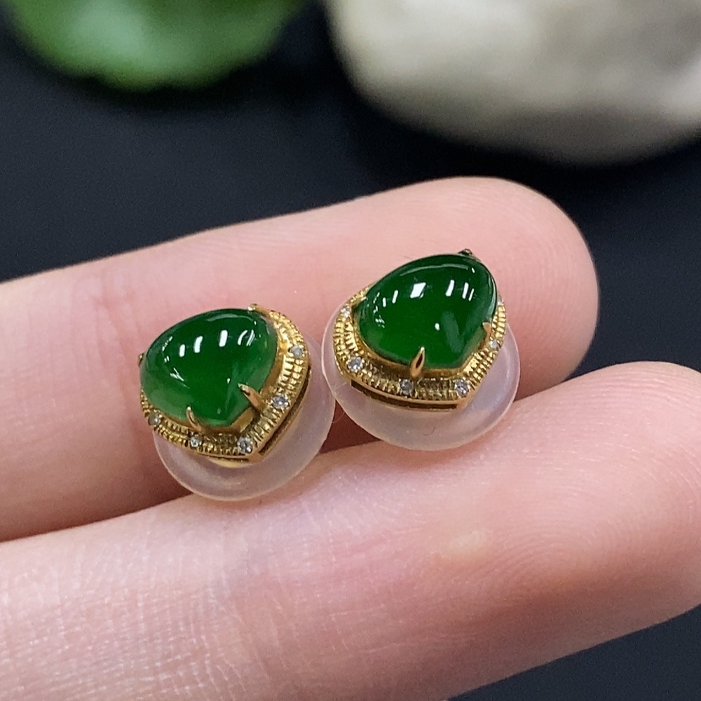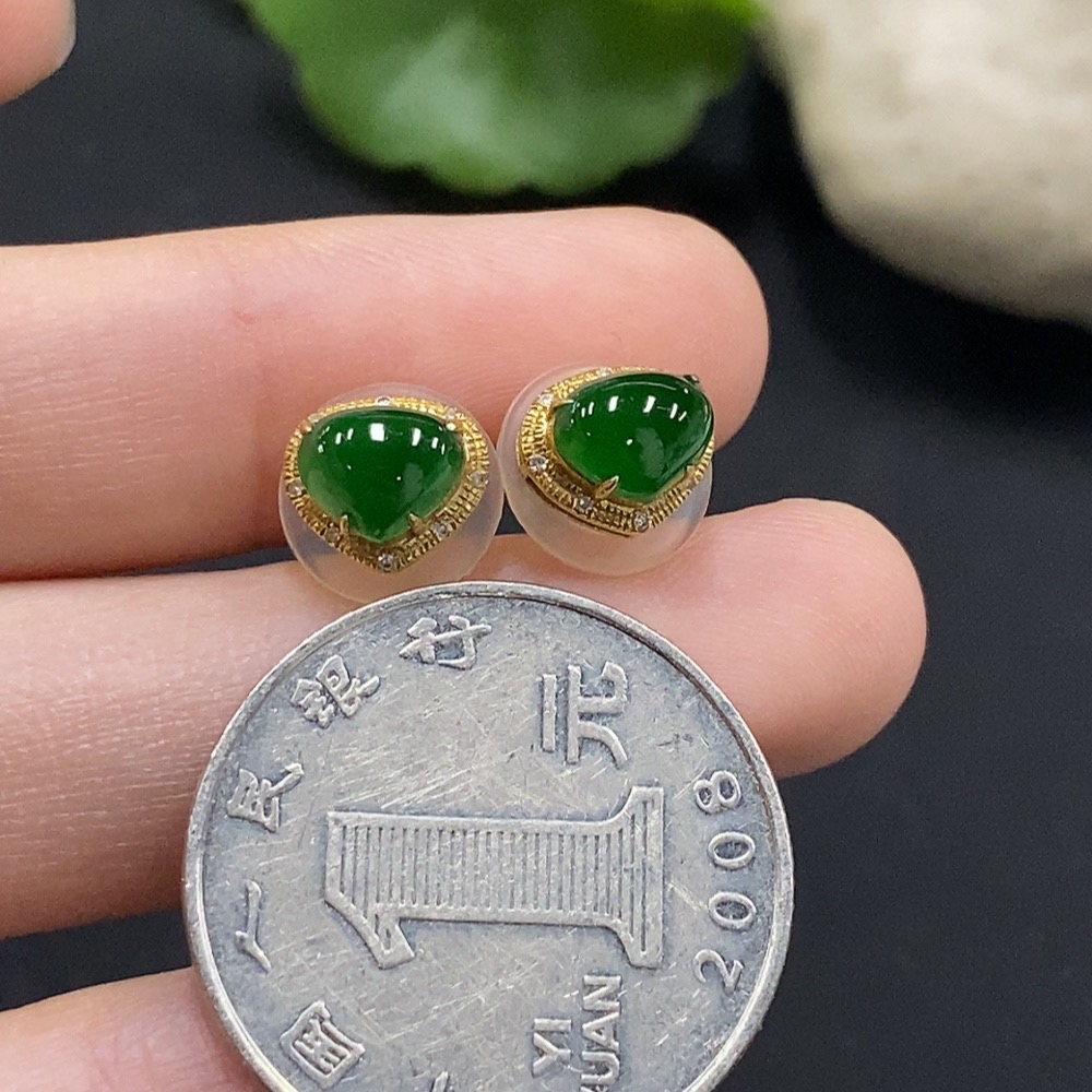 Jadeite earrings set in 18K gold with diamond accents, total weight approximately 1.69g including ear stoppers