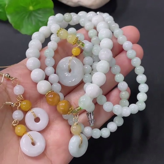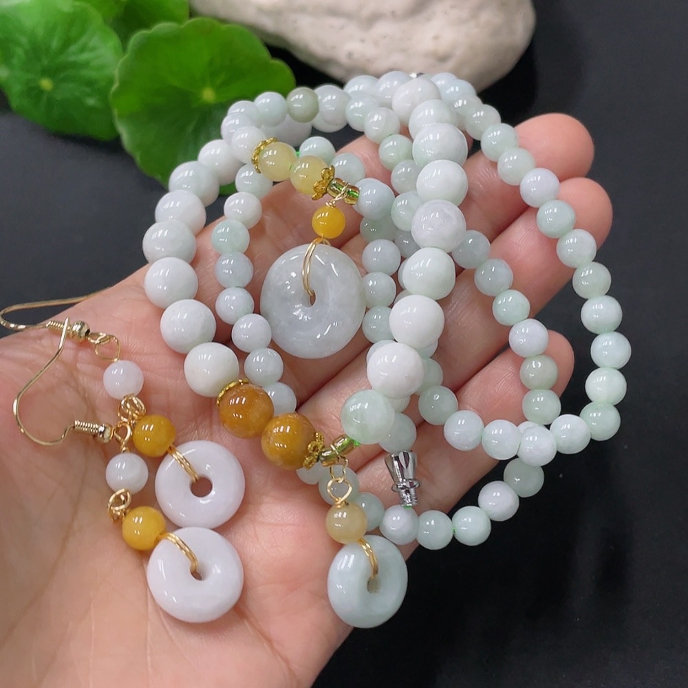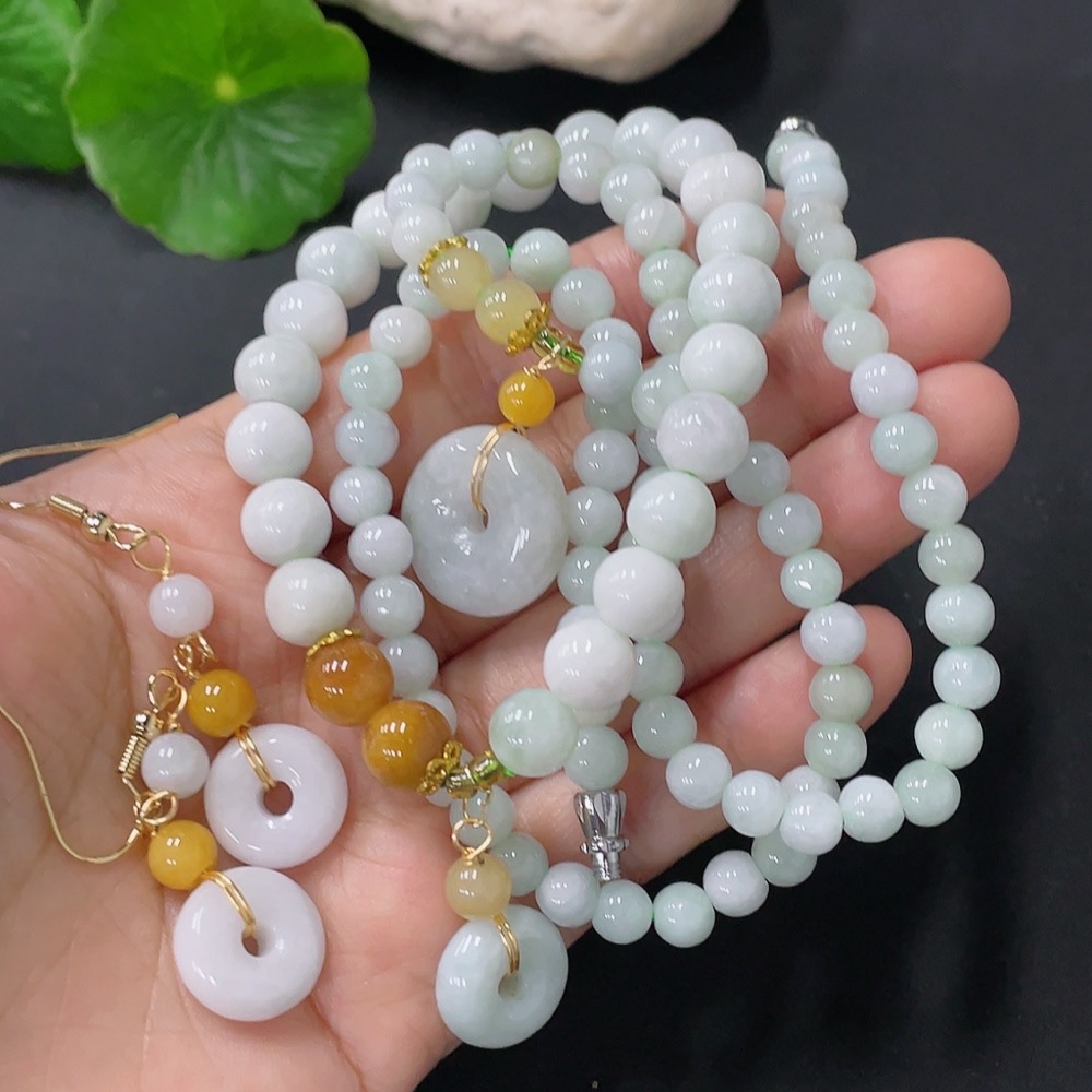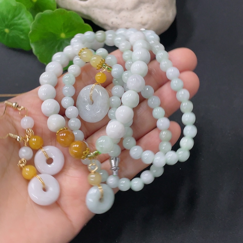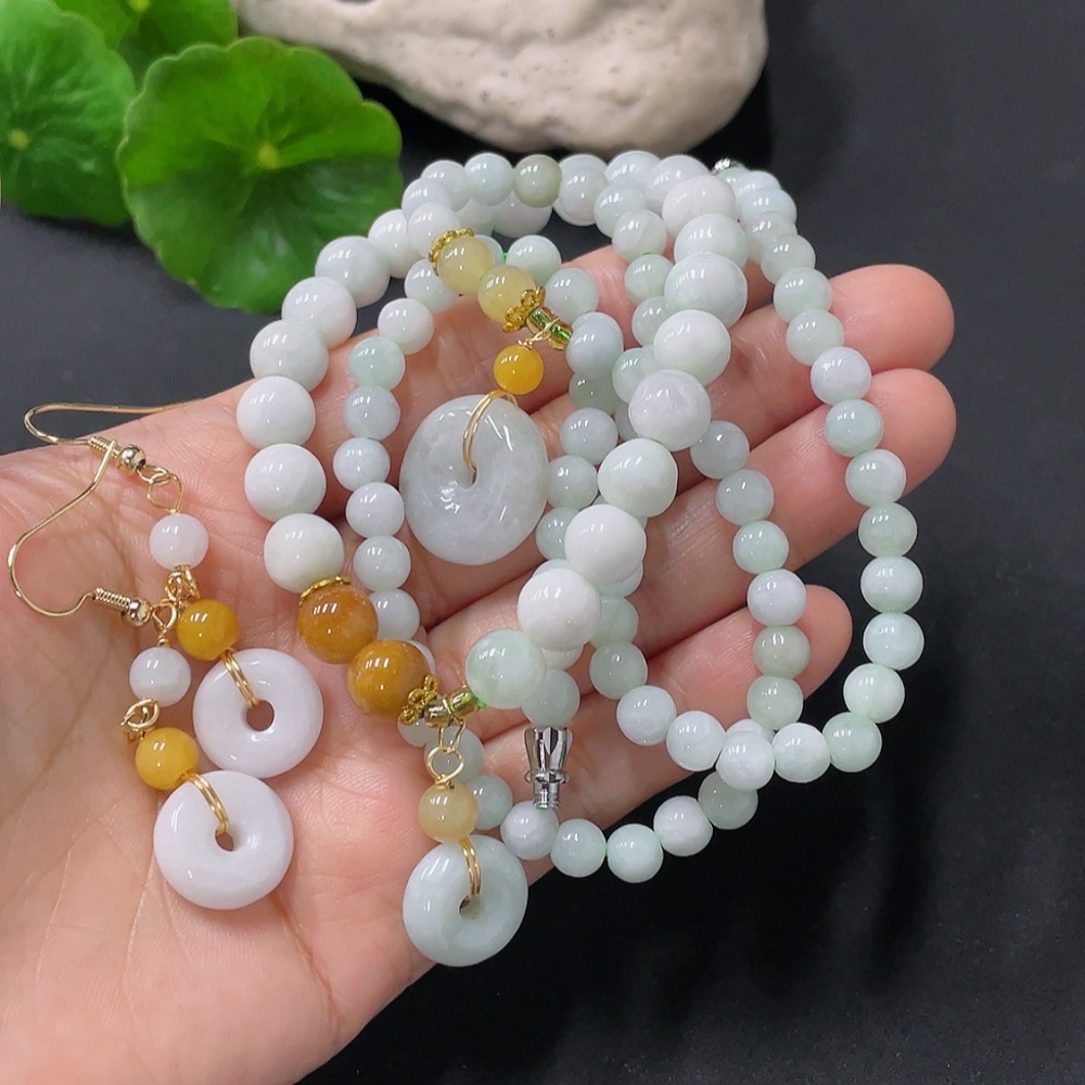 Jadeite Bead Necklace Bracelet Earring Set Sell as a Lot Non-Gold Yellow Bead Non-A