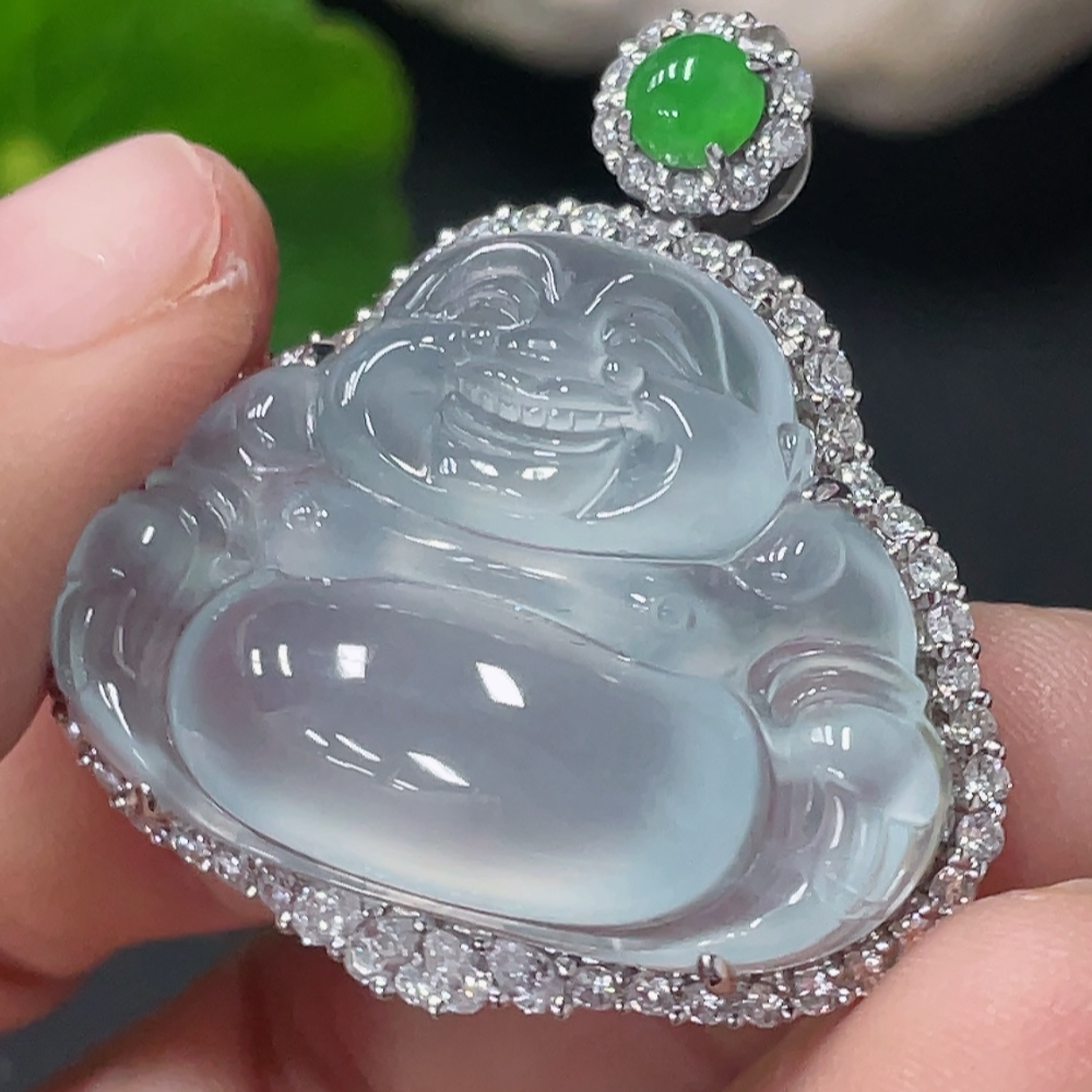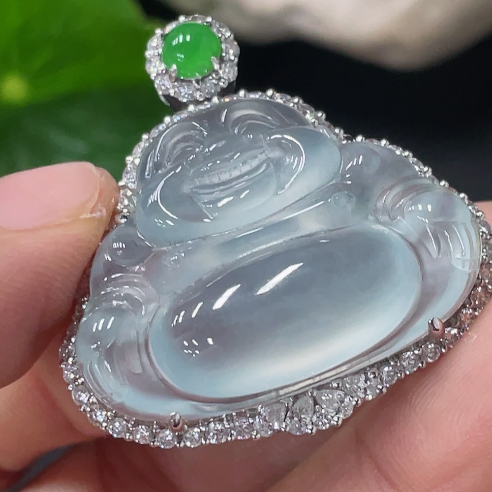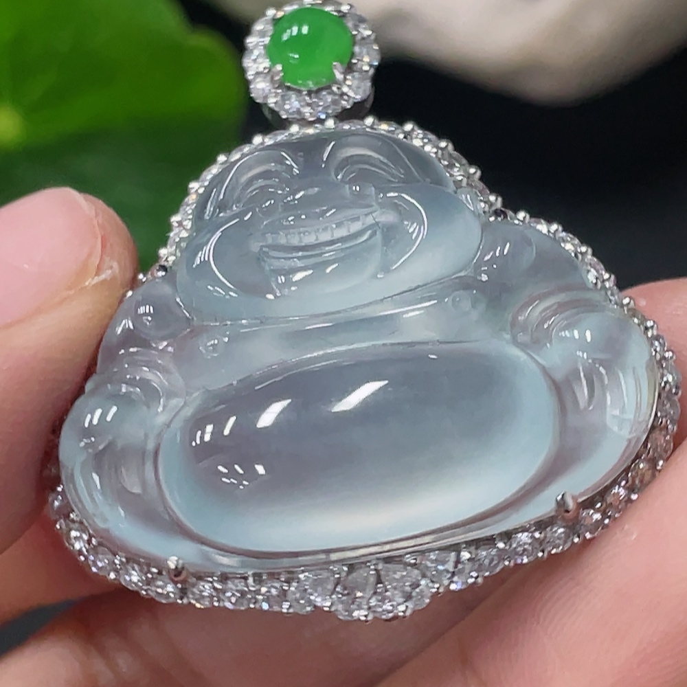 Jadeite Buddha Pendant with 18K Gold Setting and Diamond Accents, Total Weight Approx. 9.95g