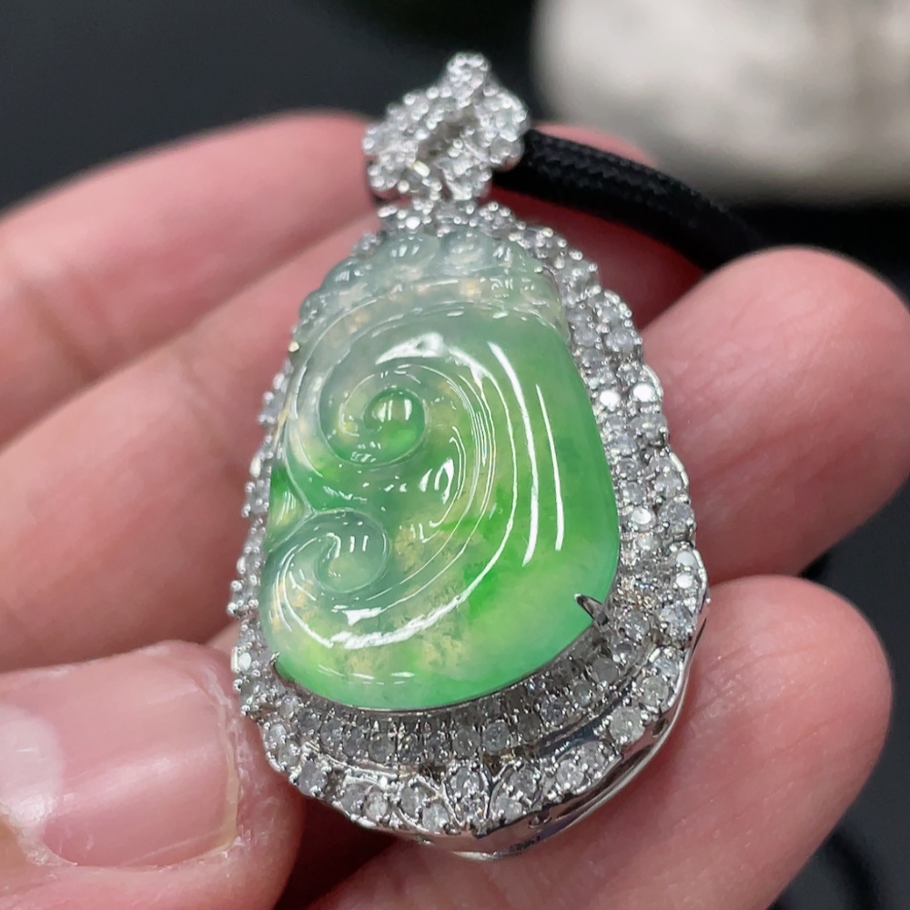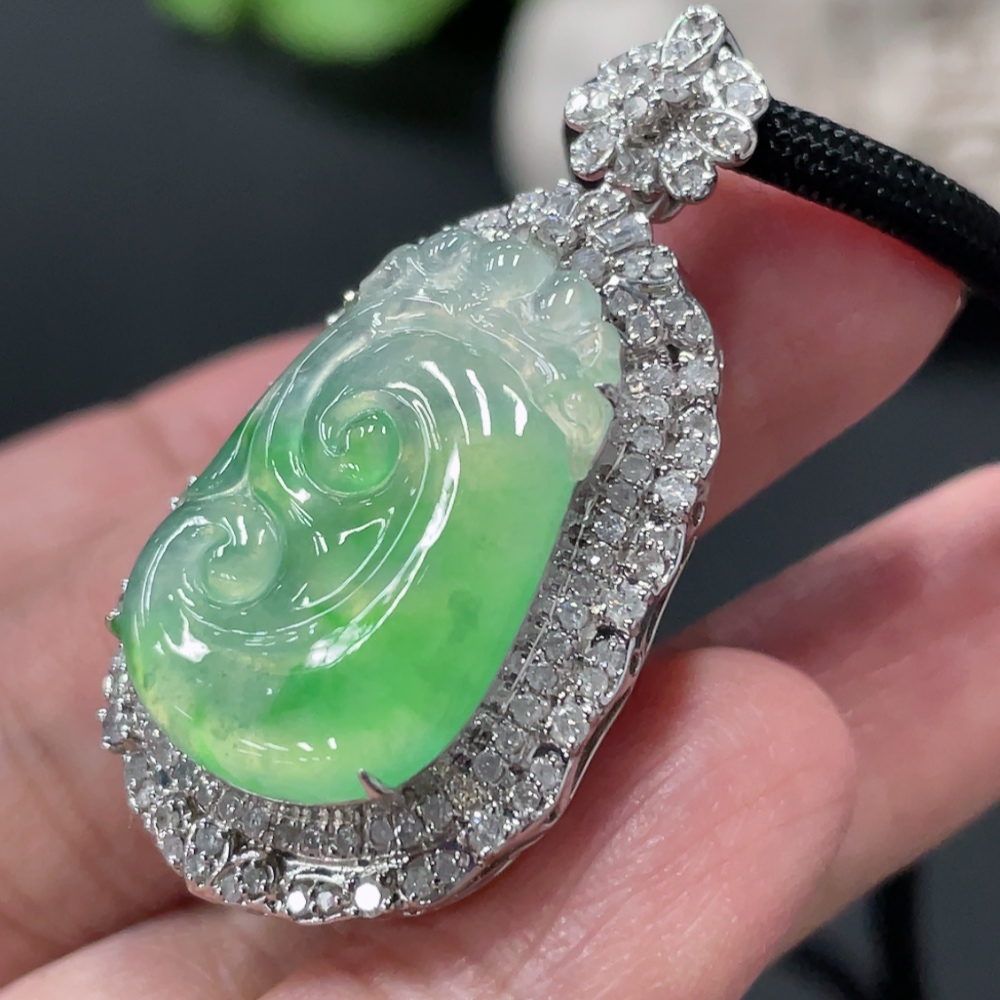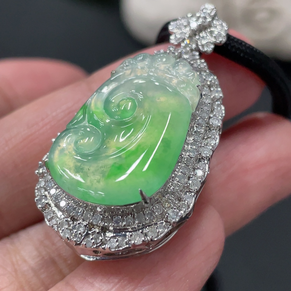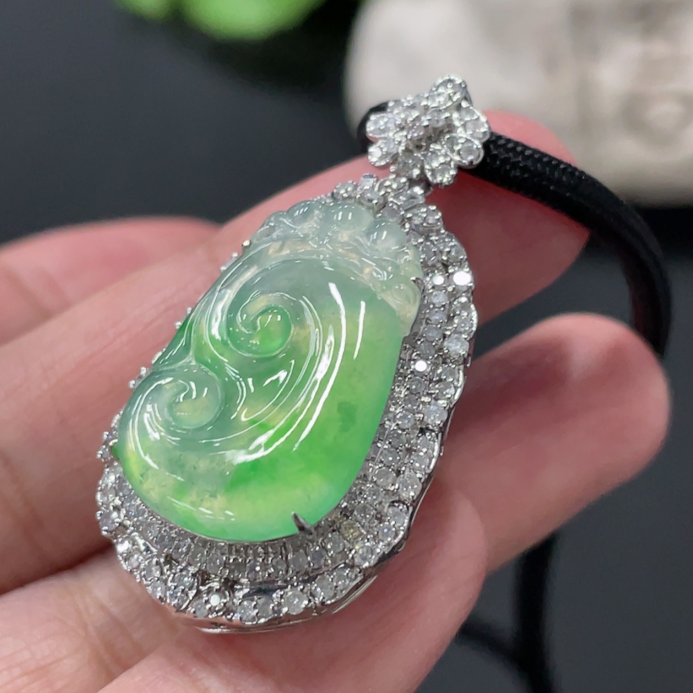 Jadeite Ruyi Inlaid Pendant with 18K Gold and Diamond Accents, Total Weight Including Rope Approximately 10.76g
