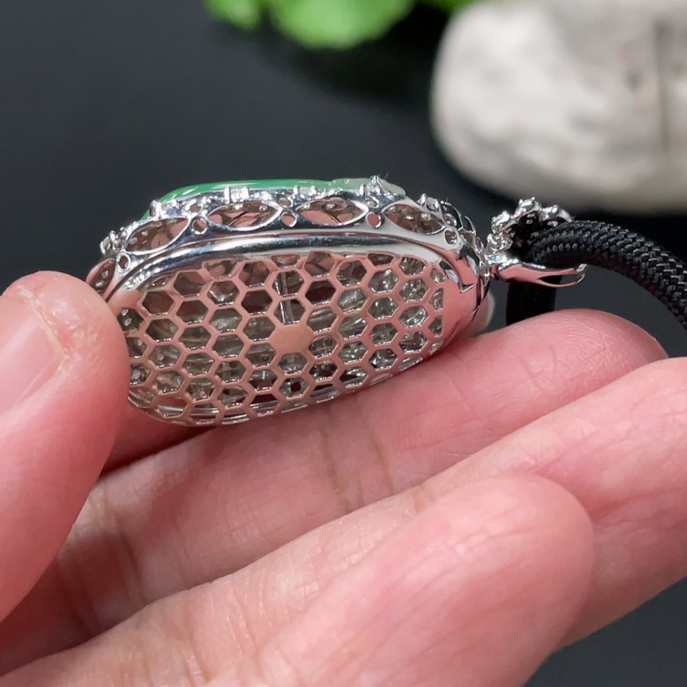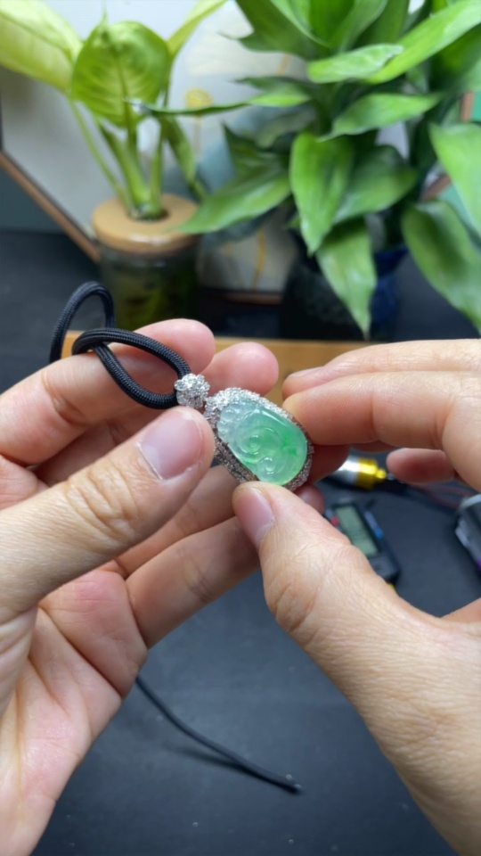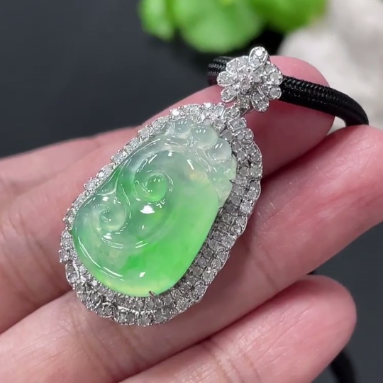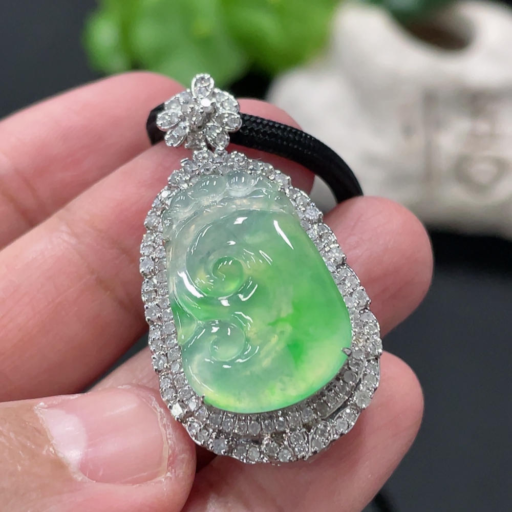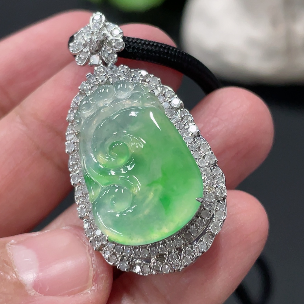 Jadeite Ruyi Inlaid Pendant with 18K Gold and Diamond Accents, Total Weight Including Rope Approximately 10.76g