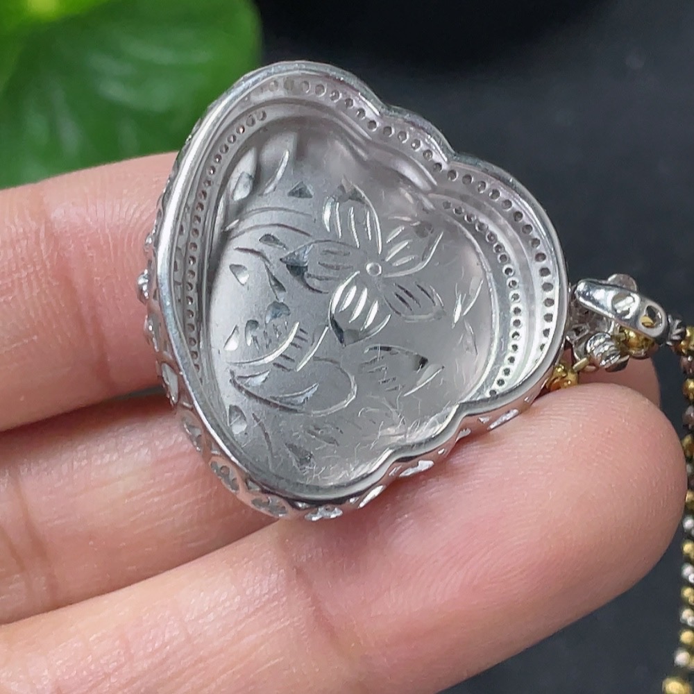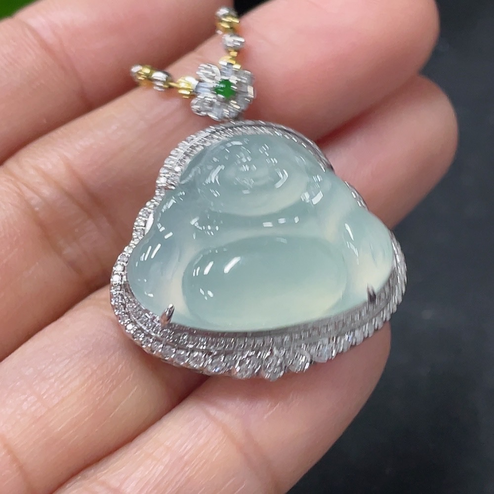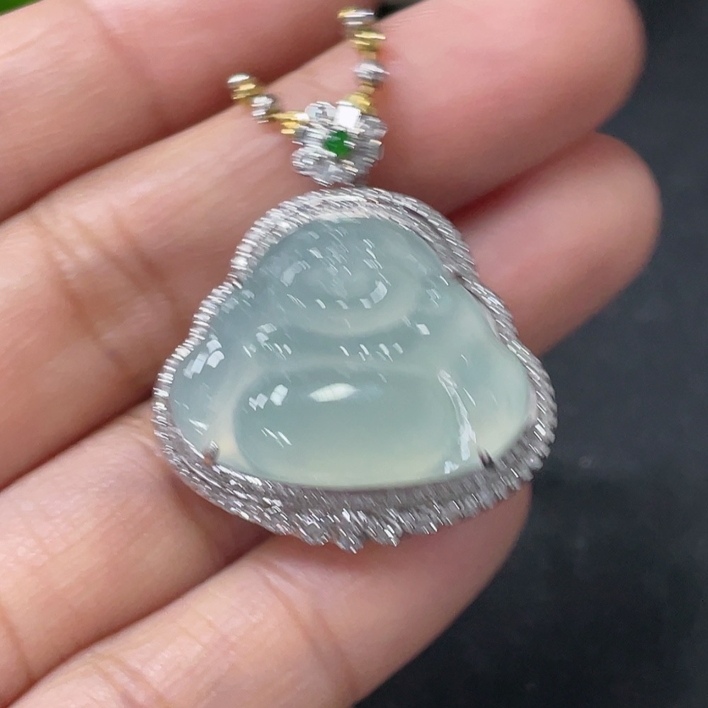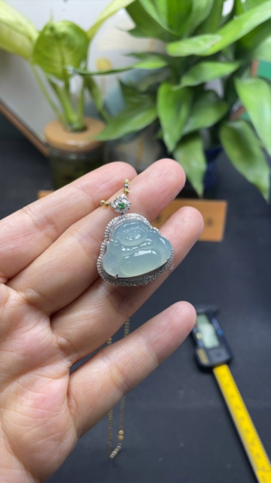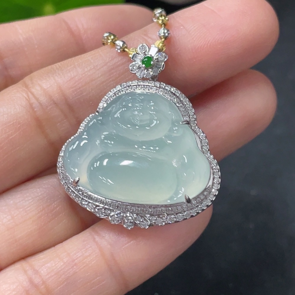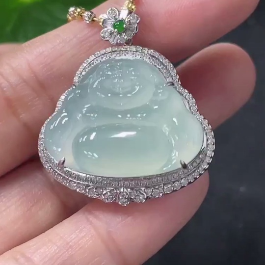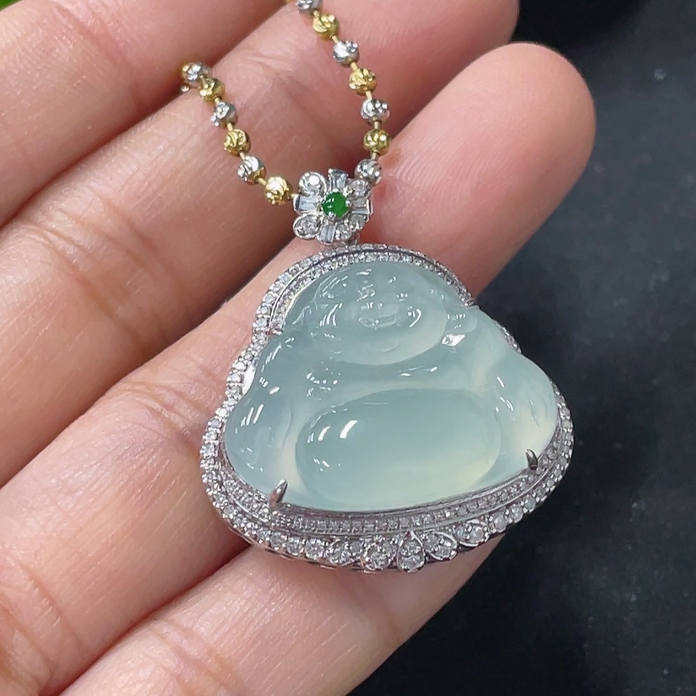 Jadeite Inlaid Buddha Pendant with 18k Gold and Diamond Accents, Total Weight Approximately 10.44g Including Chain