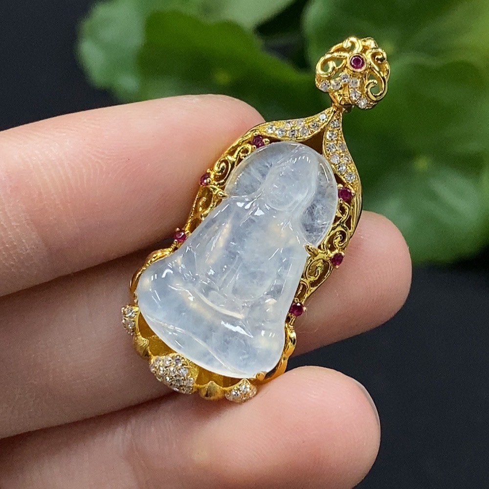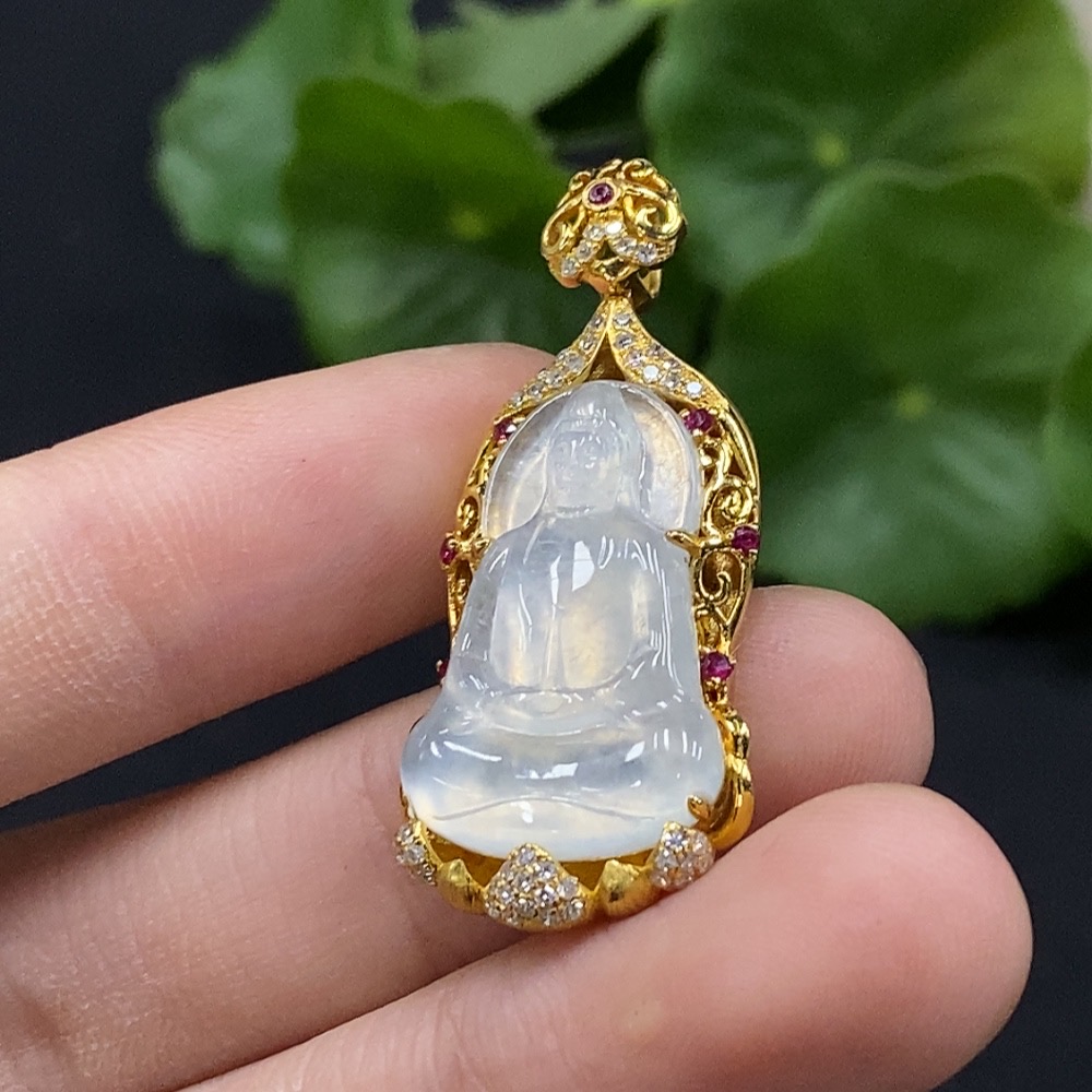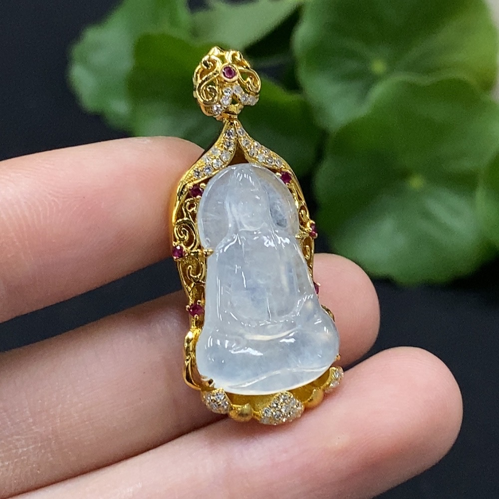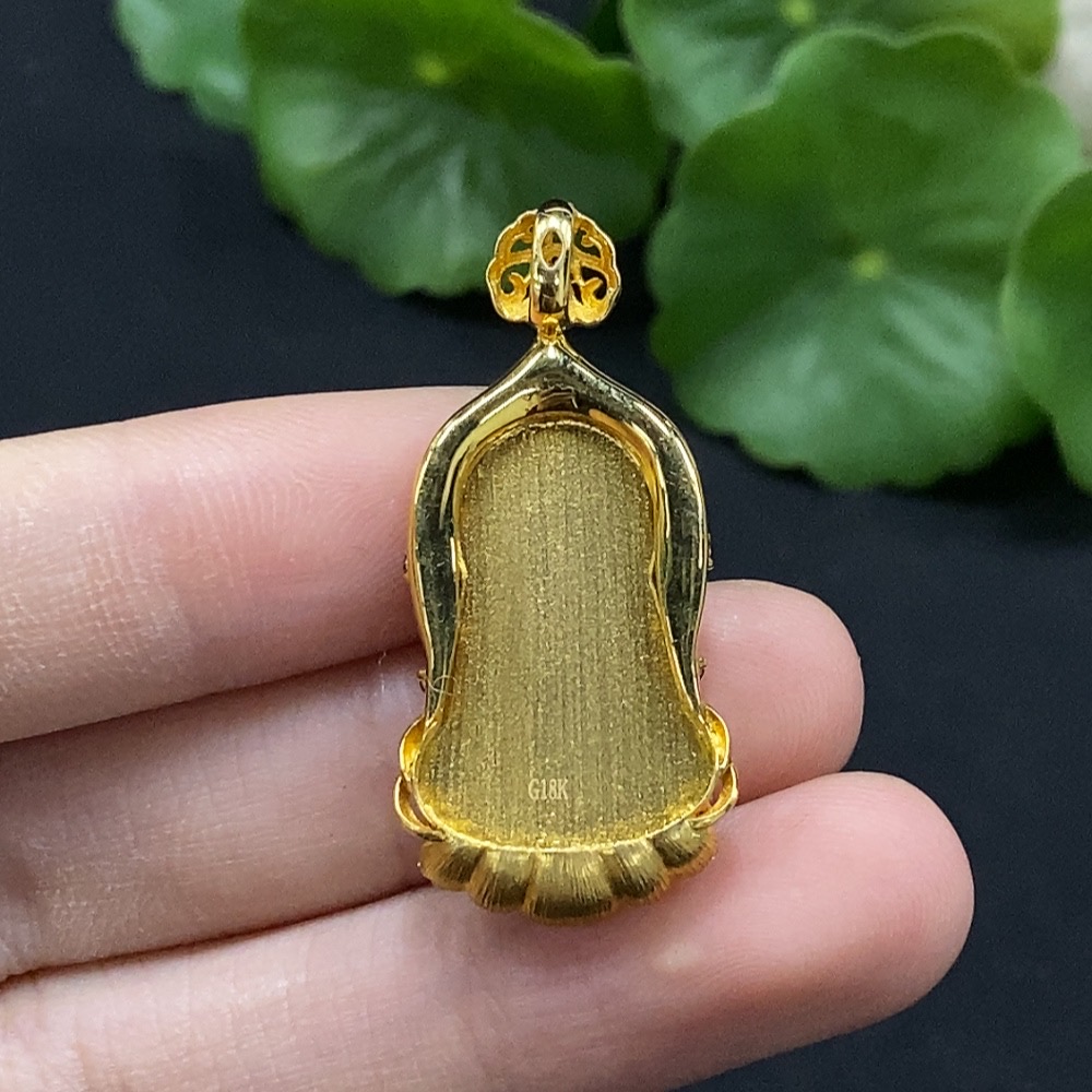 Jadeite Guanyin Inlaid Pendant No Stamp, 18K Gold Content Tested, Set with Colorless Diamonds, Total Weight Approximately 4.74g