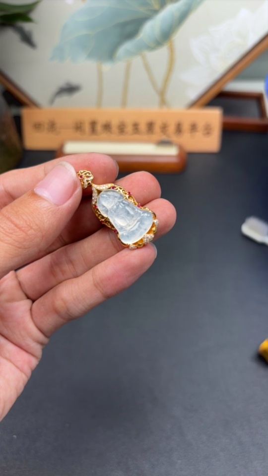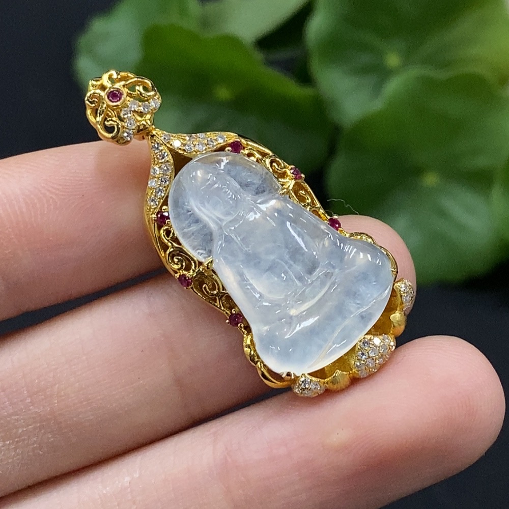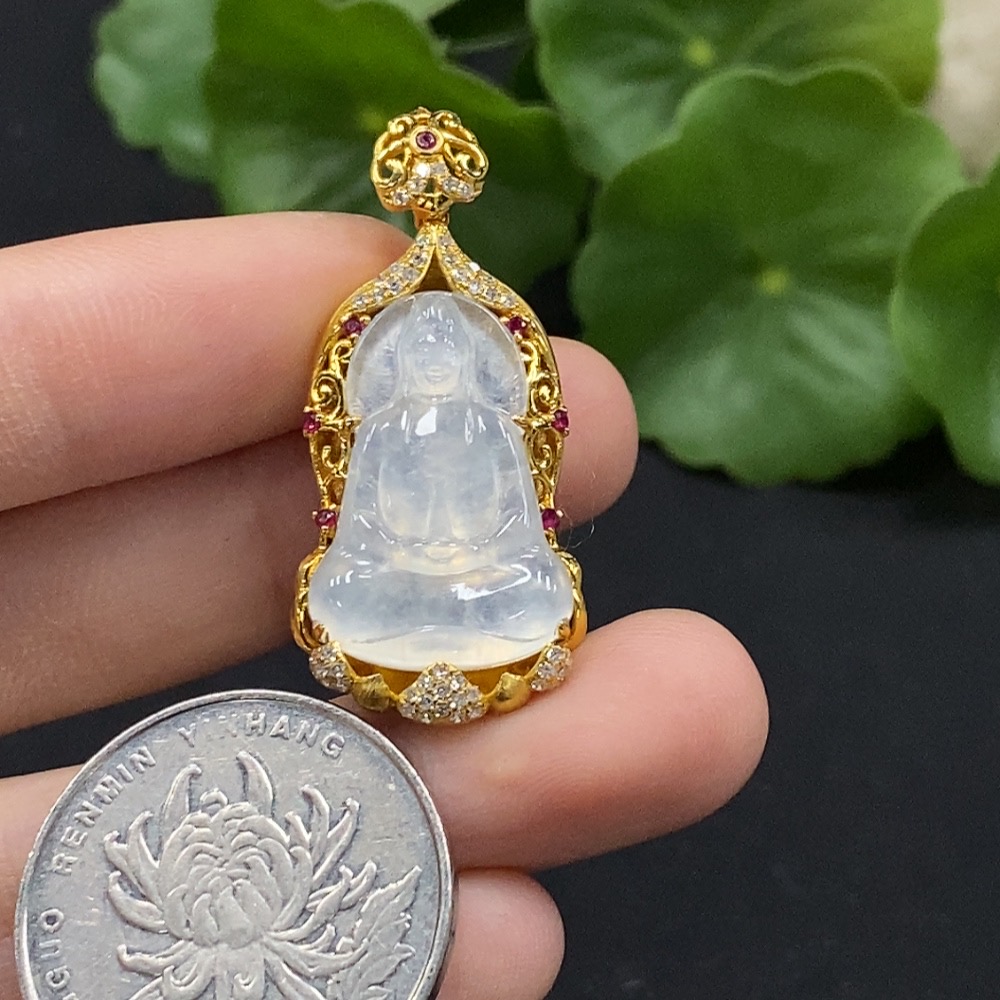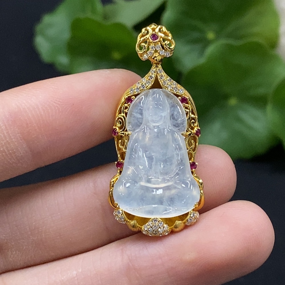Jadeite Guanyin Inlaid Pendant No Stamp, 18K Gold Content Tested, Set with Colorless Diamonds, Total Weight Approximately 4.74g