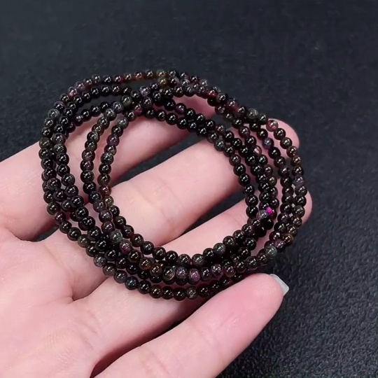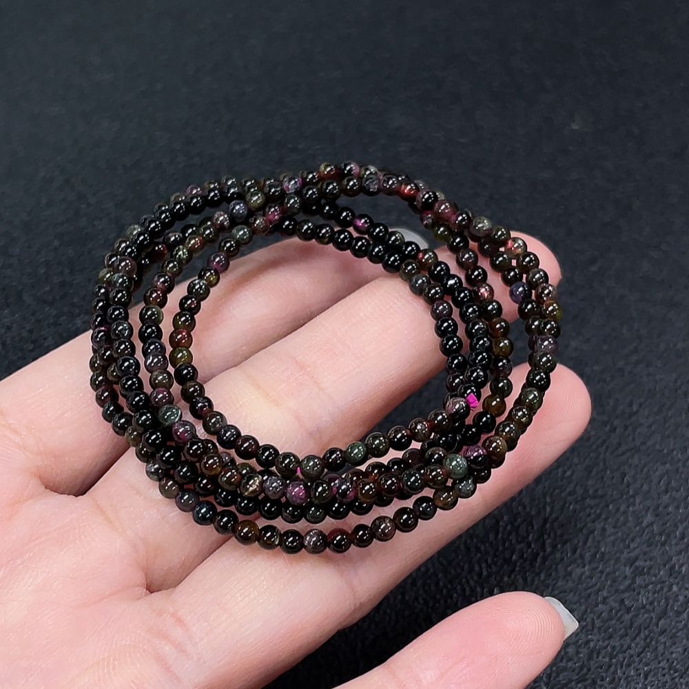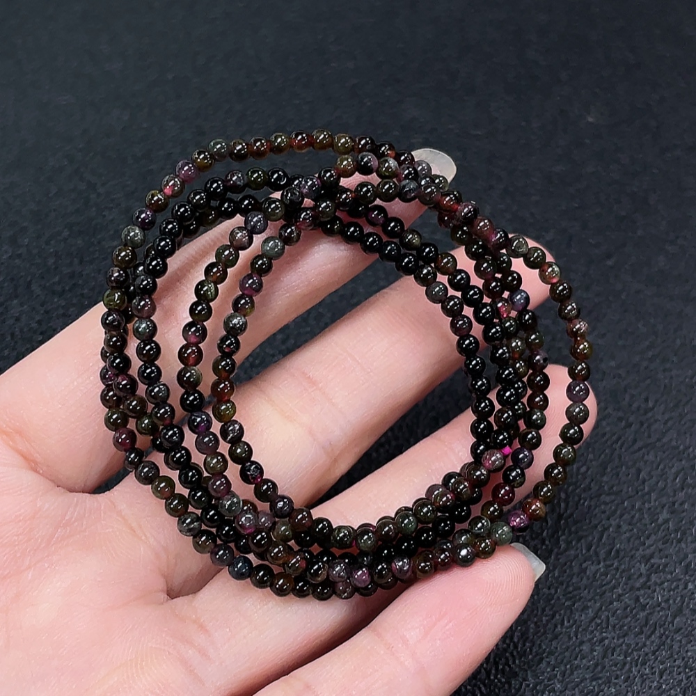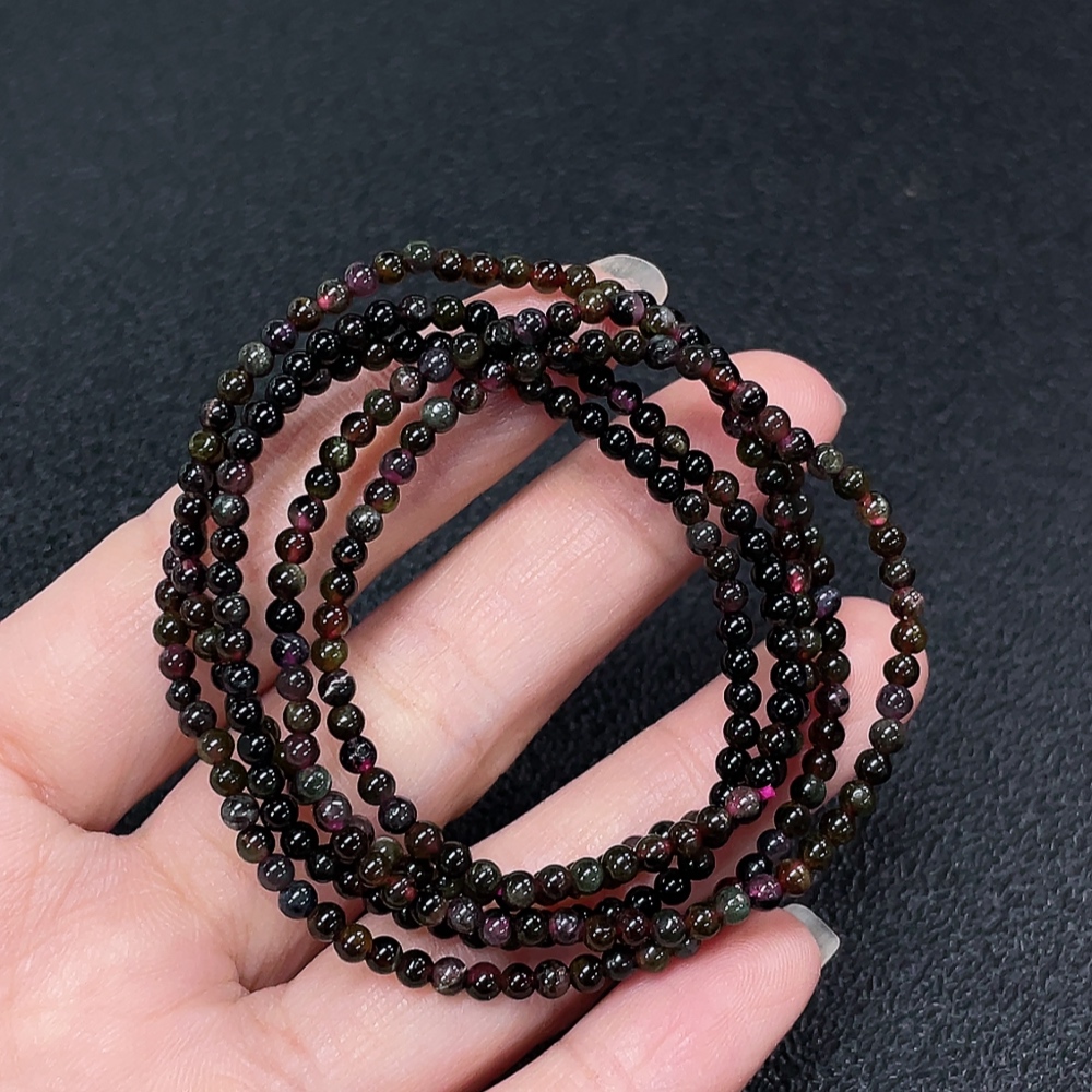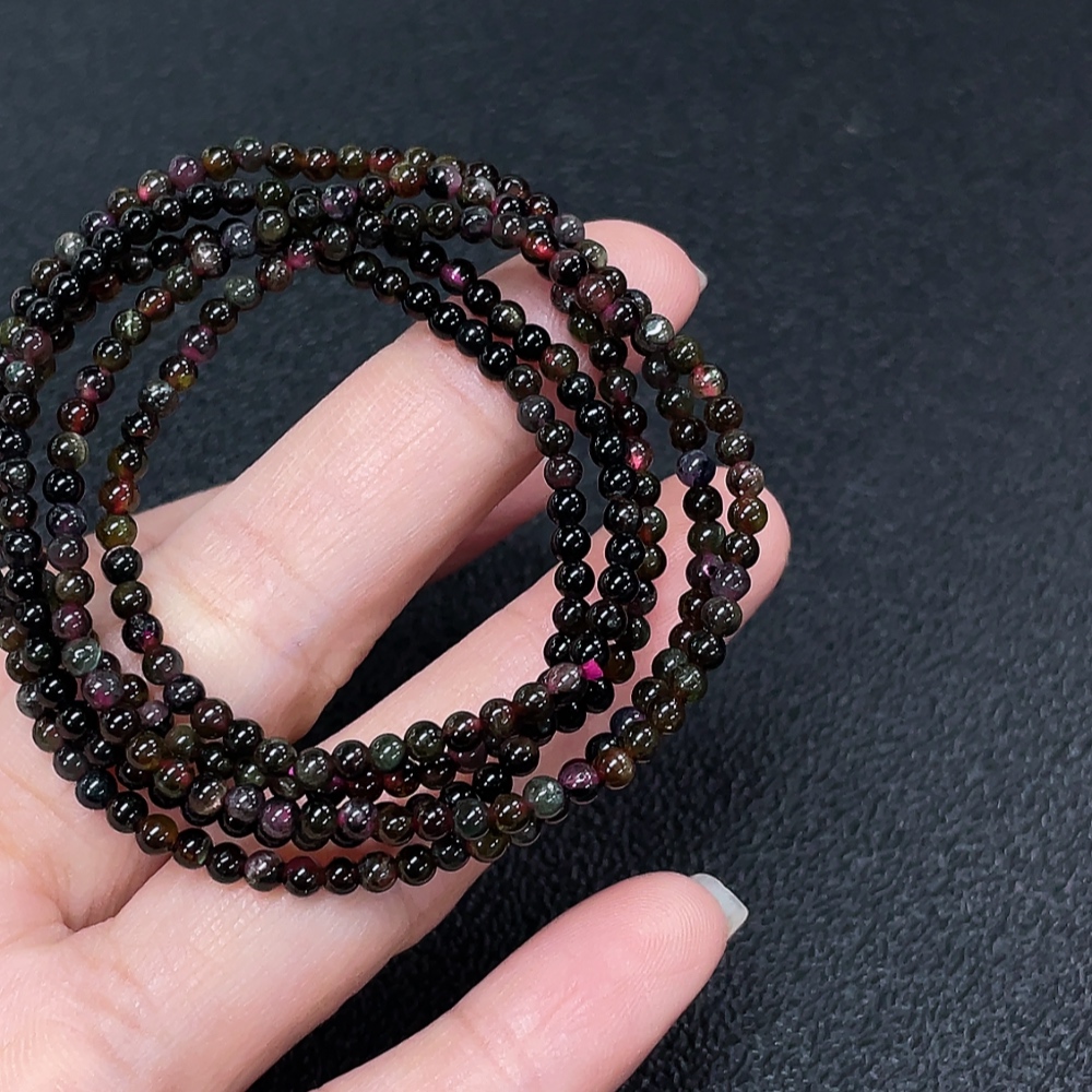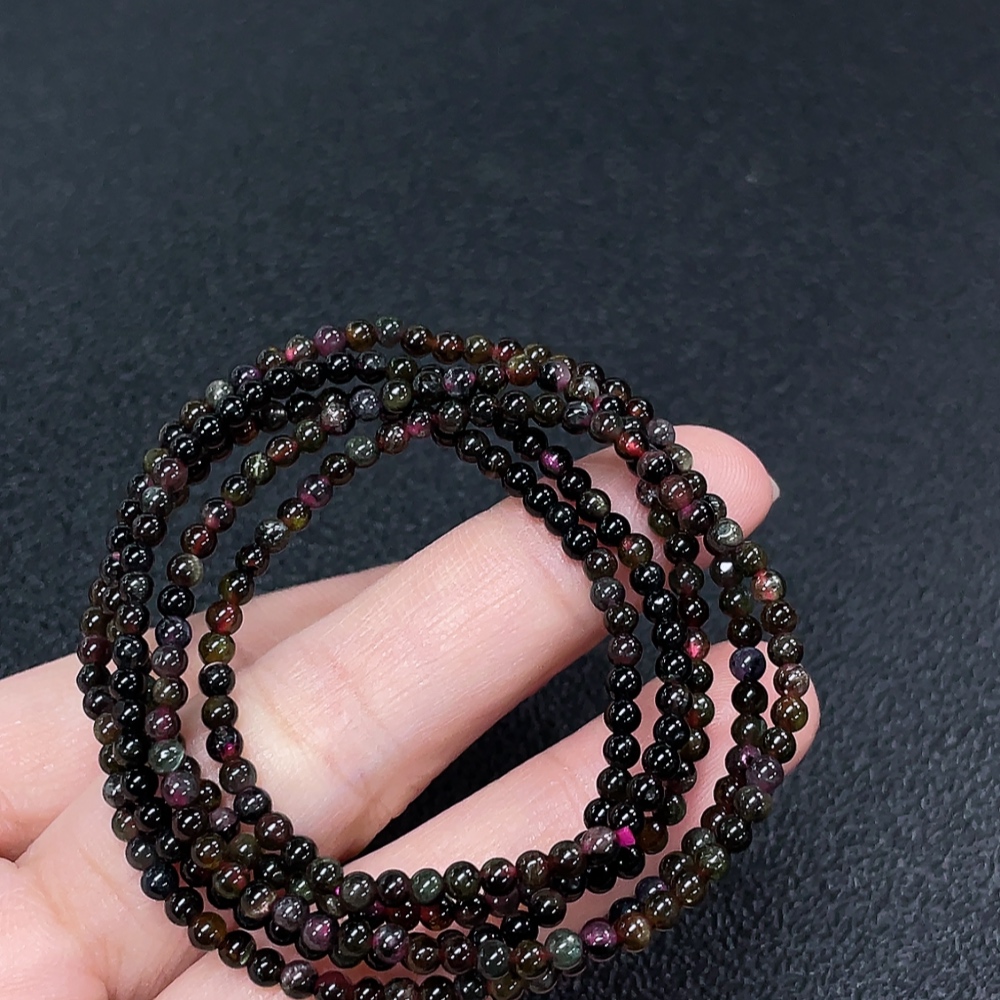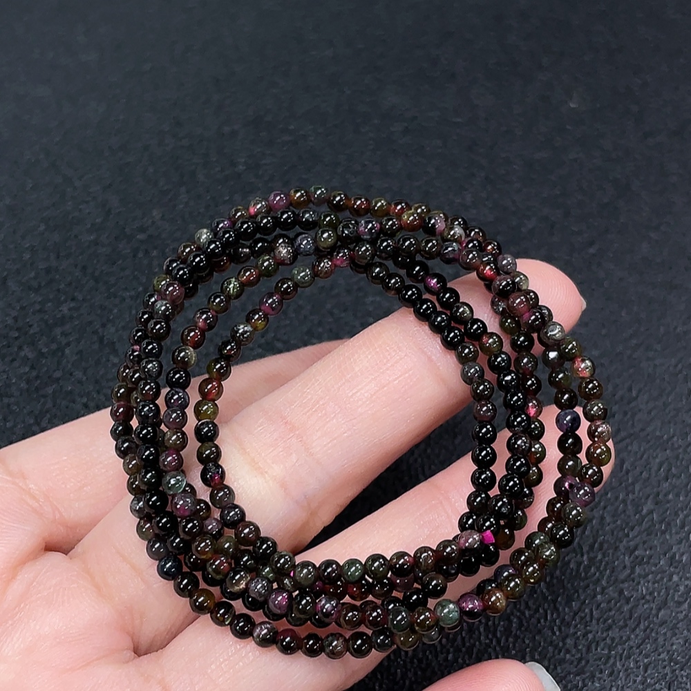 Tourmaline bead strand containing other mineral components with visible organic matter, total weight approximately 9.5g, size about 2.7mm