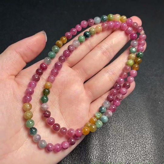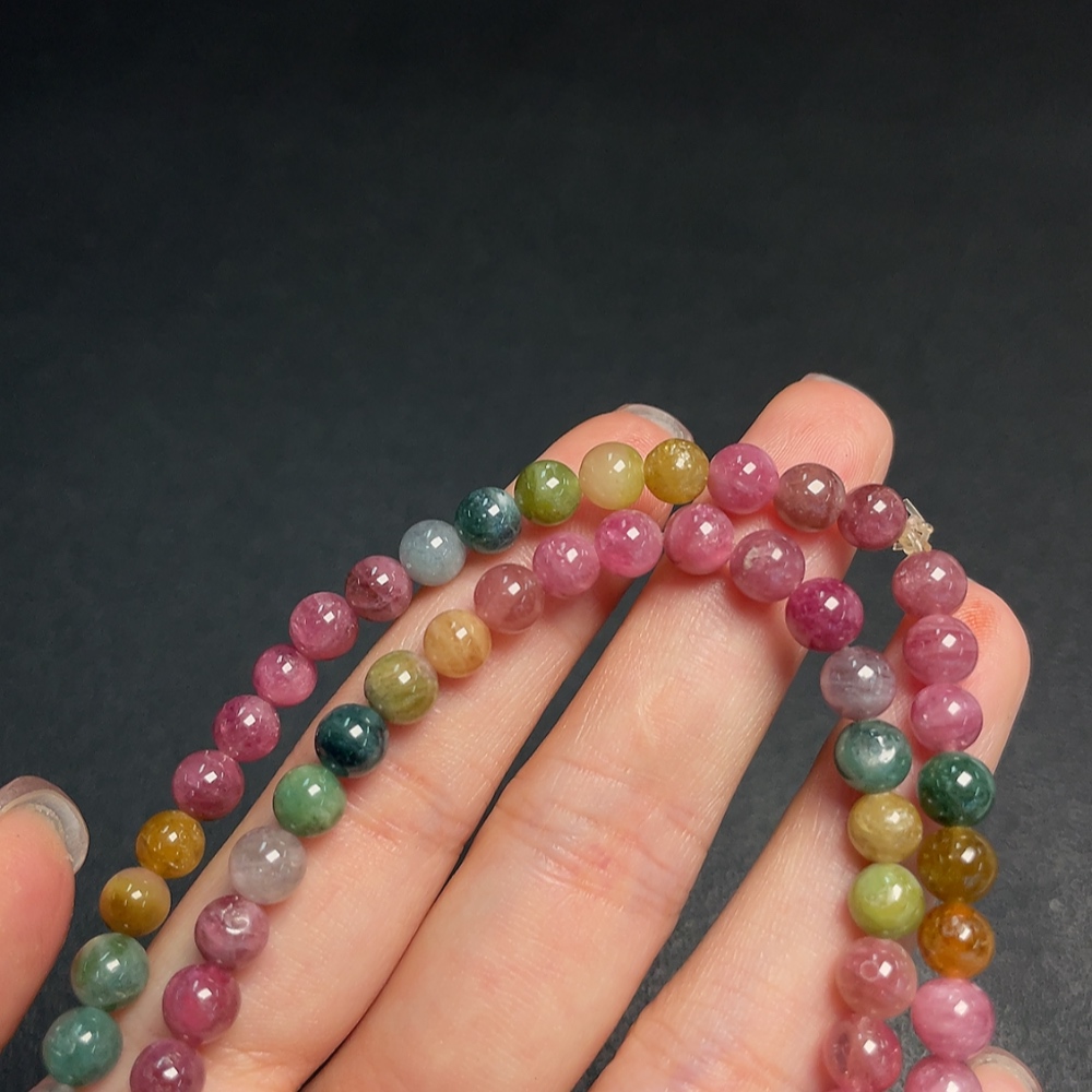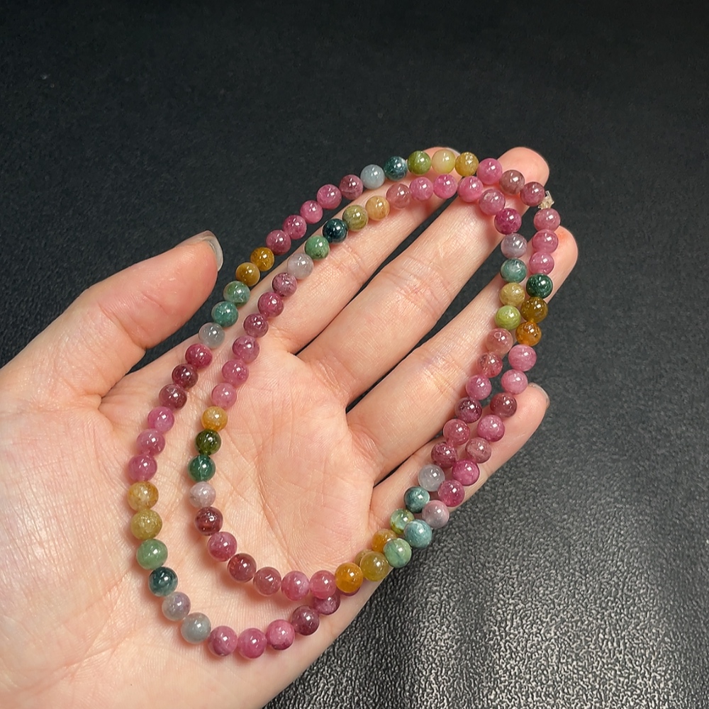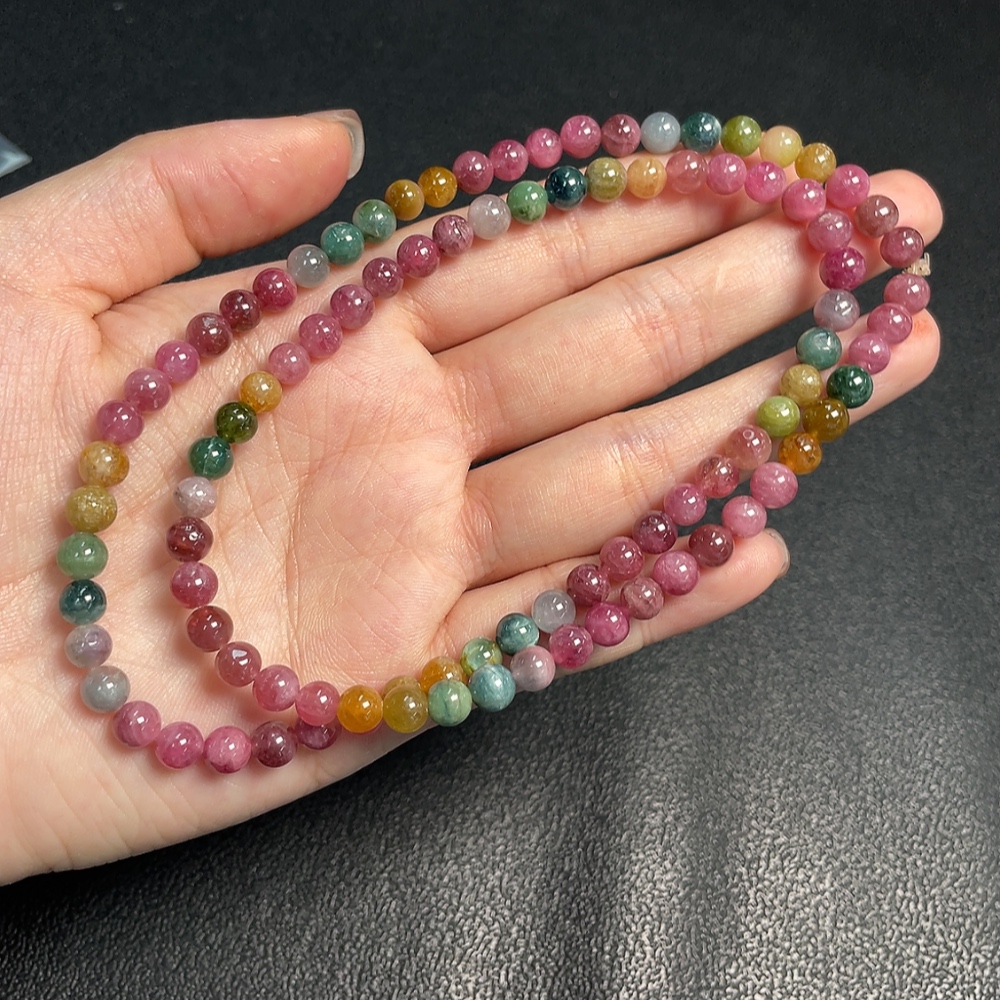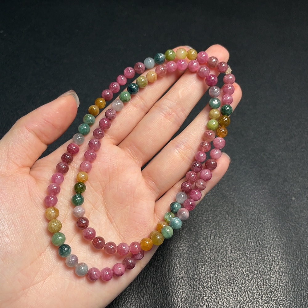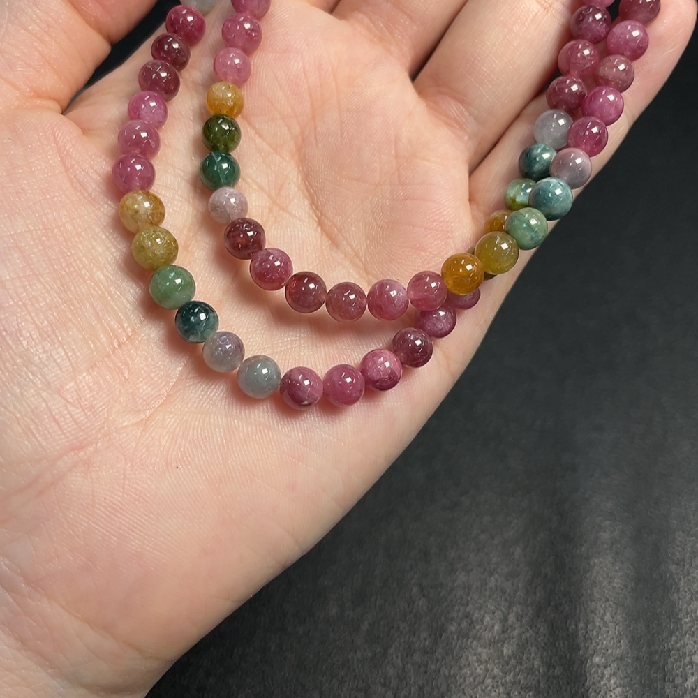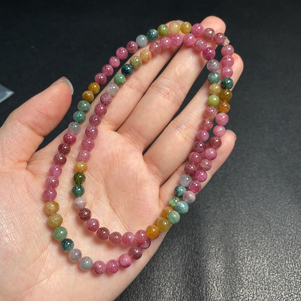 Tourmaline bead necklace with other mineral components and visible organic matter, total weight approx. 28.11g, bead size approx. 5.7mm