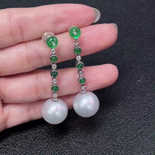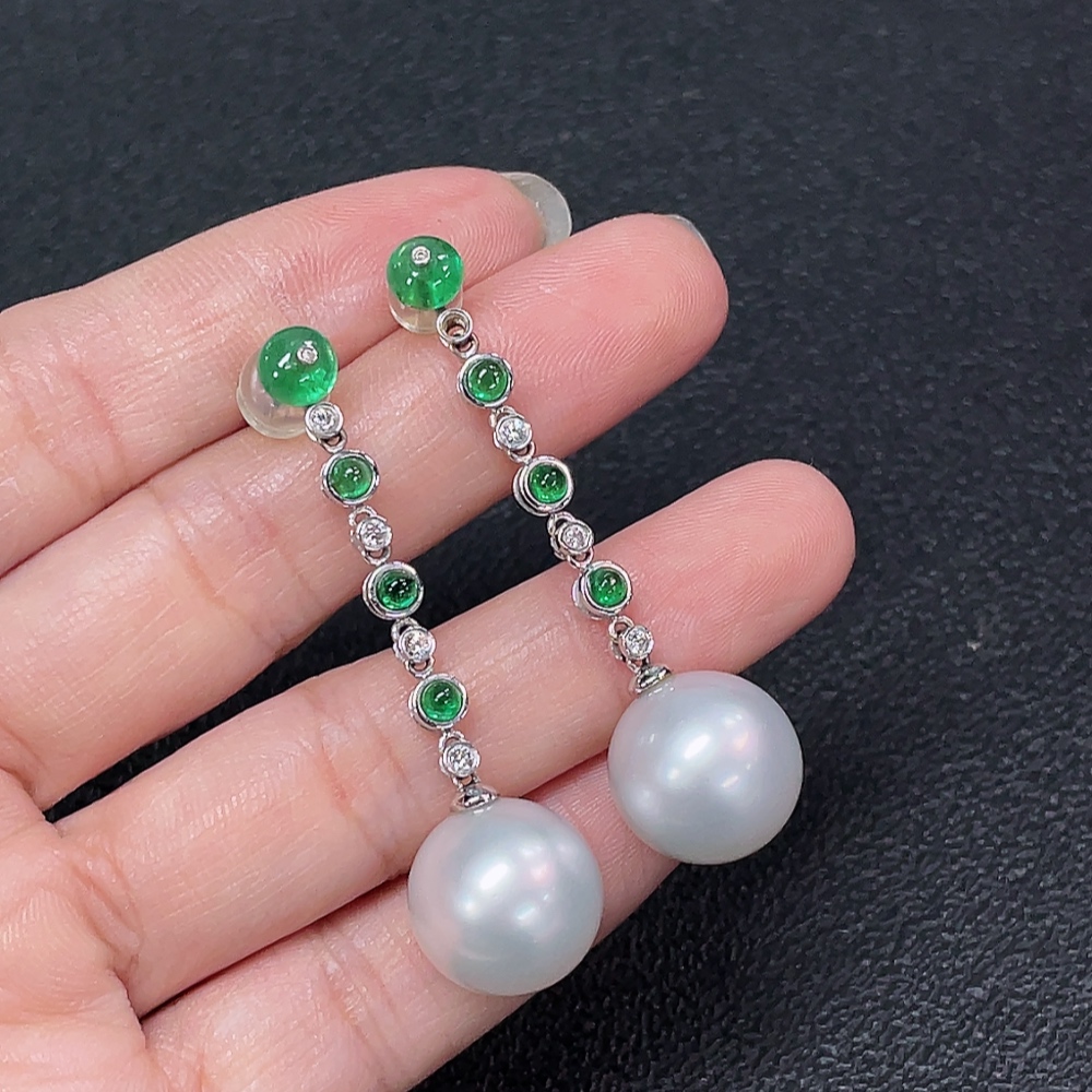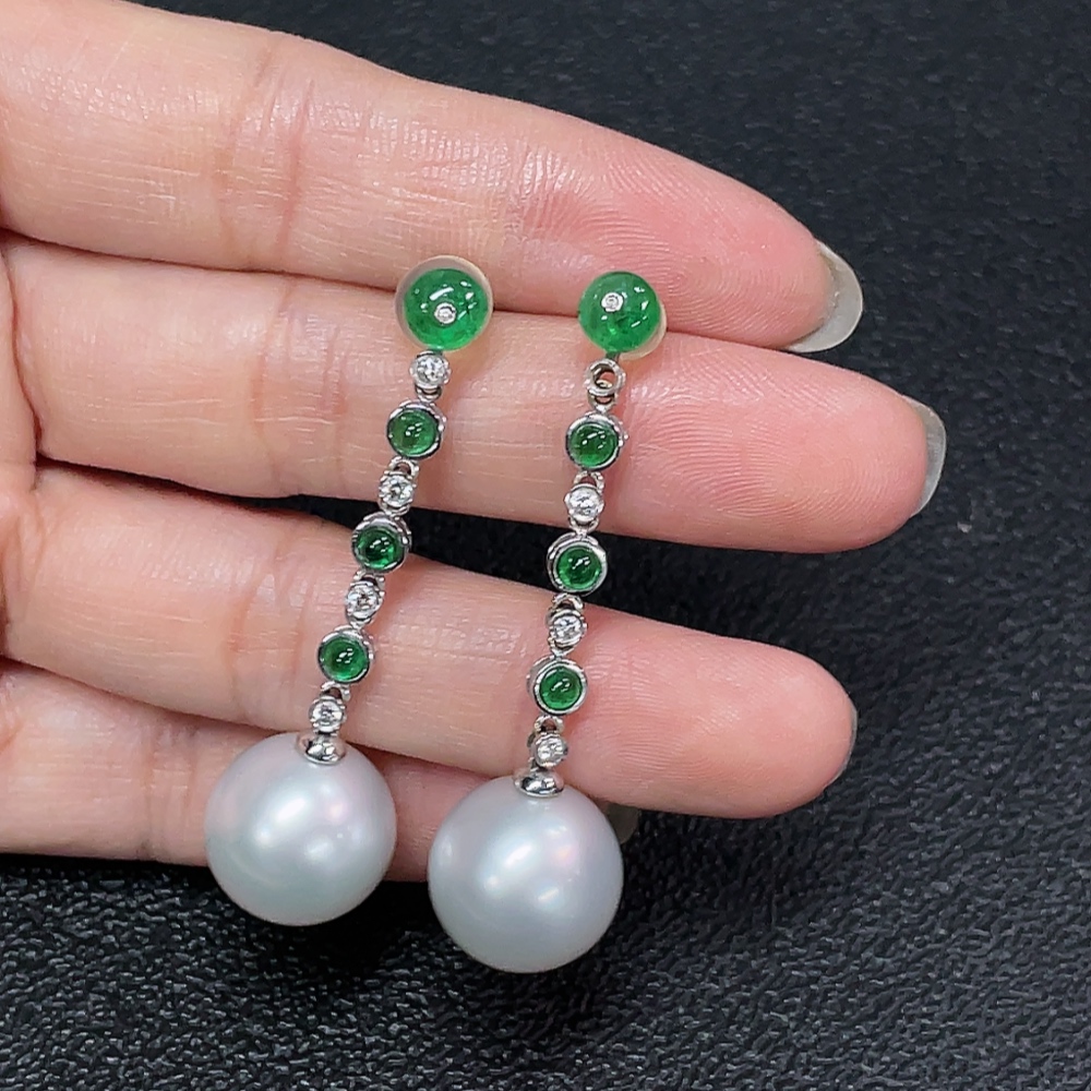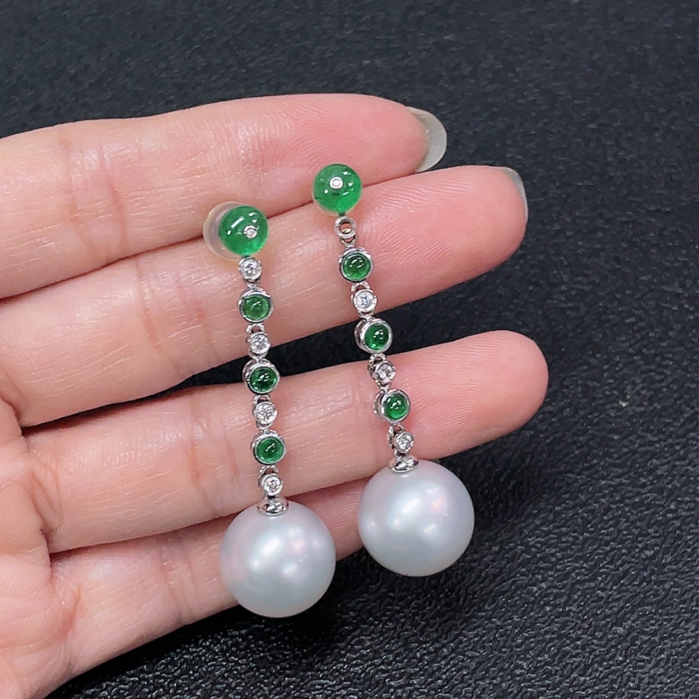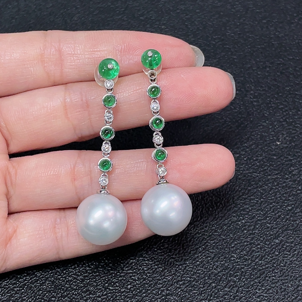 18K Sea Water Pearl Earrings with Emerald and Diamond Accents, Total Weight Approx. 10.87g, Size About 13.7mm