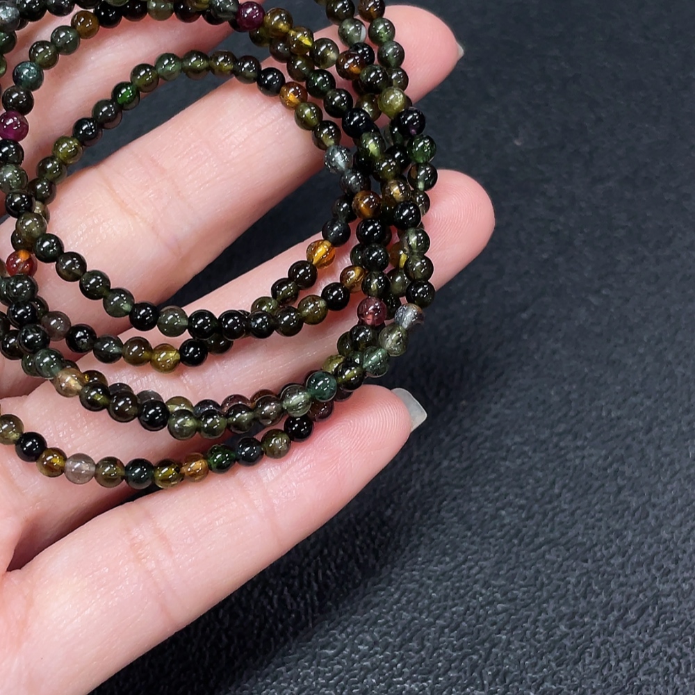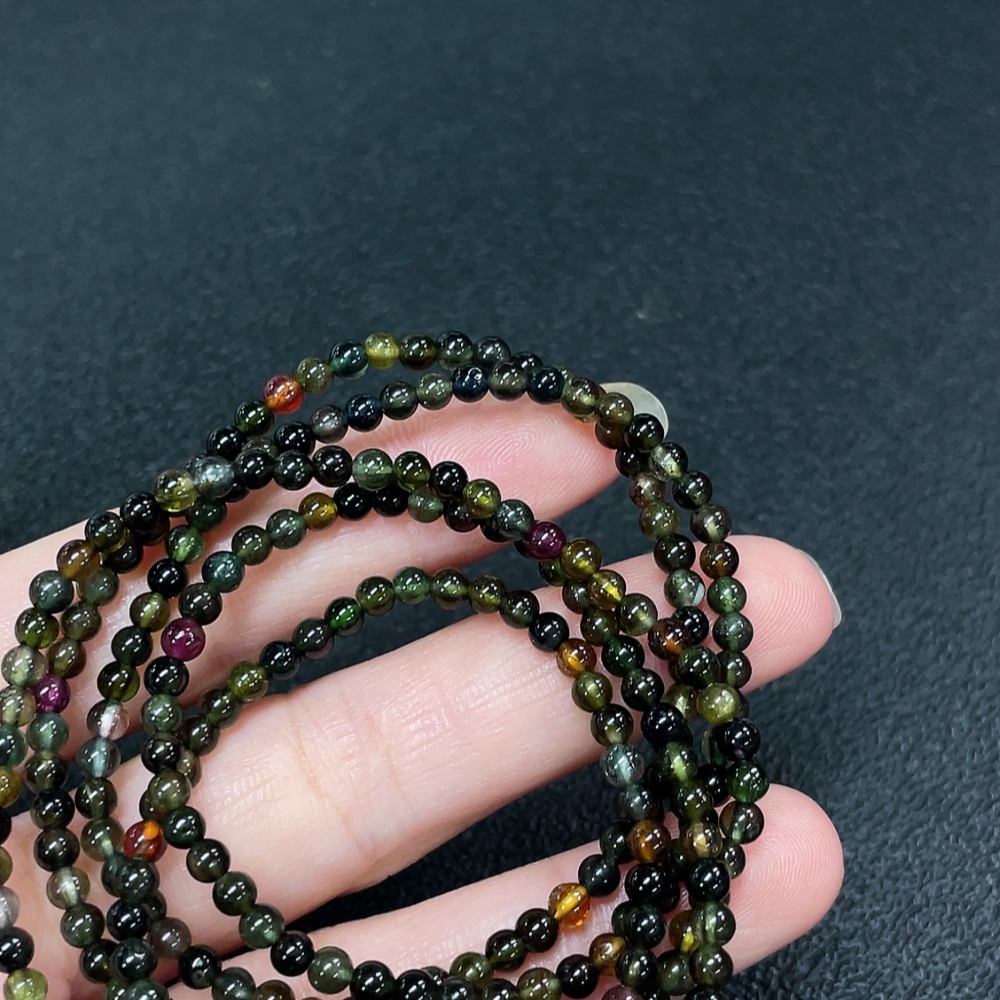 Tourmaline bead strand with other mineral components, visible organic matter, non-natural accent stones, total weight approx. 13.63g, size ~3.2mm (including impurities)