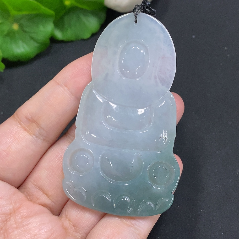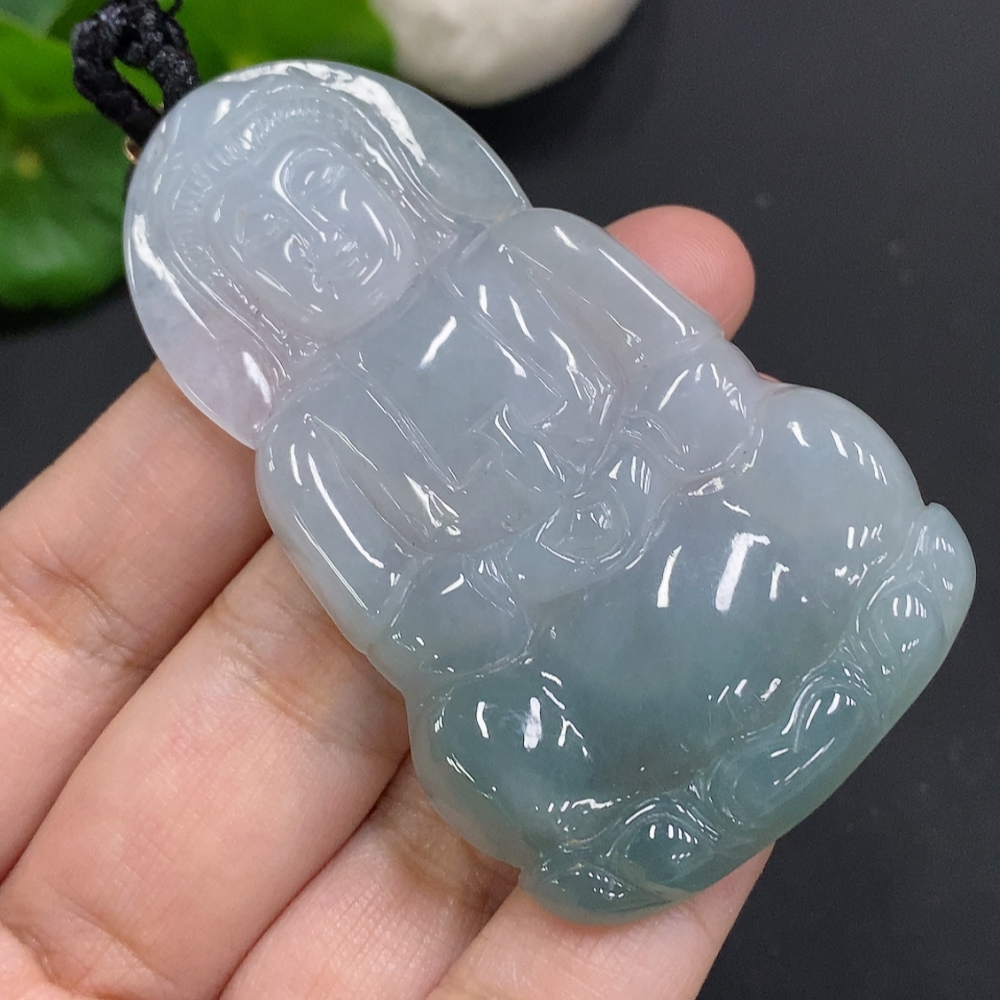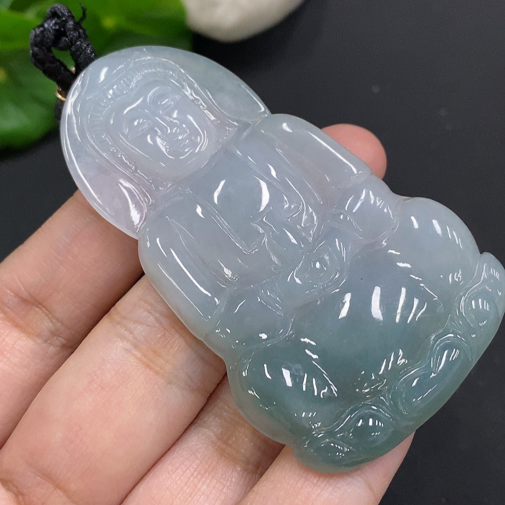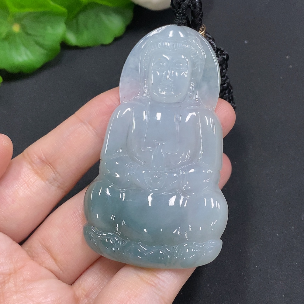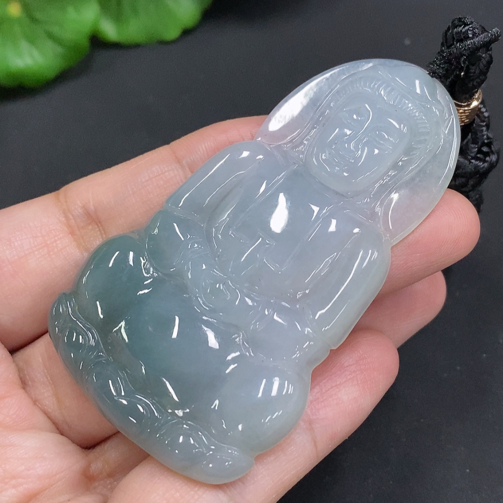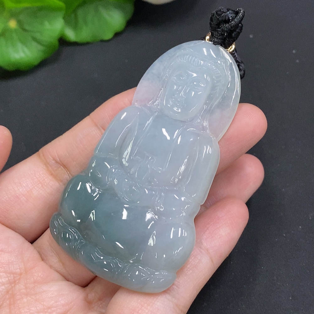 Jadeite Guanyin Pendant, Total Weight Including Rope Approximately 33.9g