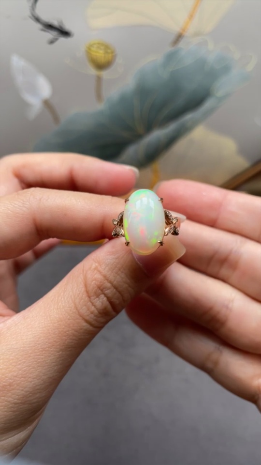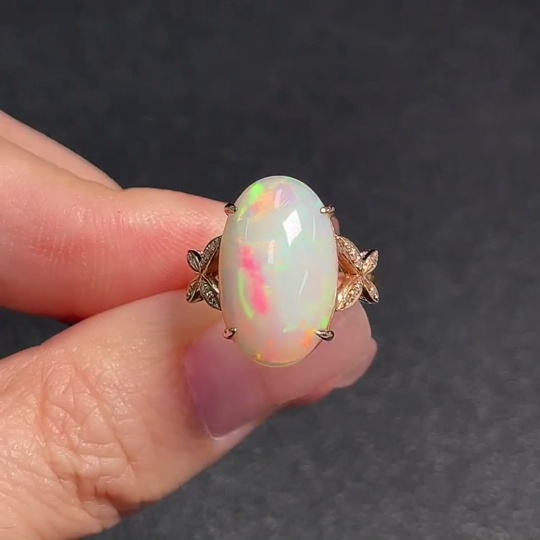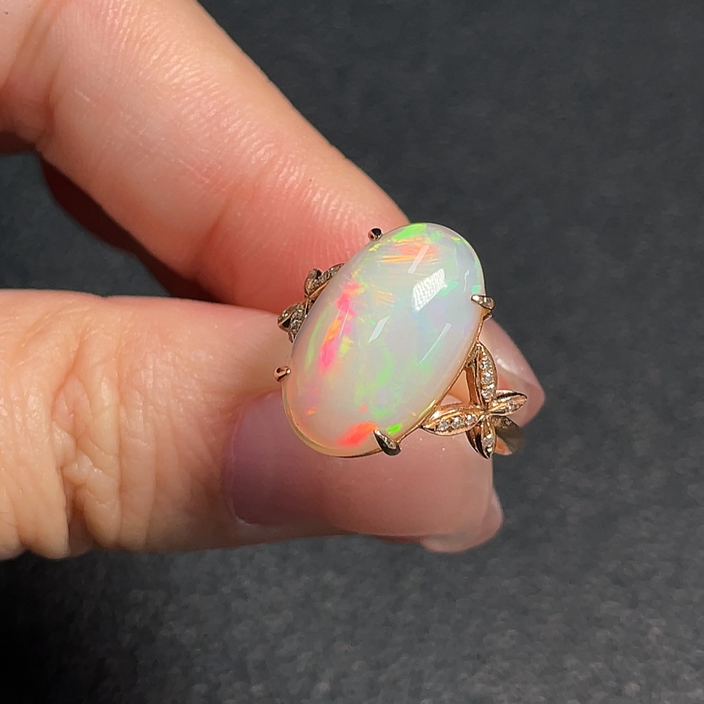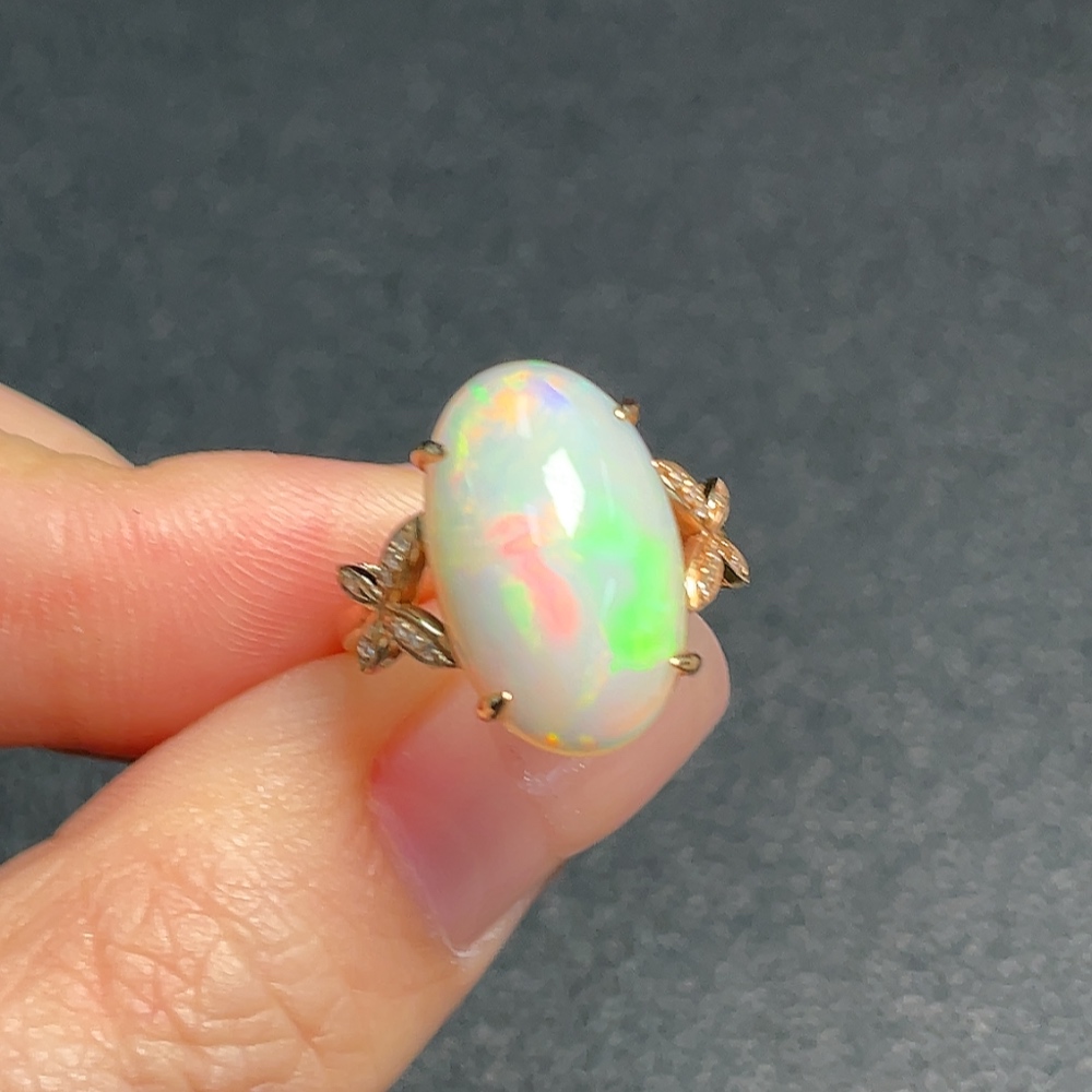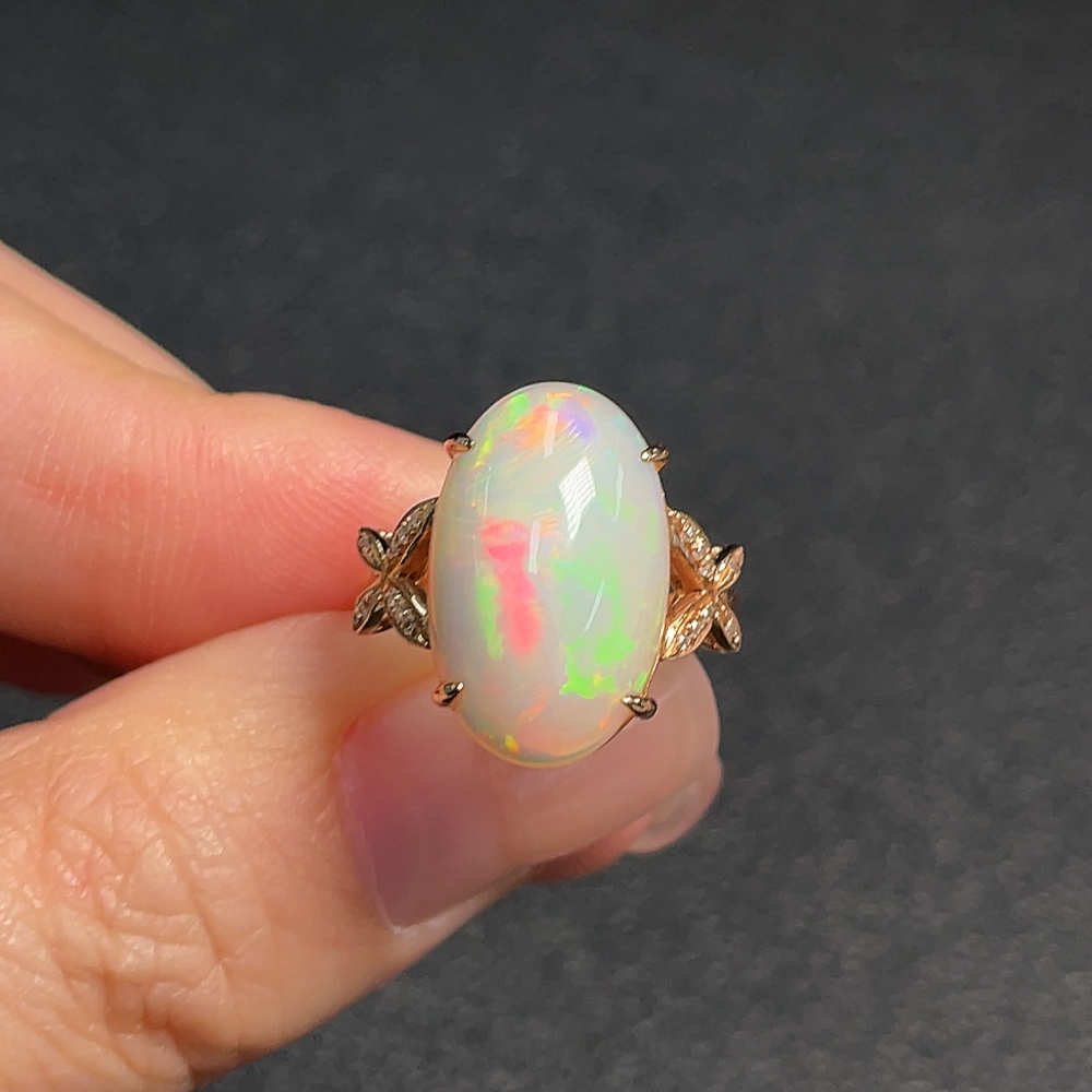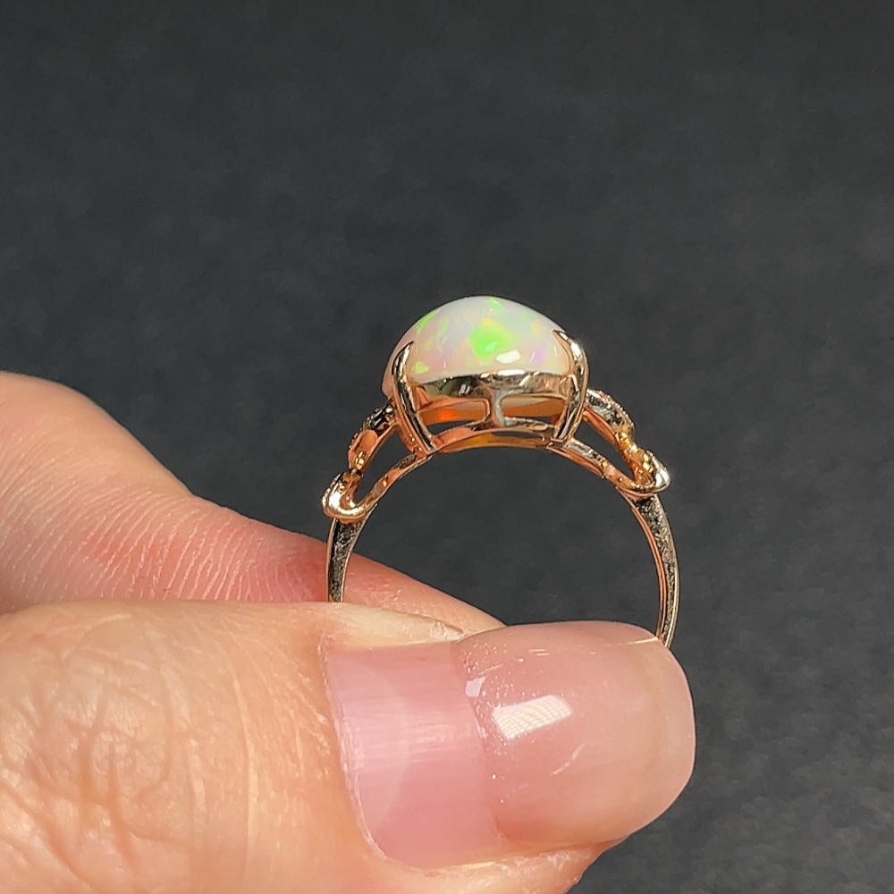 Opal ring with diamond accents, 73% gold content, total weight approximately 3 grams, size 11