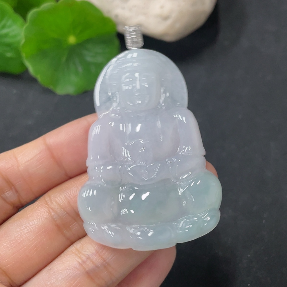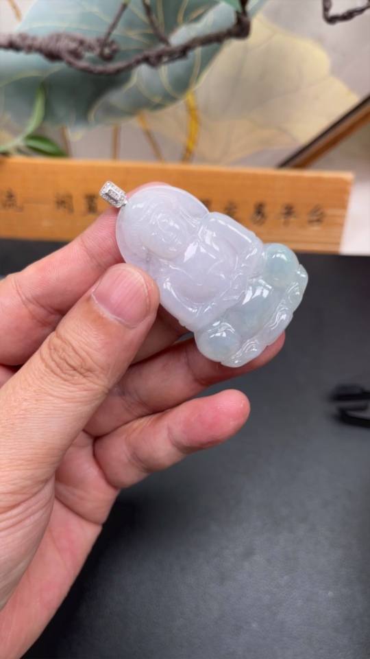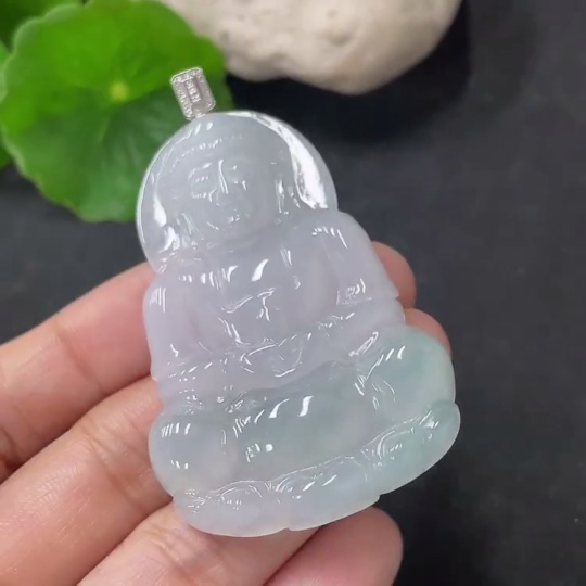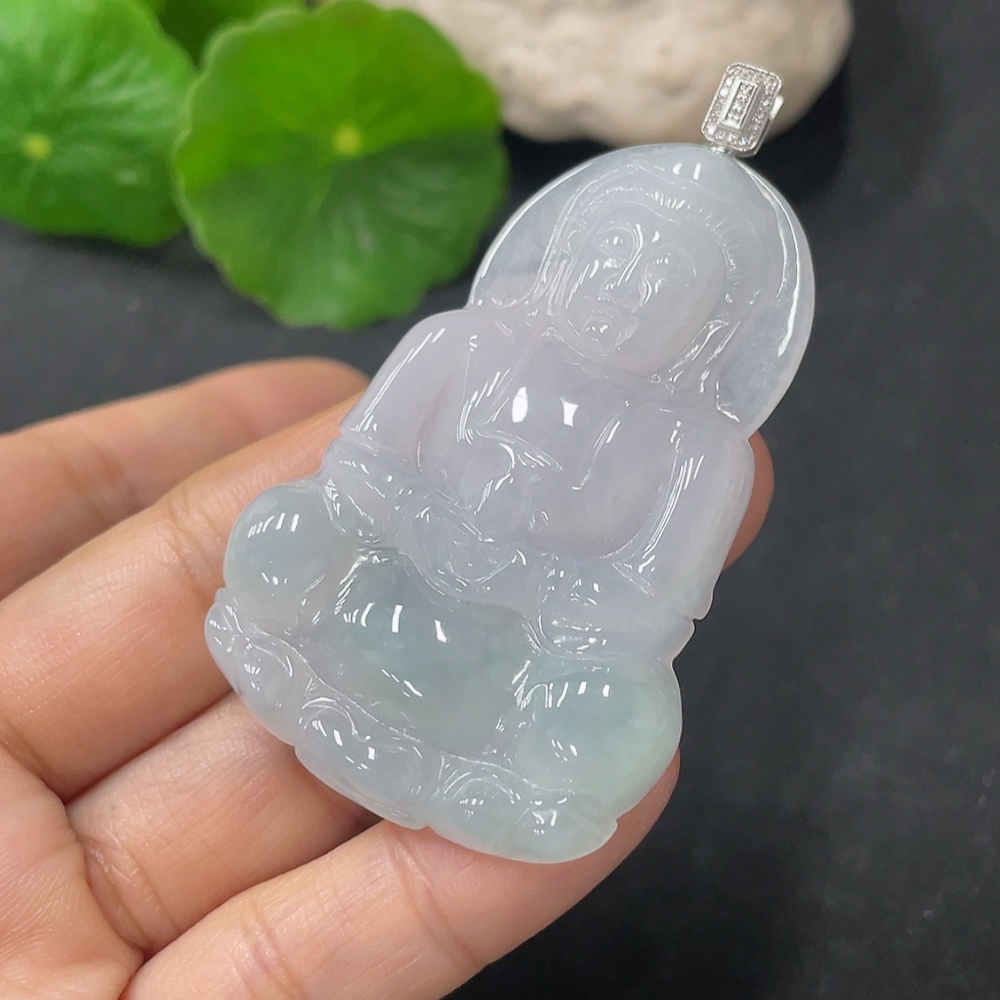 Jadeite Guanyin Pendant, Total Weight Approx. 18.6g, 18K Gold Clasp, Diamond Accents