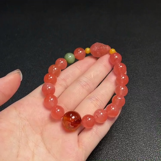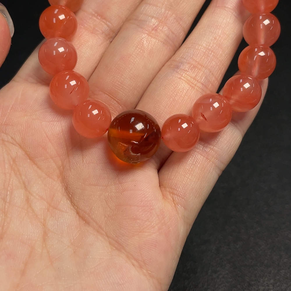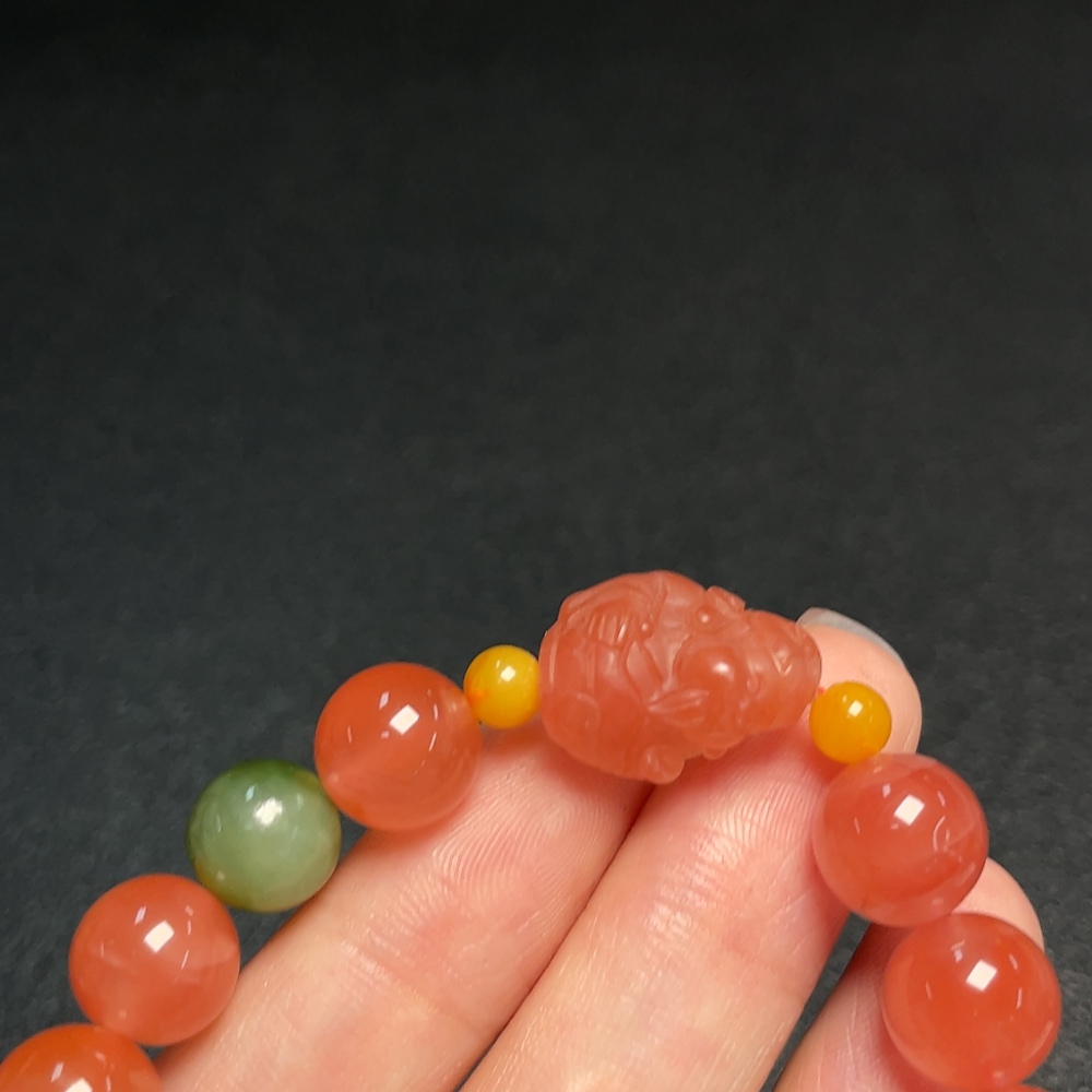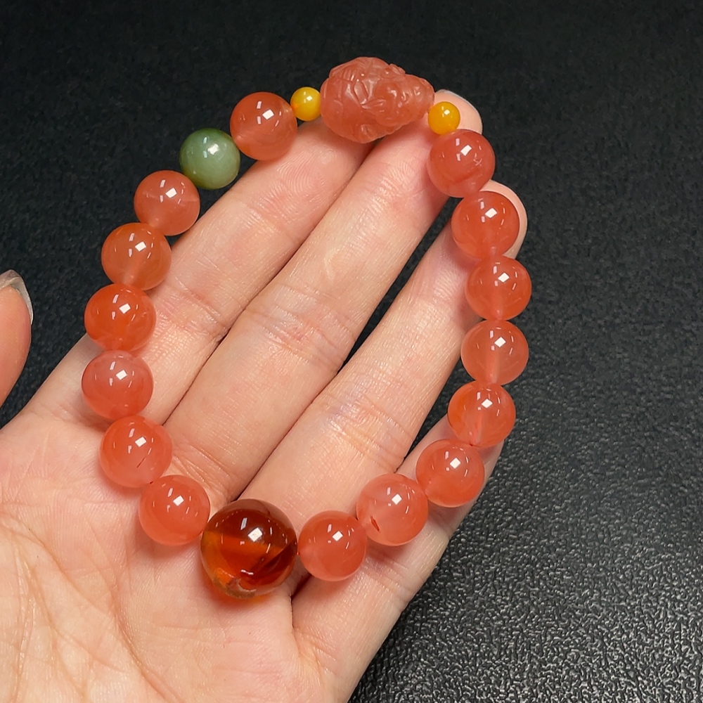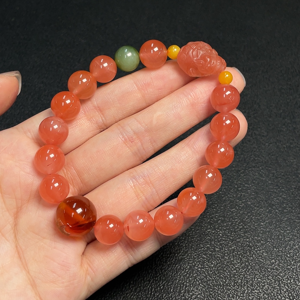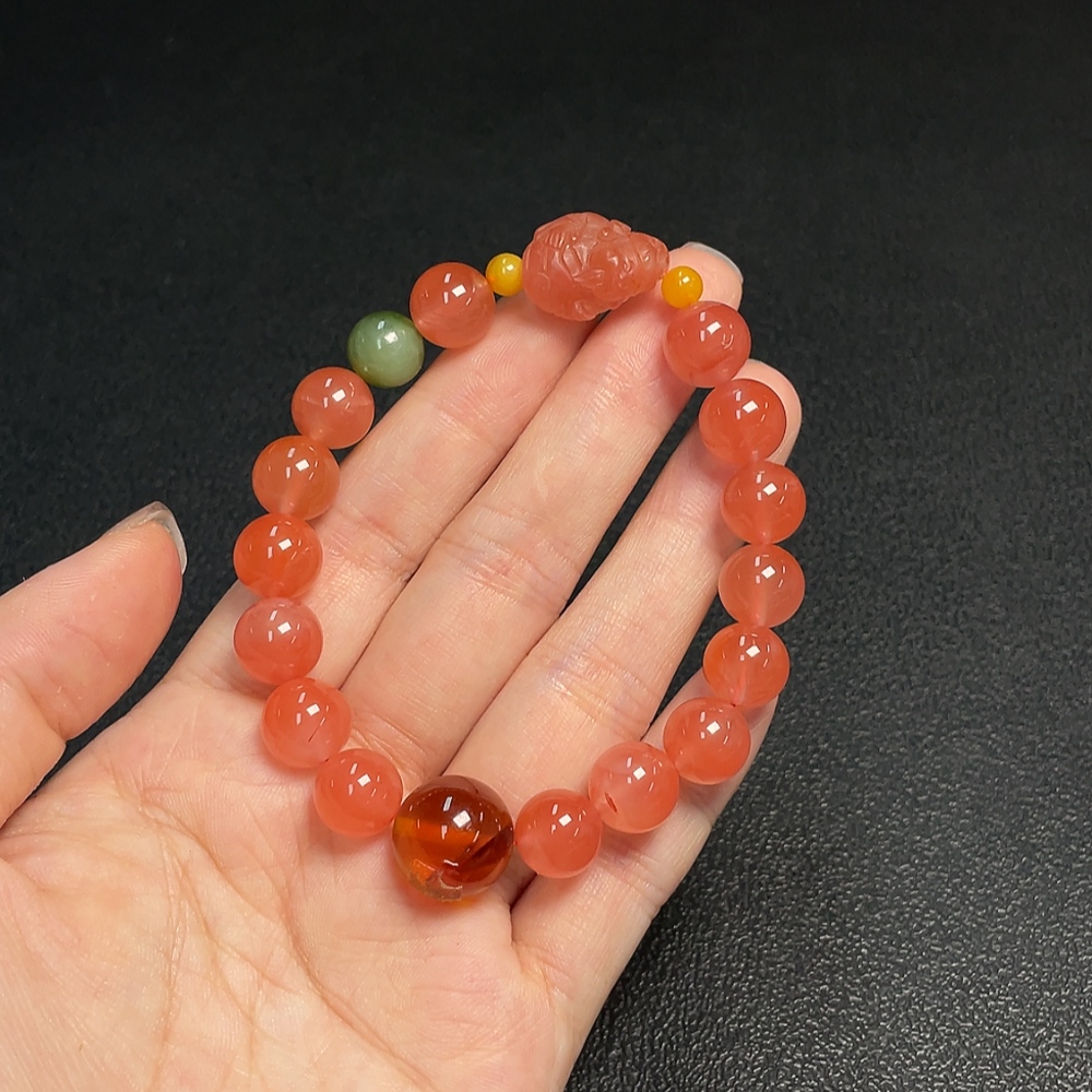 Red Agate Bracelet with Visible Organic Matter, Total Weight Approx. 28.33g, Size 10mm, Paired with Hetian Jade and Amber