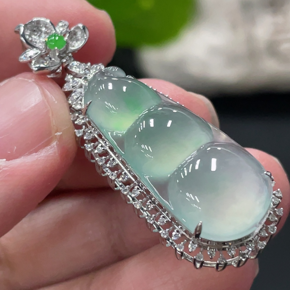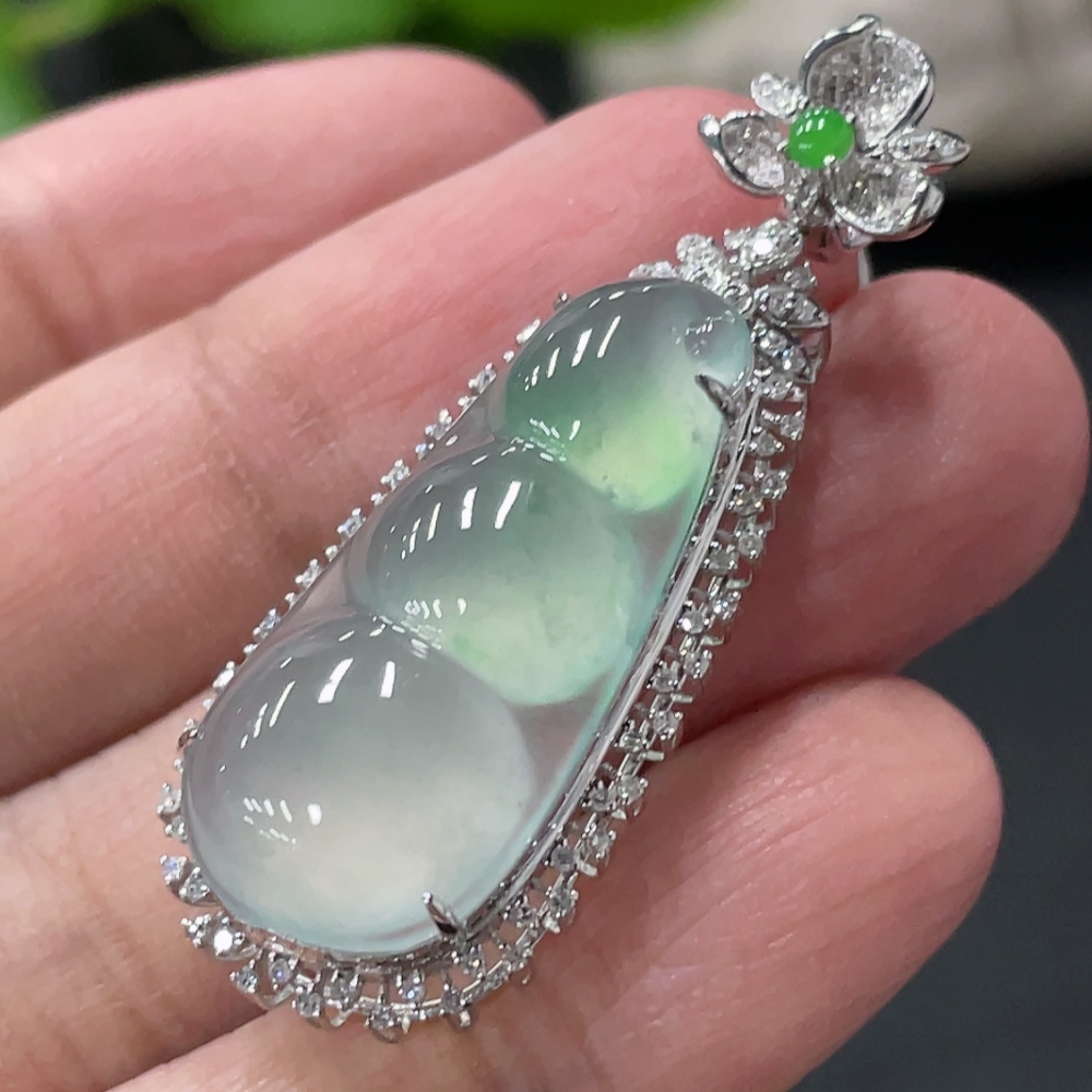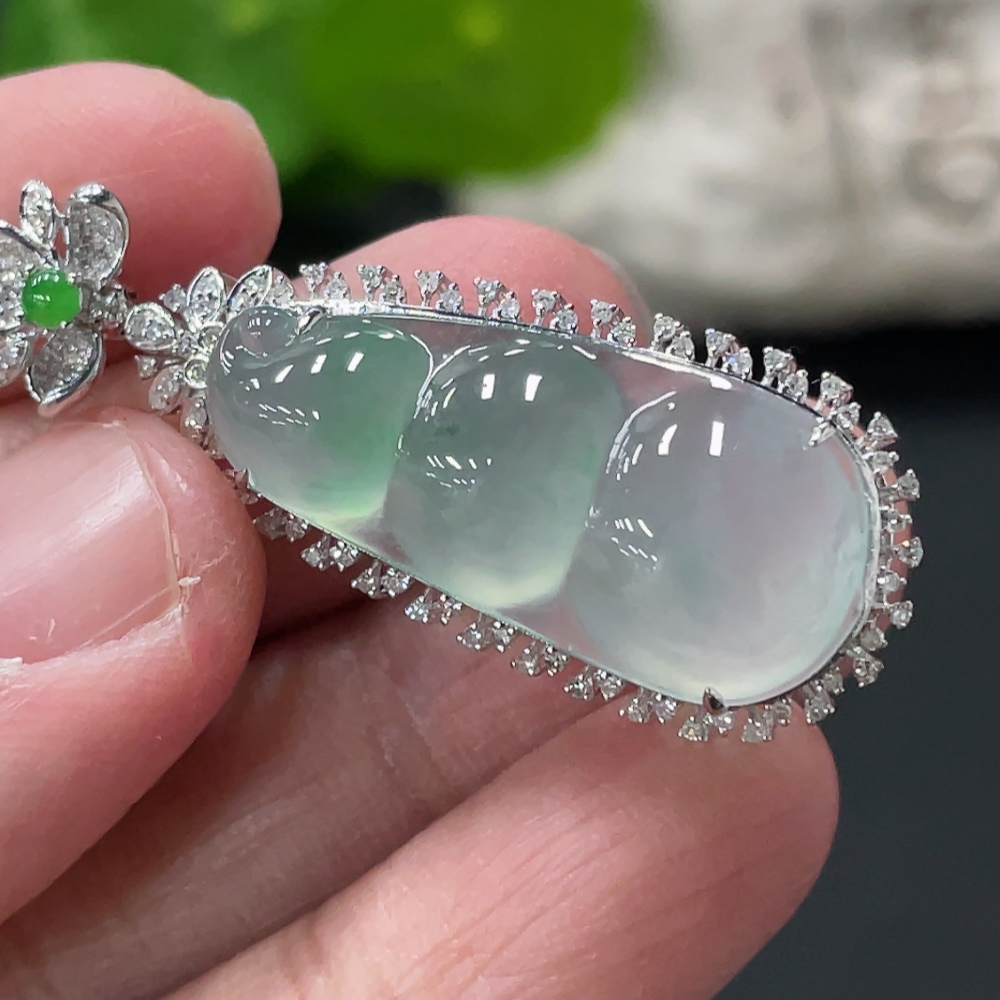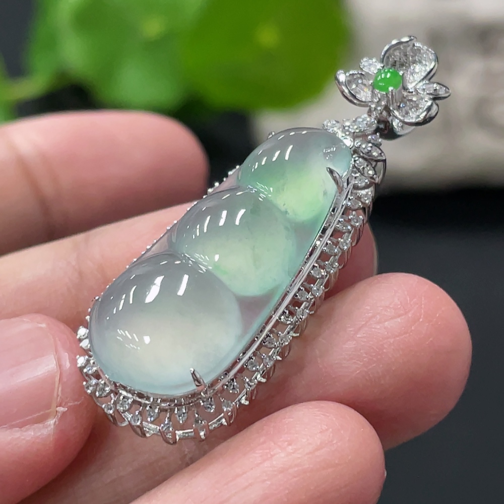 Jadeite Lucky Bean Pendant with 18K Gold and Diamond Accents, Total Weight Approx. 5.48g